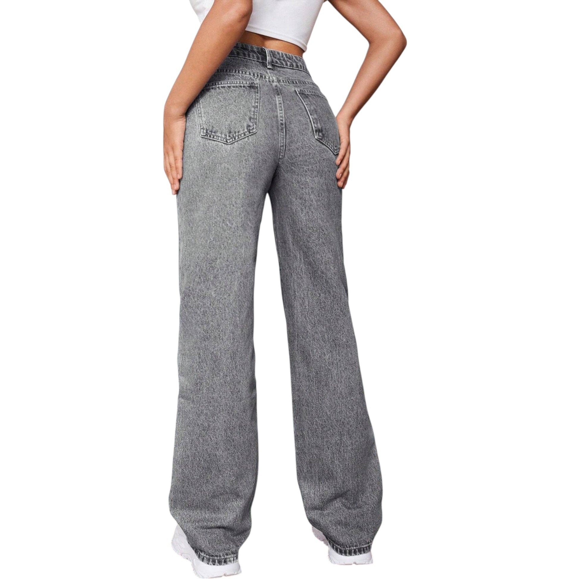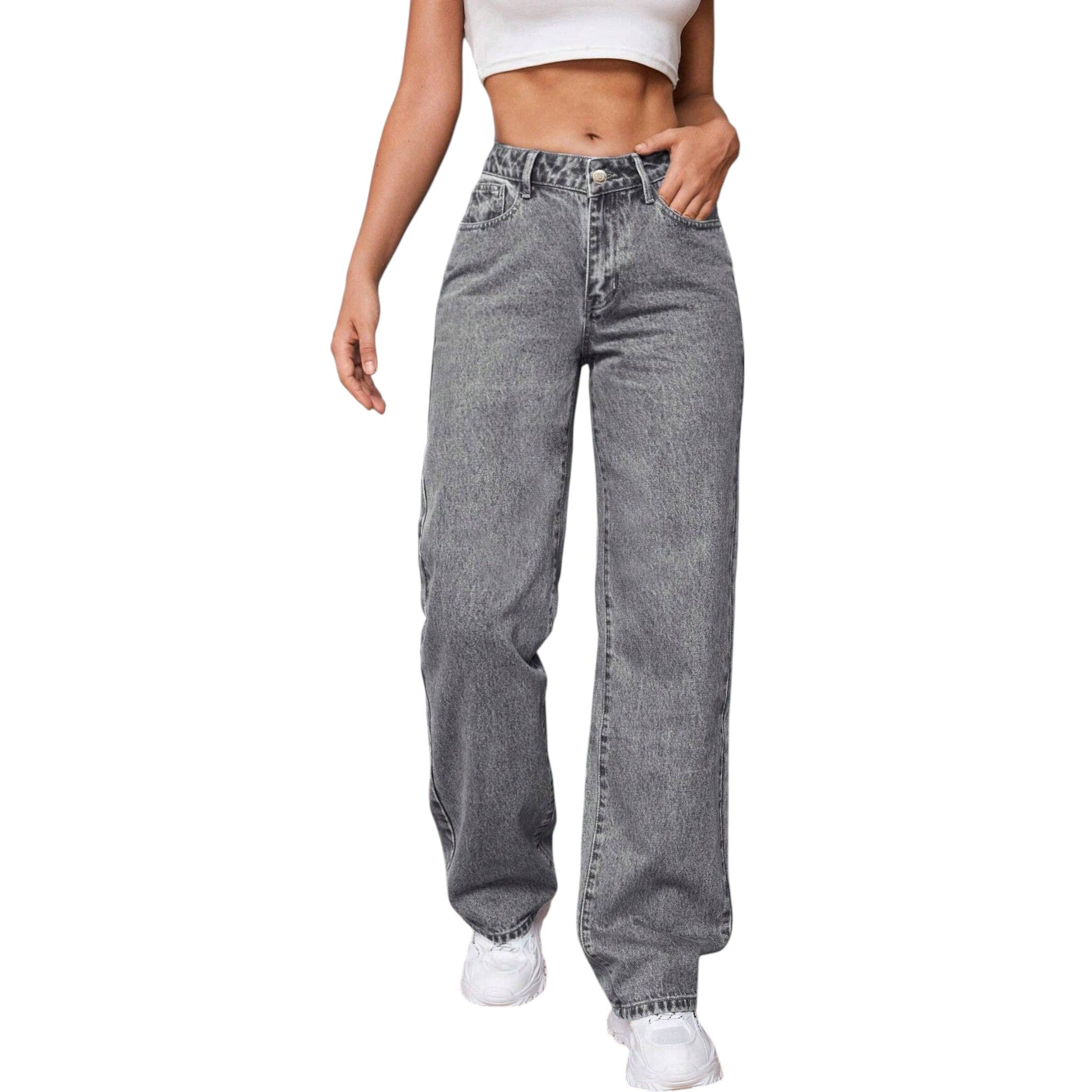 Címke nélküli, szürke, magas derekú, egyenes bő szárú fazon, elöl cipzárral.