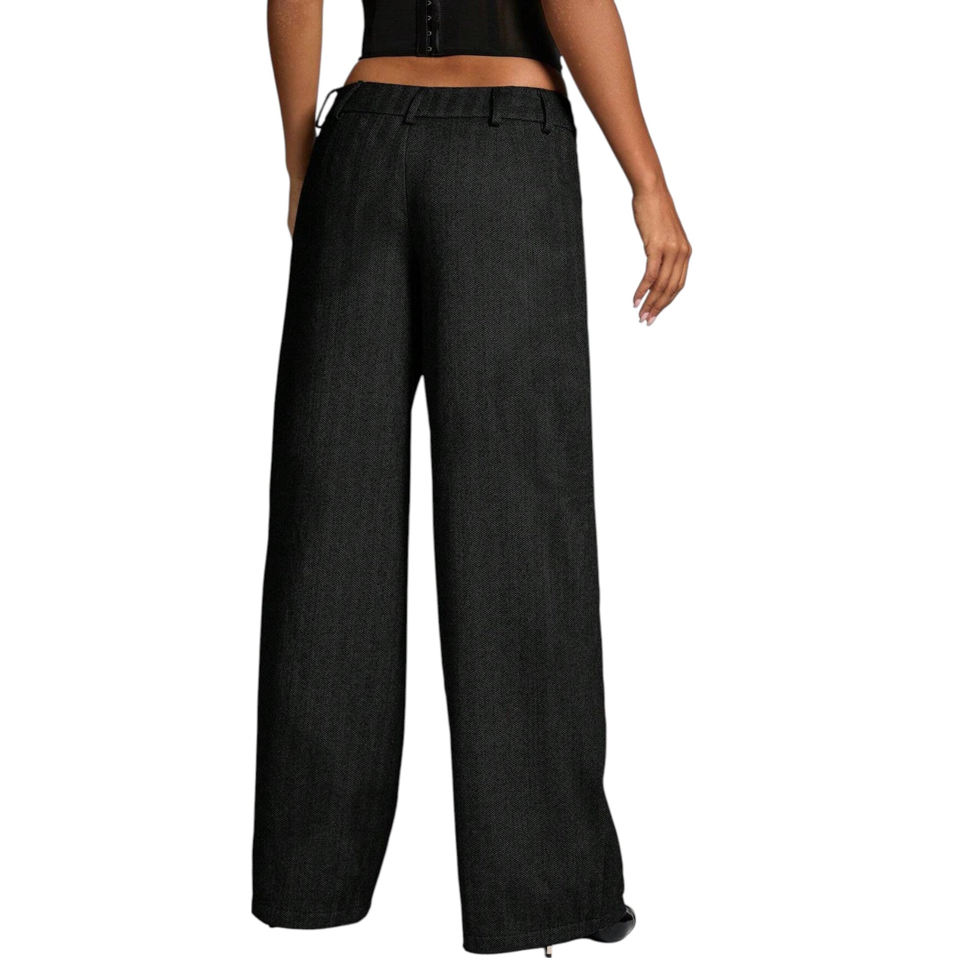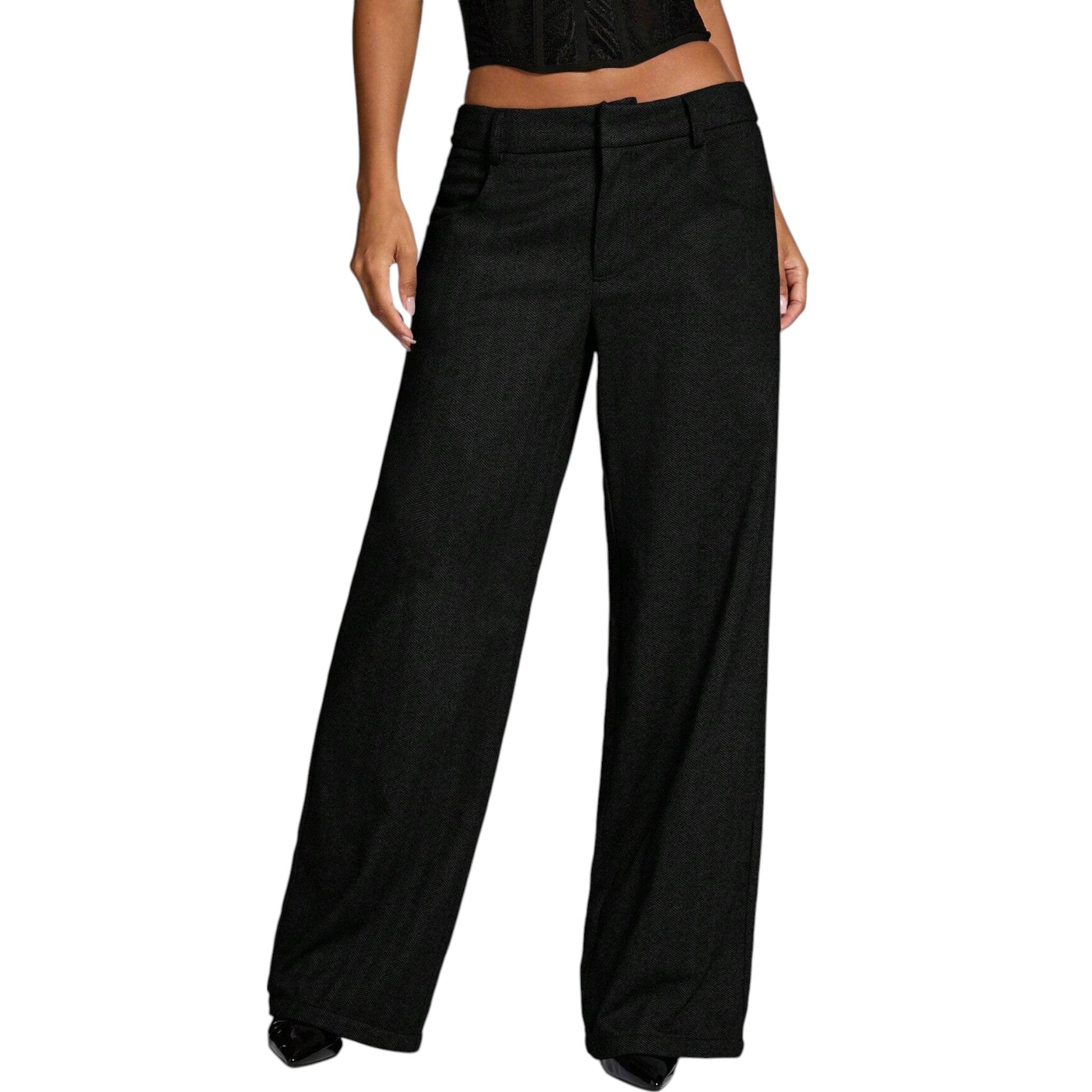 Címke nélküli, fekete, magas derekú, bő szárú, zsebes nadrág.
