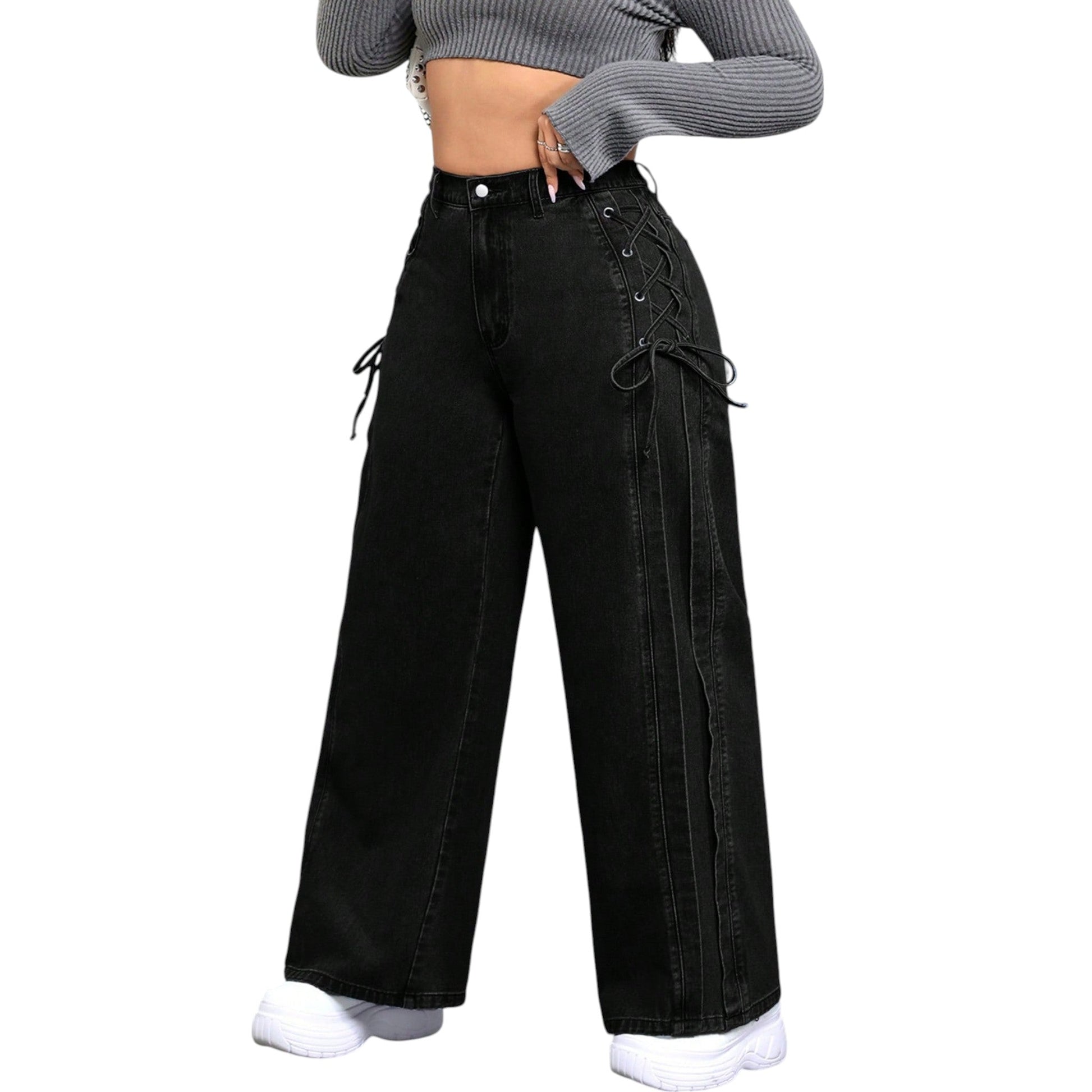Címke nélküli, fekete, magas derekú, bő szárú, oldalt fűzős.