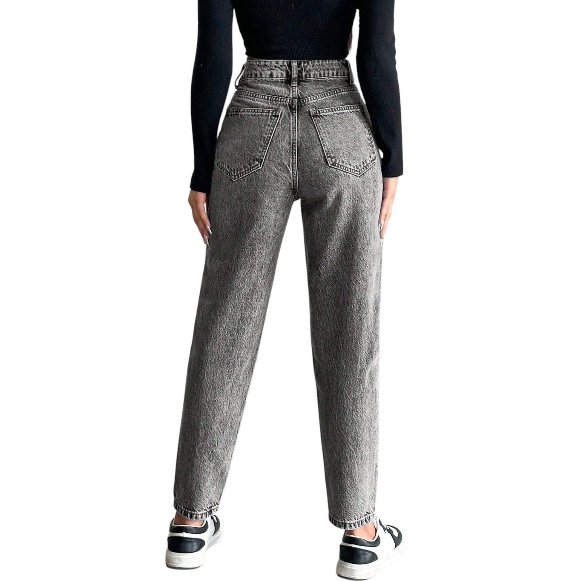 Címke nélküli, szürke, magas derekú, egyenes szárú, slim fit farmer nadrág.