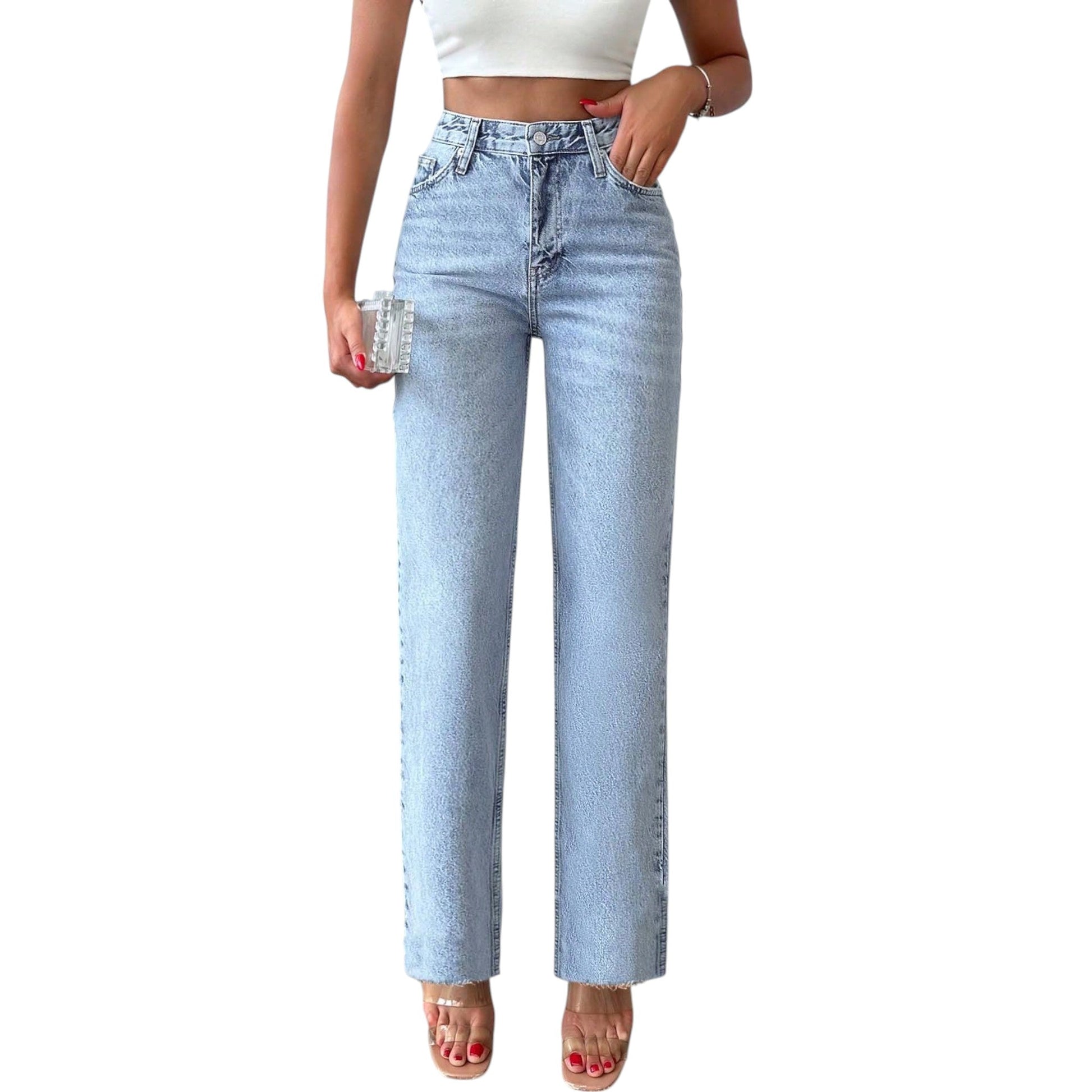 Címke nélküli, világoskék, egyenes szárú farmer nadrág. Magas derekú, cipzáras és gombos záródású, övtartókkal. Klasszikus ötzsebes kivitel. Enyhén szakadt, nyers szárvégekkel.
