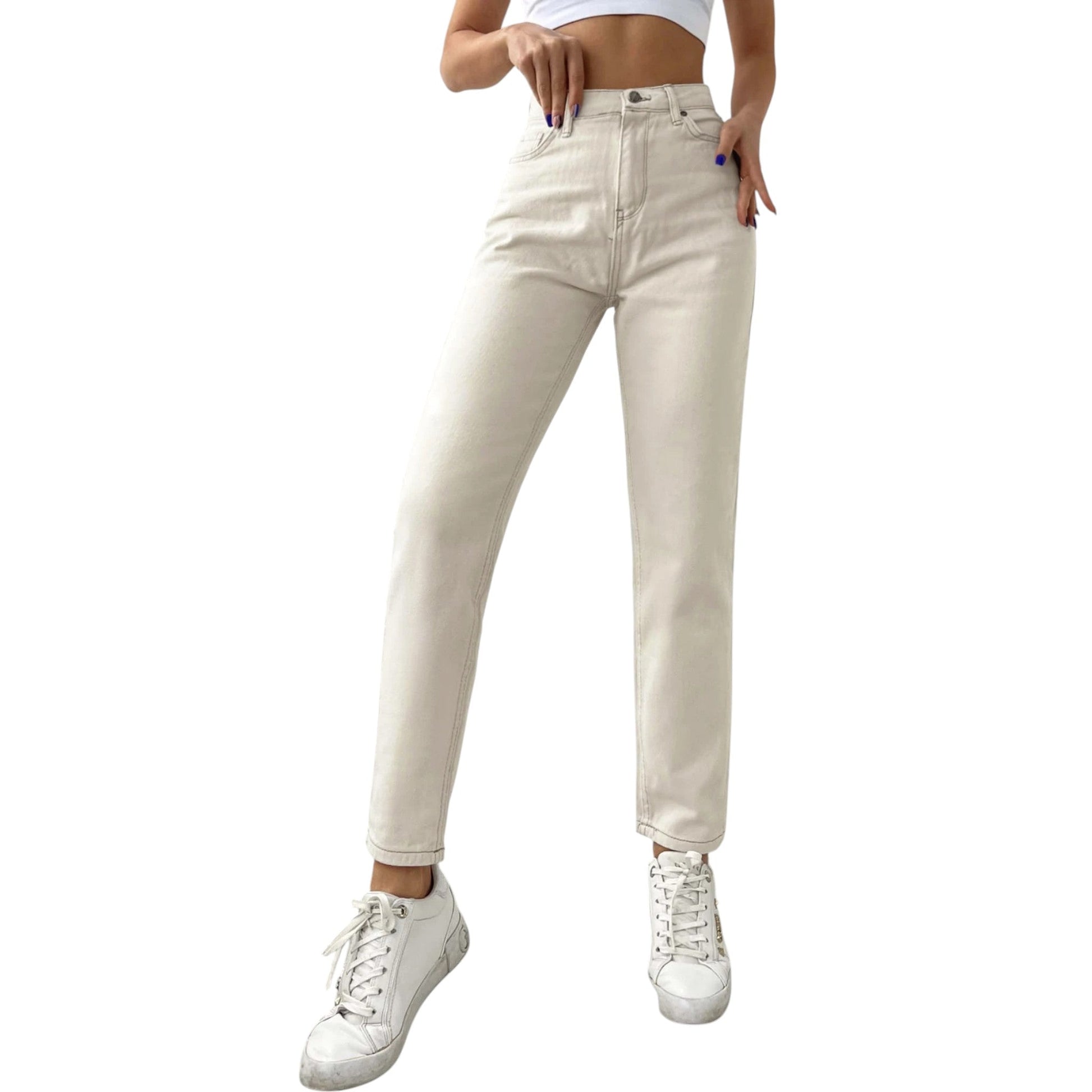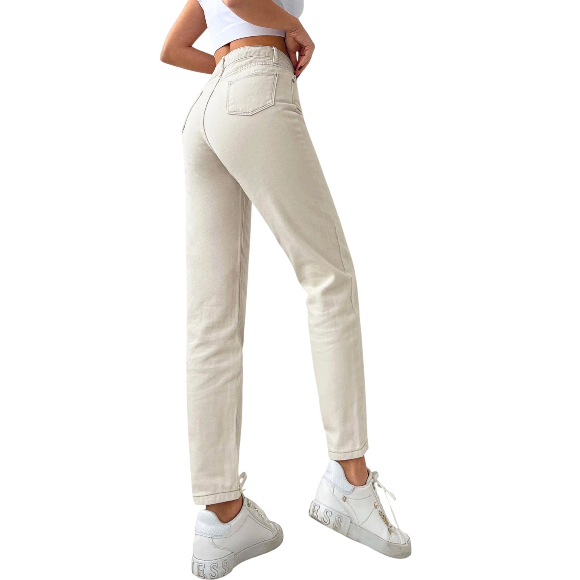 Címke nélküli, bézs, magas derekú, egyenes szárú farmer nadrág, elől gombos és cipzáros rögzítéssel, öt zsebbel.