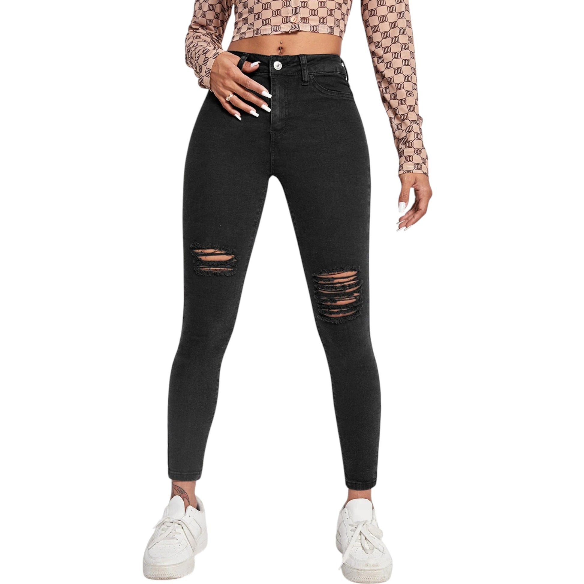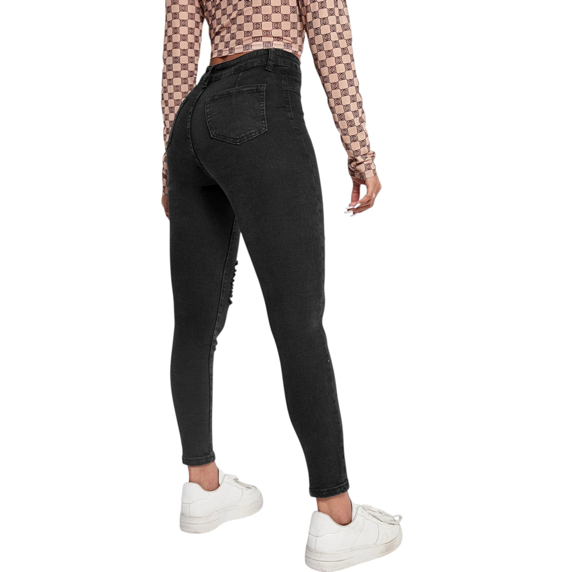 Címke nélküli, fekete farmernadrág. Magas derekú, szűk szárú, térdénél szaggatott.