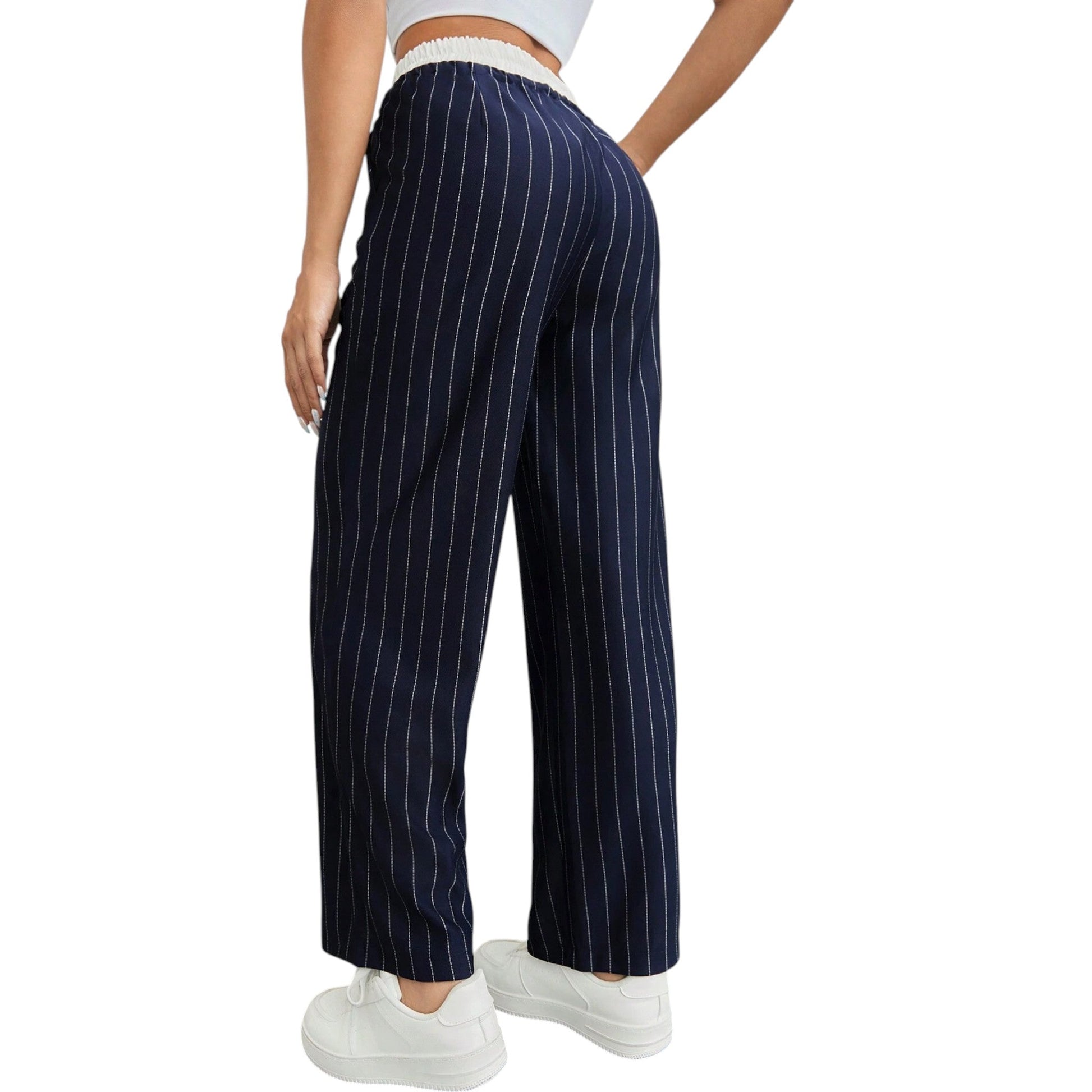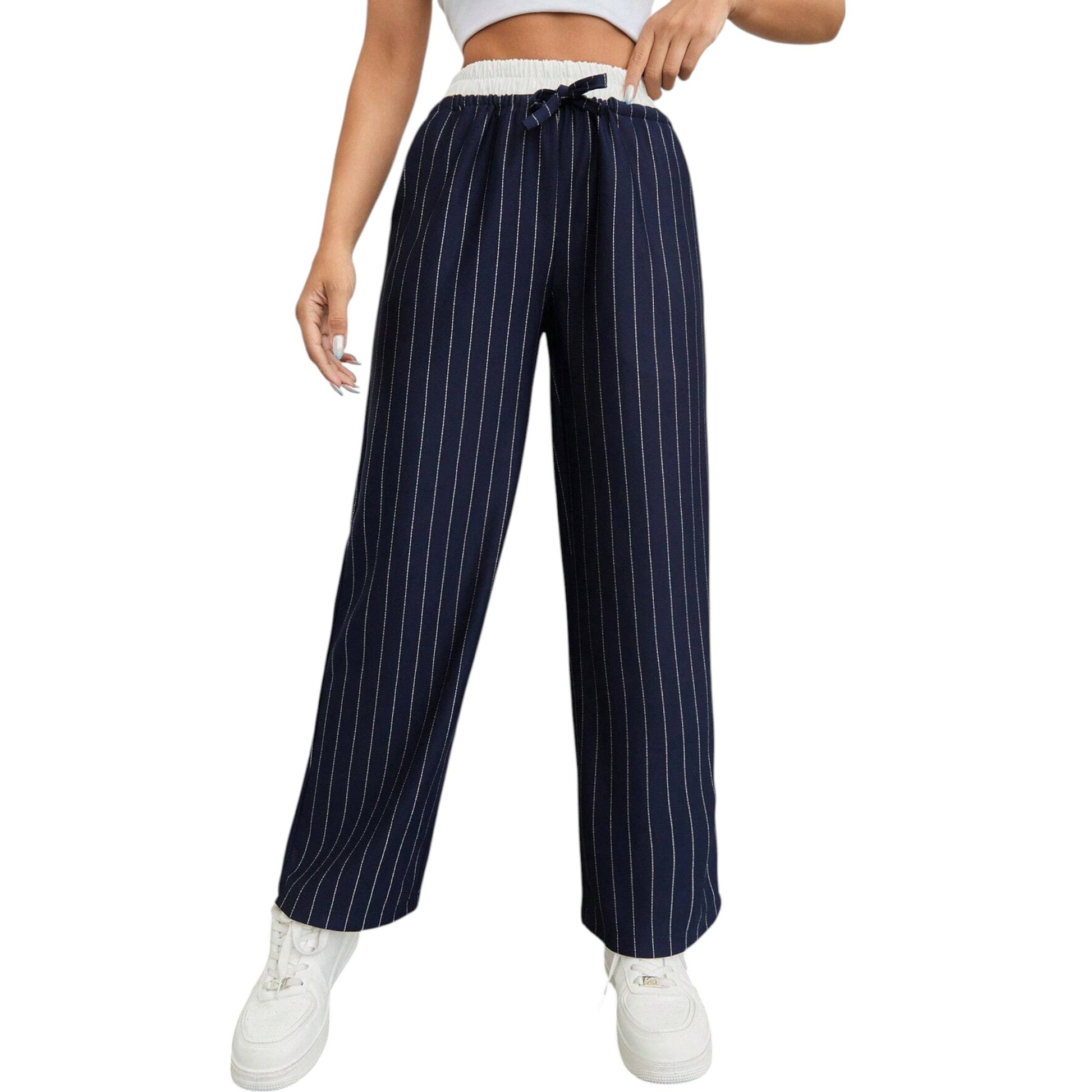 Címke nélküli, sötétkék, fehér csíkos, magas derekú, bő szárú nadrág, húzott derékrésszel és megkötővel.
