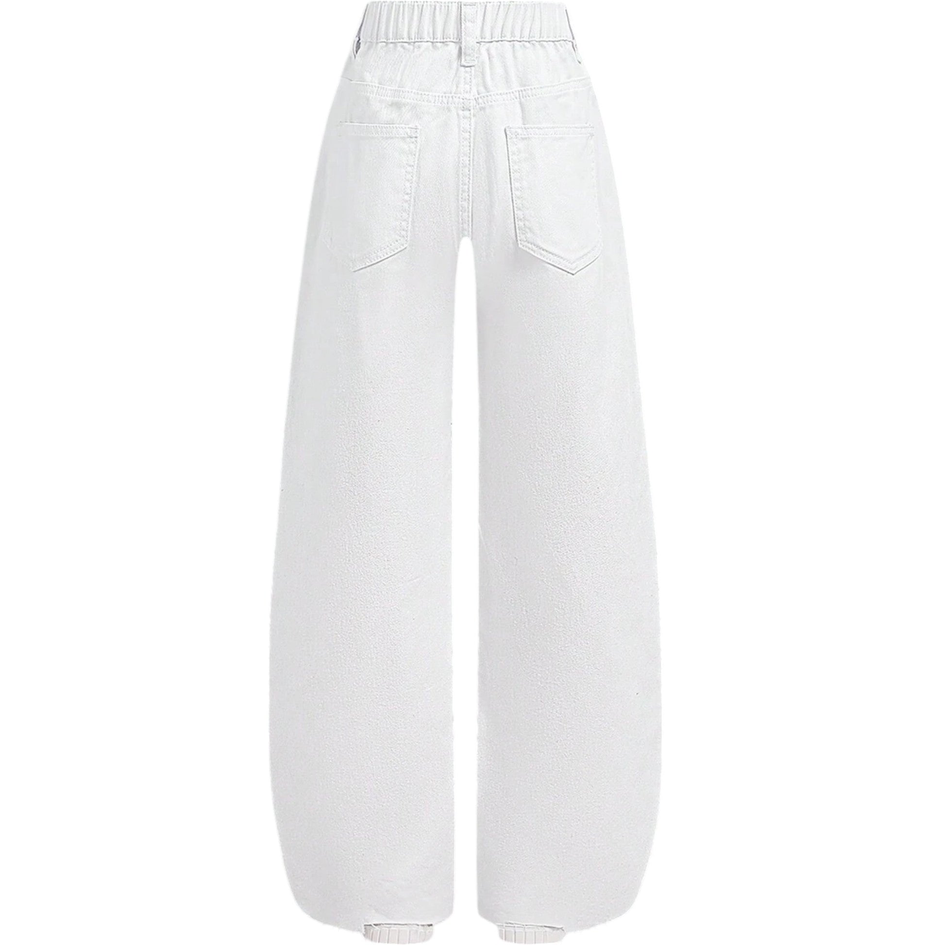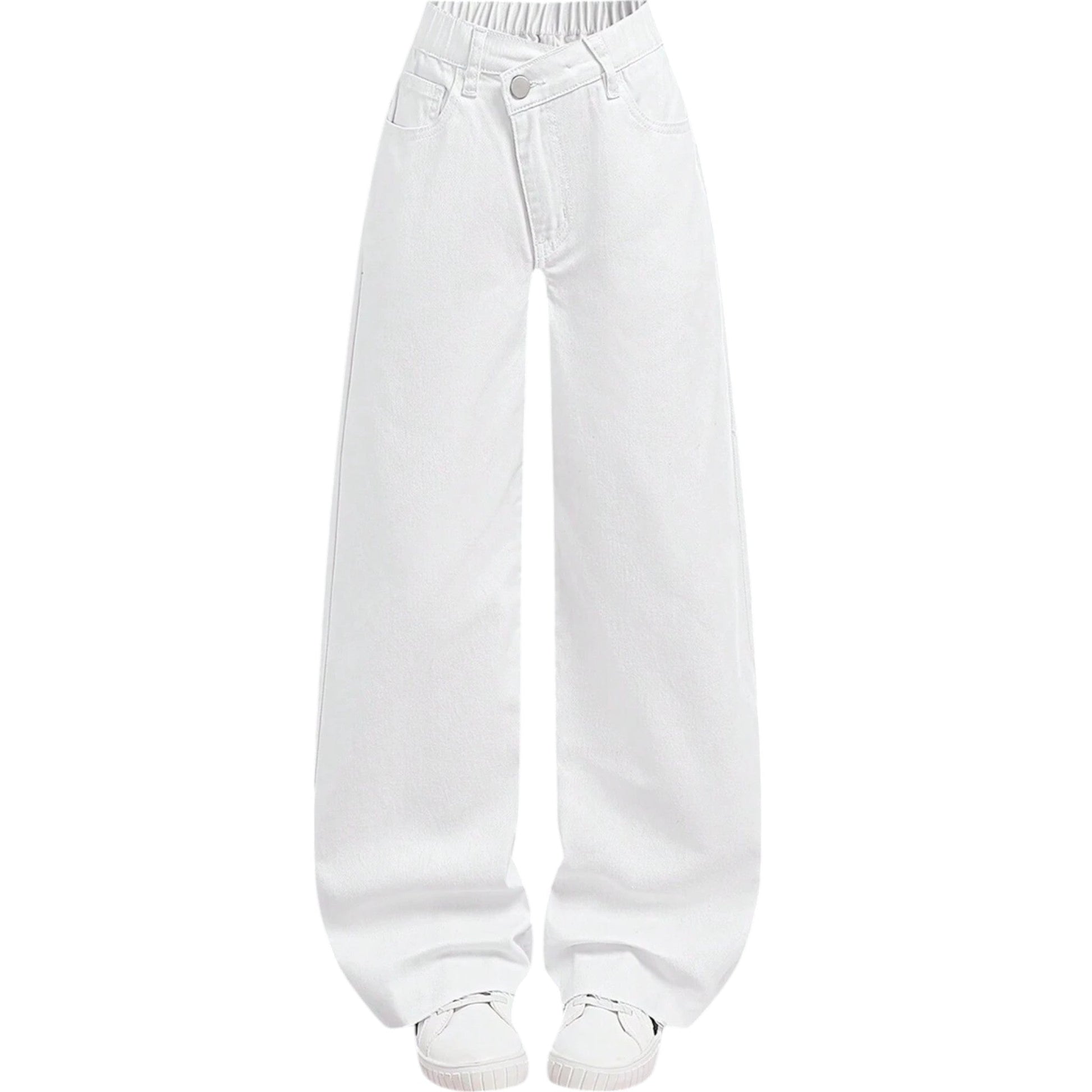 Címke nélküli, fehér, magas derekú, gombos, bő szárú farmer nadrág.