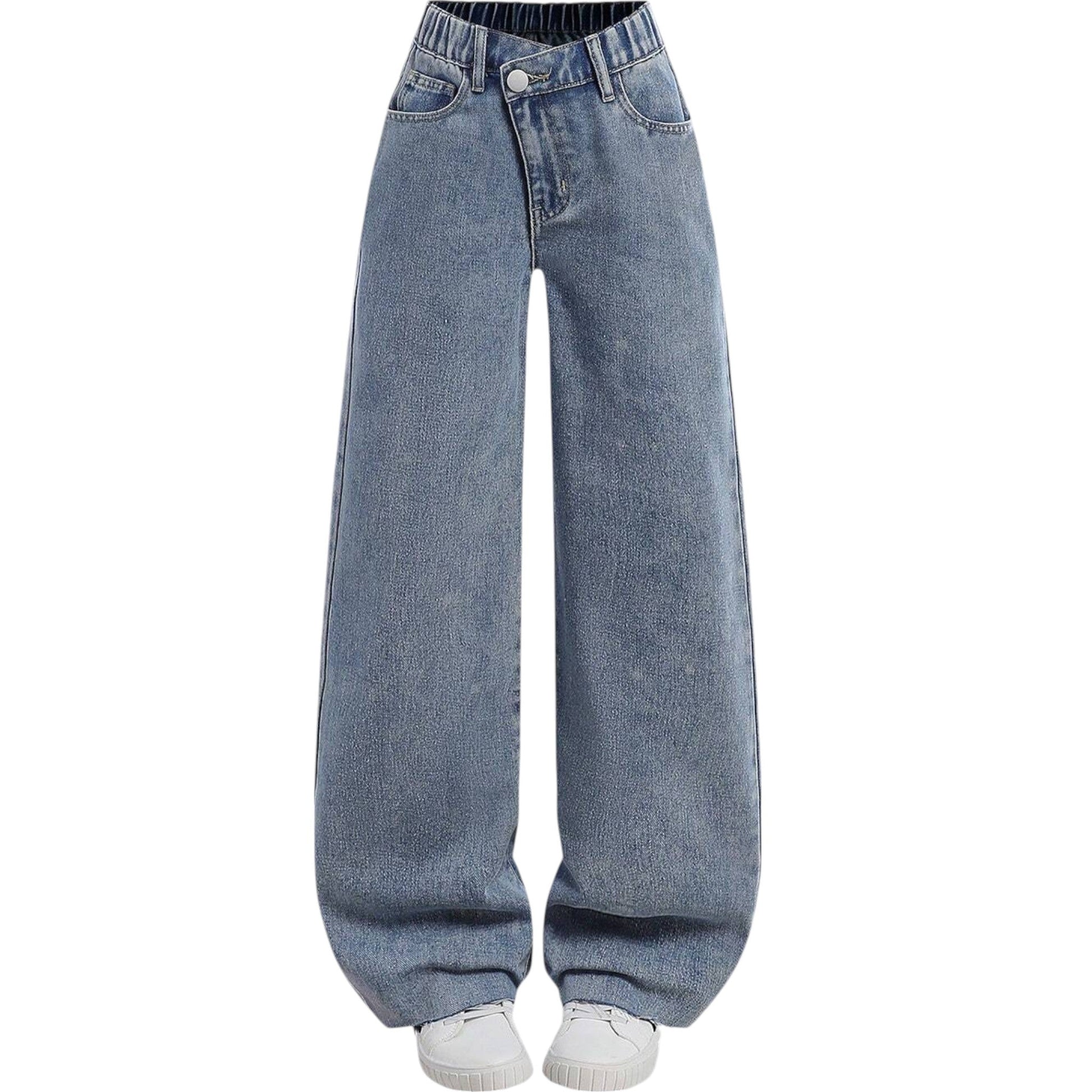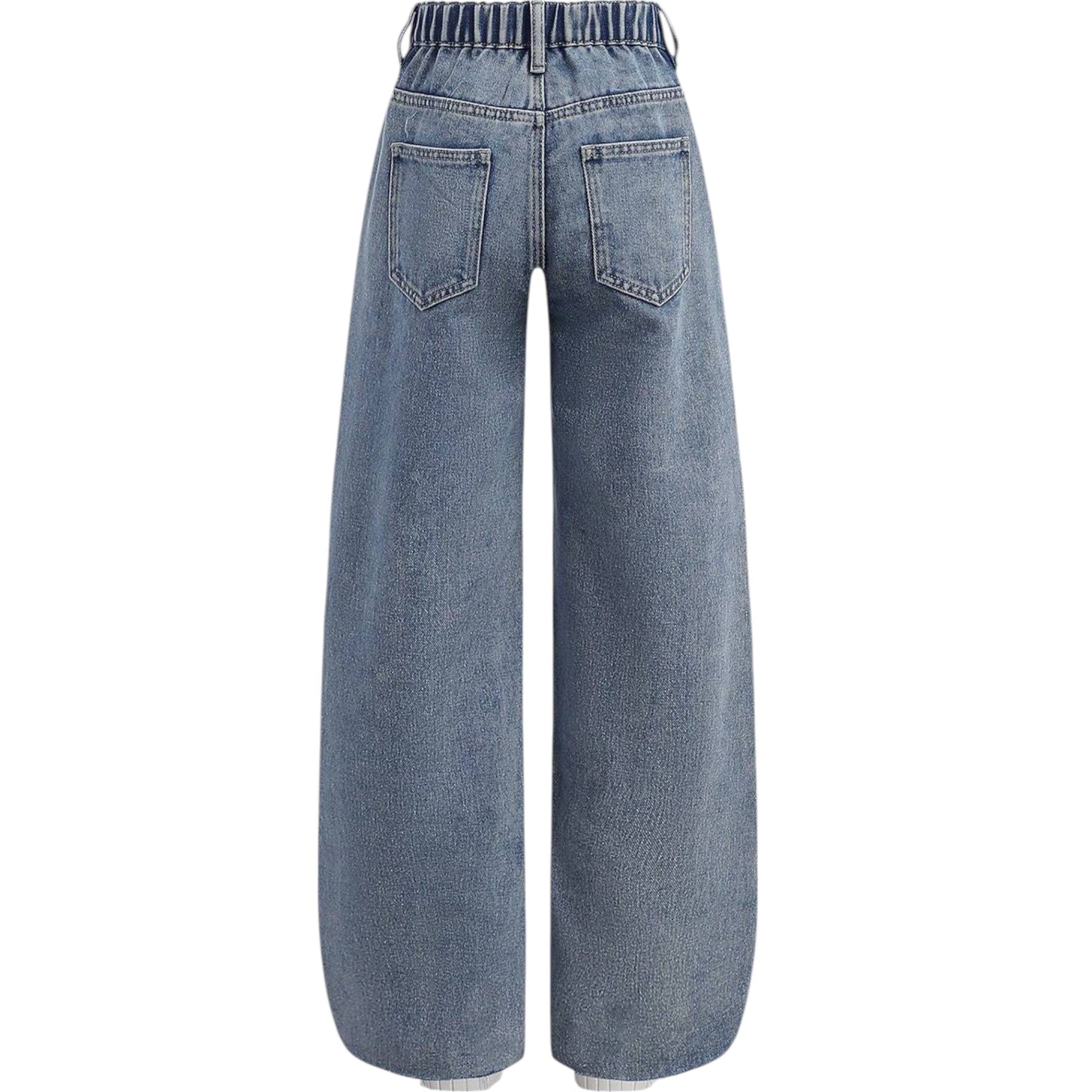 Címke nélküli, kék, magas derekú, gombos, bő szárú farmer nadrág.
