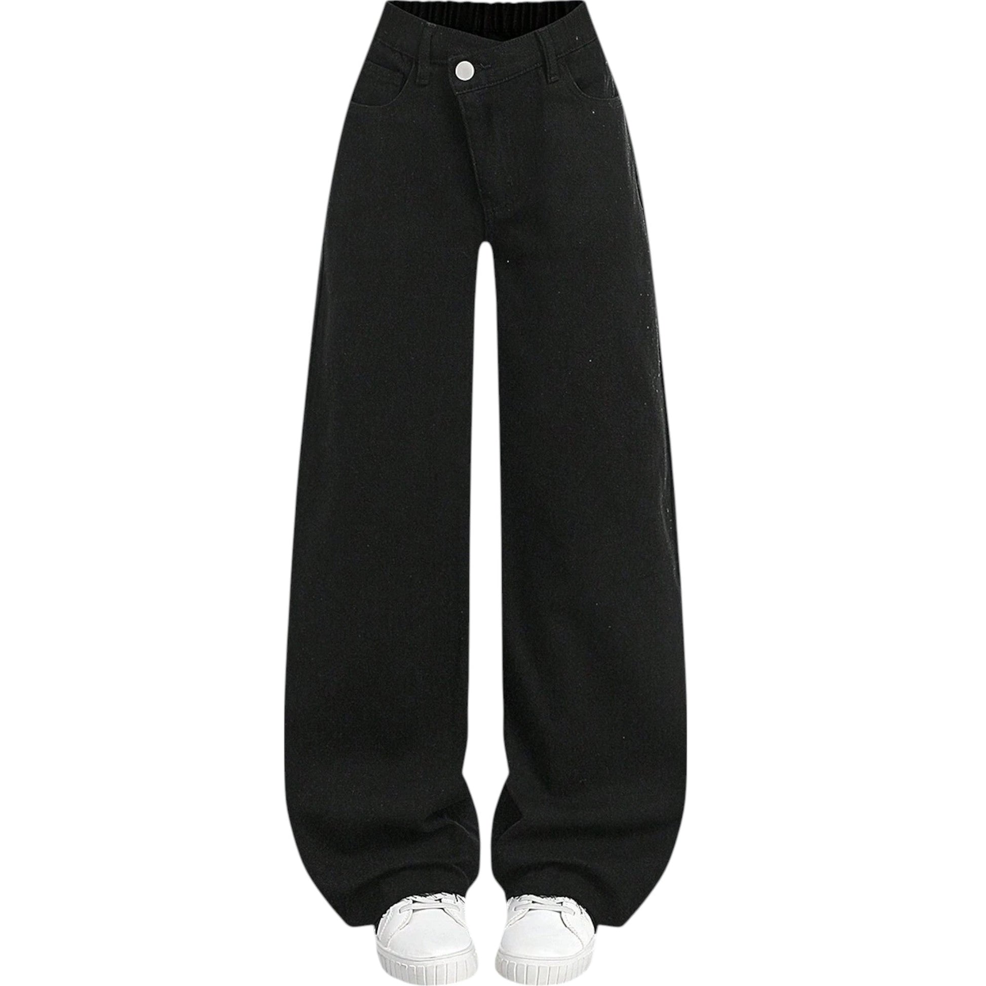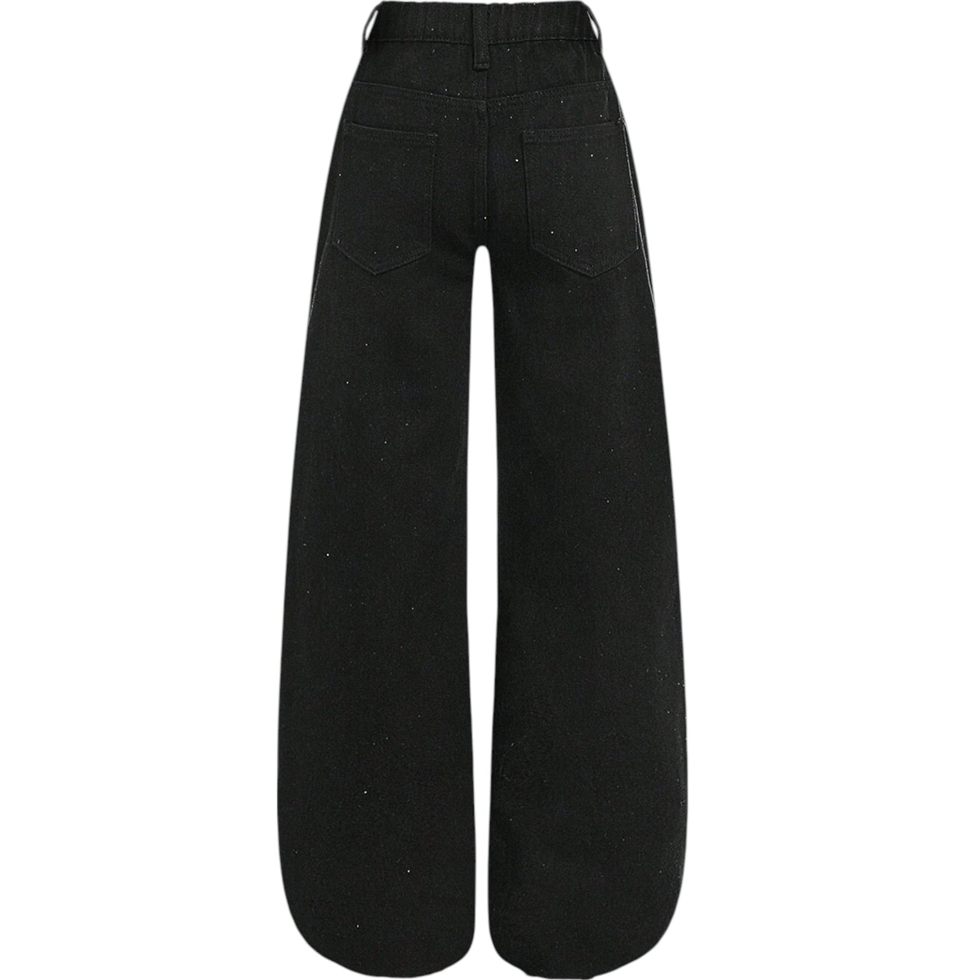 Címke nélküli, fekete, magas derekú, gombos, bő szárú farmer nadrág.