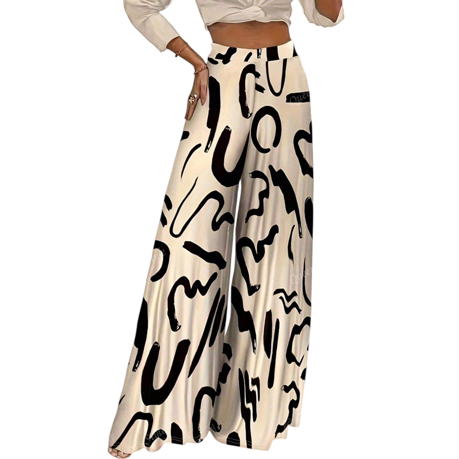 Címke nélküli, bézs alapon fekete absztrakt mintás, magas derekú, bő szárú, palazzo nadrág.