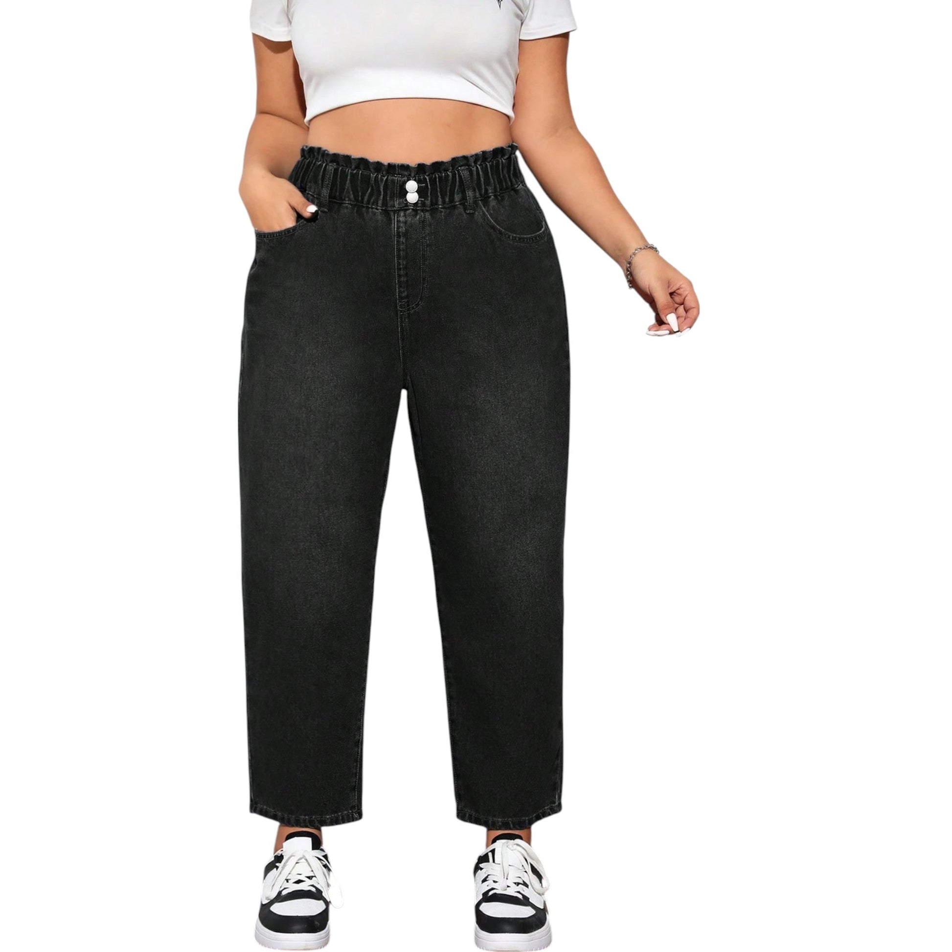 Címke nélküli, fekete, farmer, magas derekú, ráncolt derékrésszel, elöl gombos záródás, oldalsó zsebekkel, bővebb szárú, bokáig érő fazon.