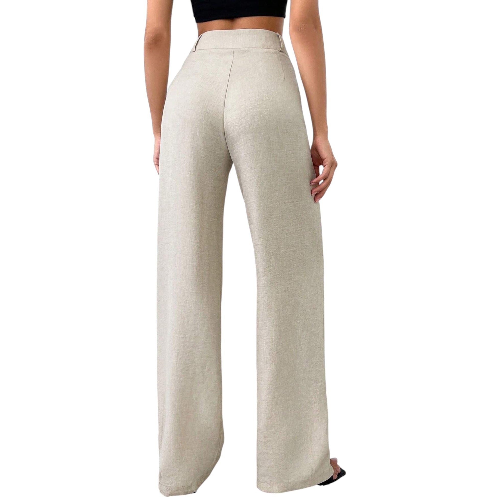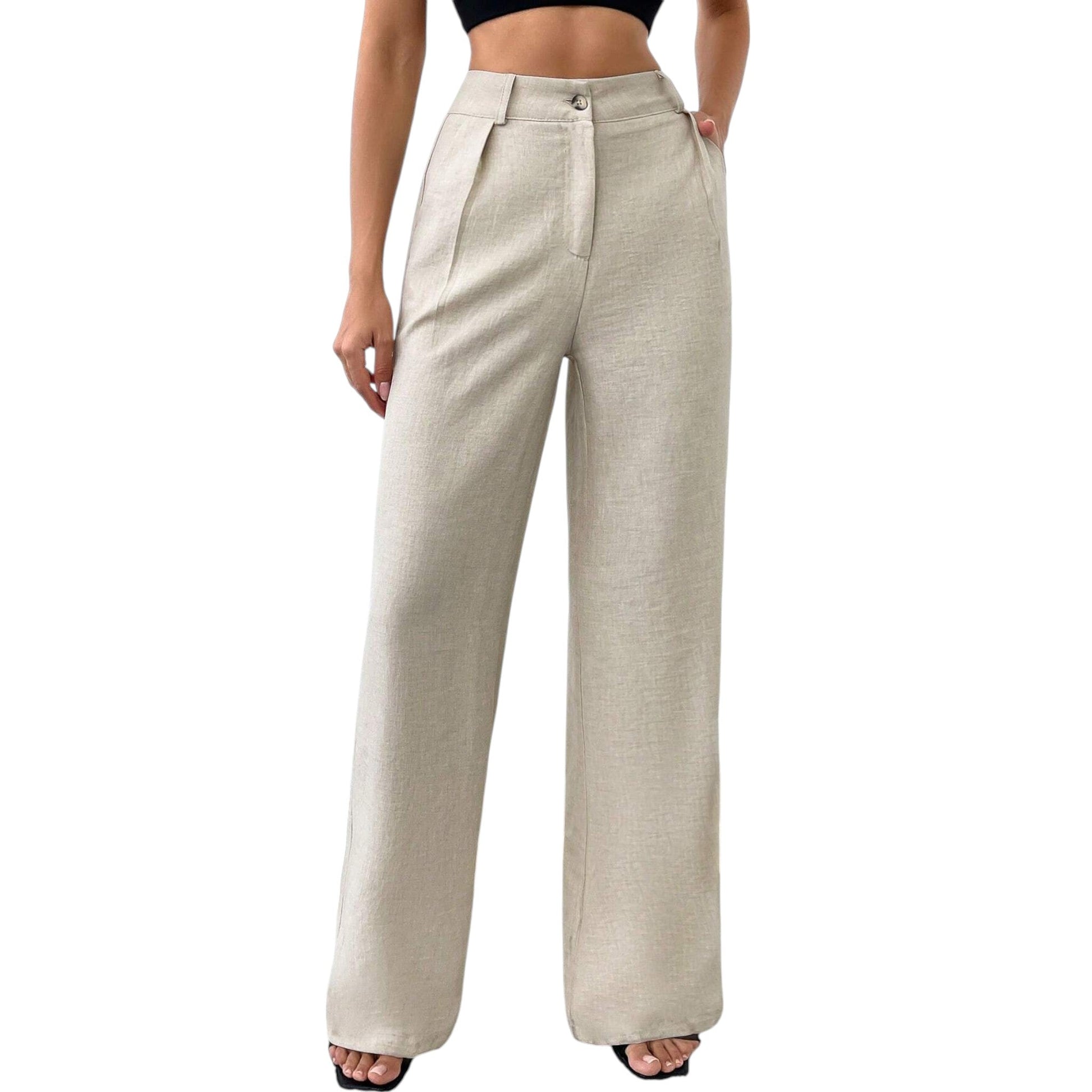 Címke nélküli, bézs, magas derekú, egyenes szárú, vászon anyagú nadrág, gombos és cipzáras záródással, oldalzsebekkel.