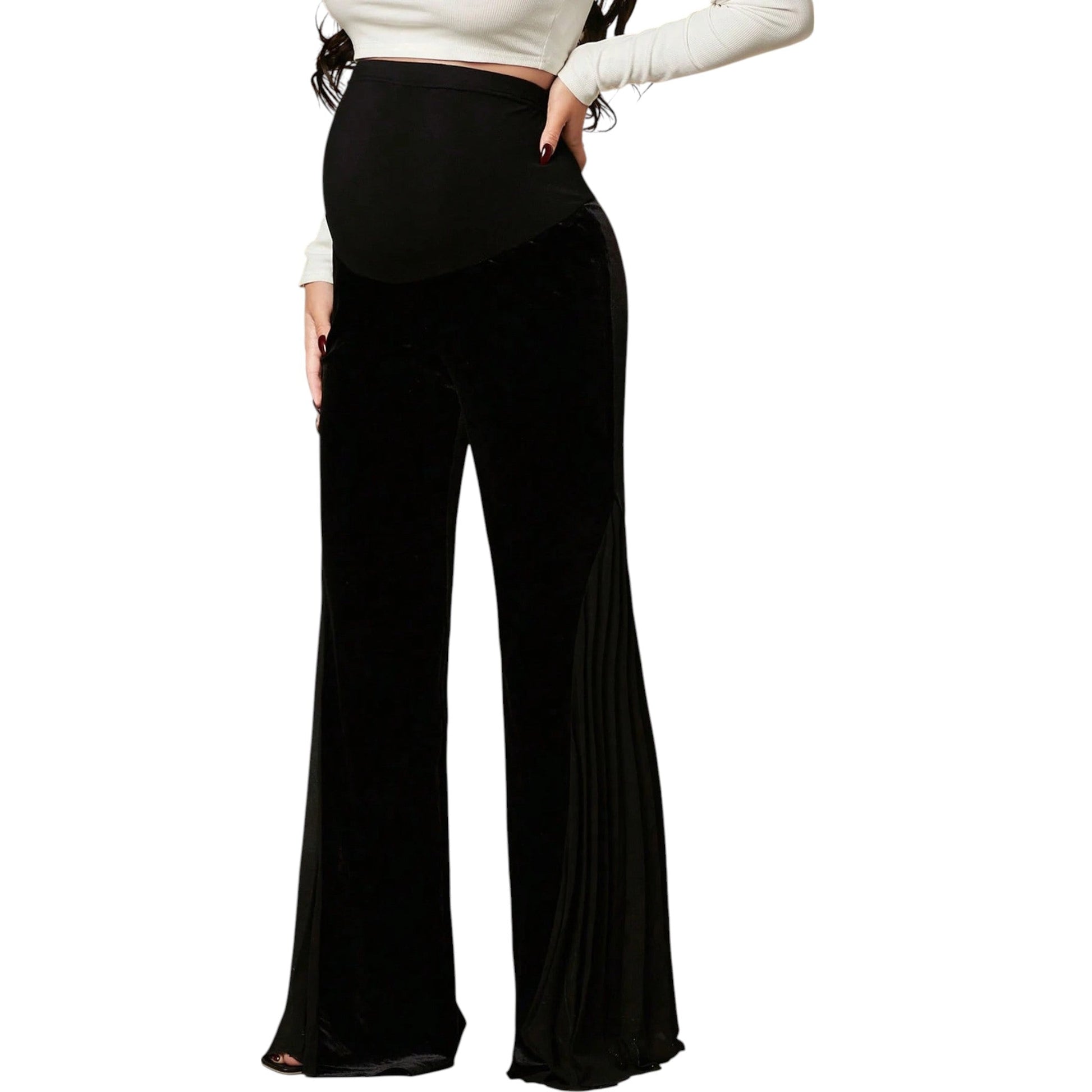 Címke nélküli, fekete, plüss anyagú, bő szárú kismama nadrág. Magas derekú, gumírozott hassal. Oldalán plisírozott betéttel.
