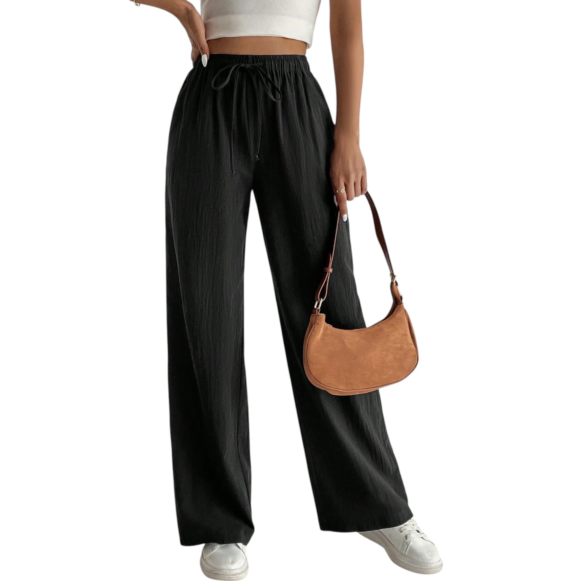 Címke nélküli, fekete, magas derekú, egyenes szárú nadrág, megkötős derékkal, vászon anyag.