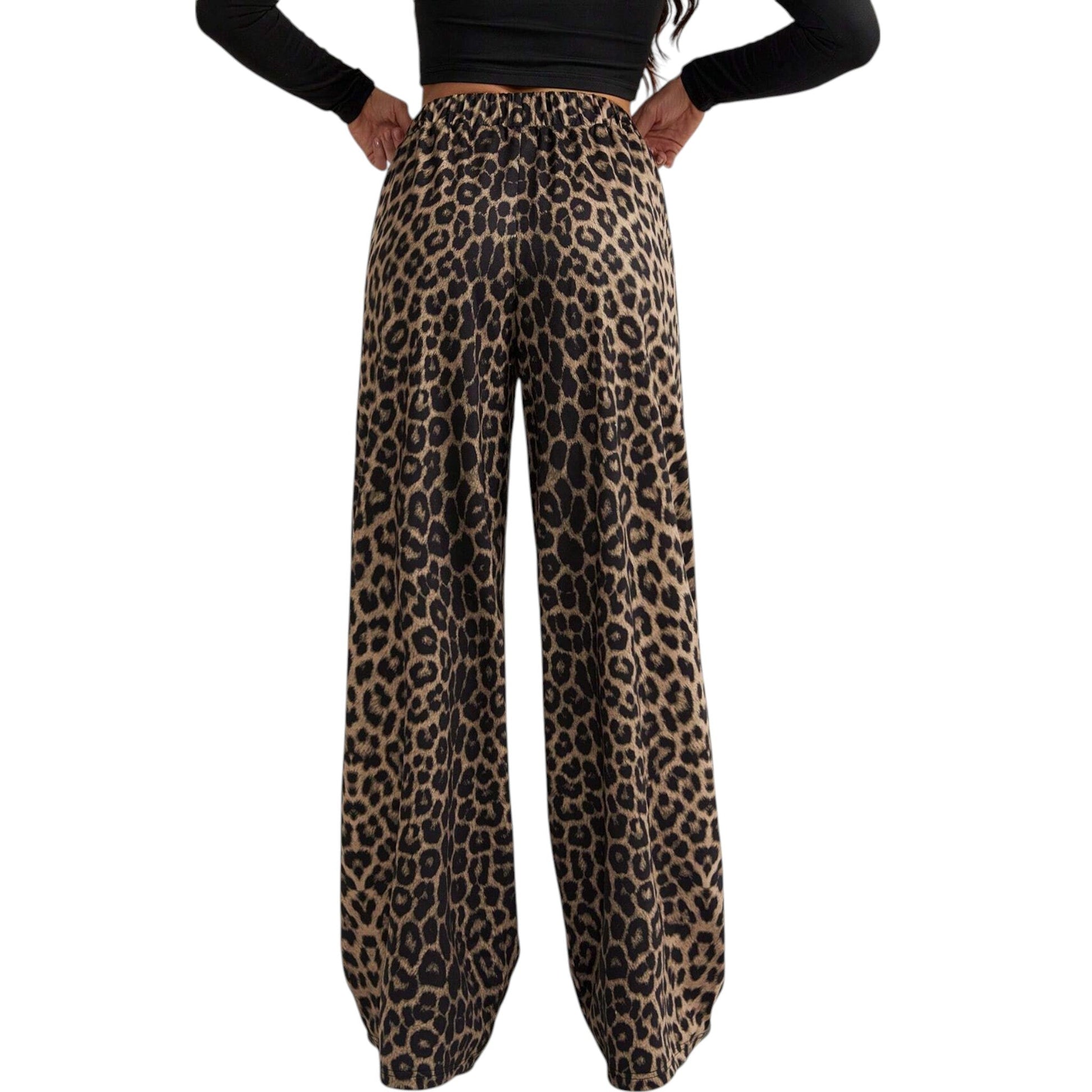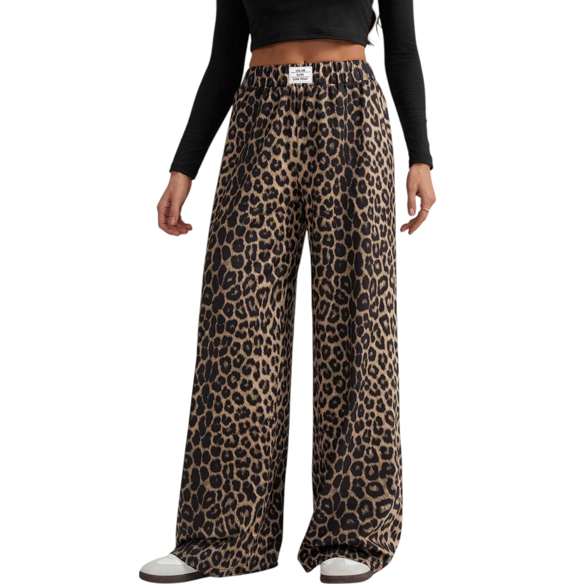 Címke nélküli, barna, fekete leopárdmintás, magas derekú, széles szárú nadrág, gumis derékkal.