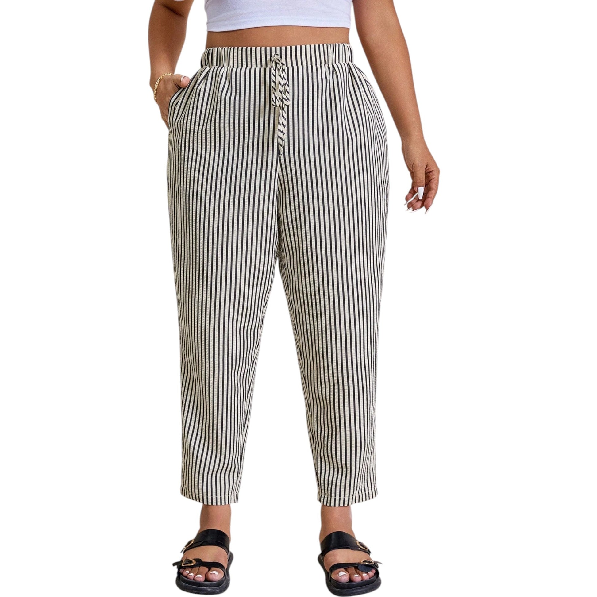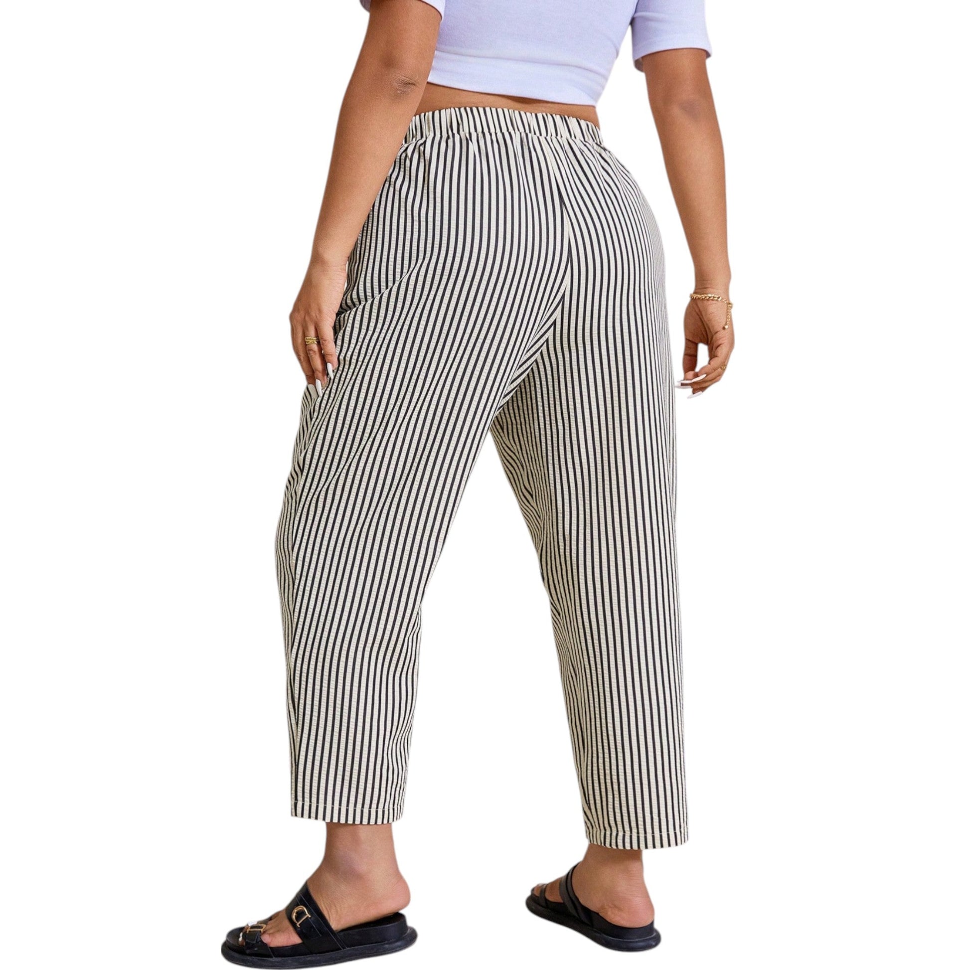 Címke nélküli, fekete-fehér csíkos, laza szabású nadrág, magas derekú, megkötős és zsebes.