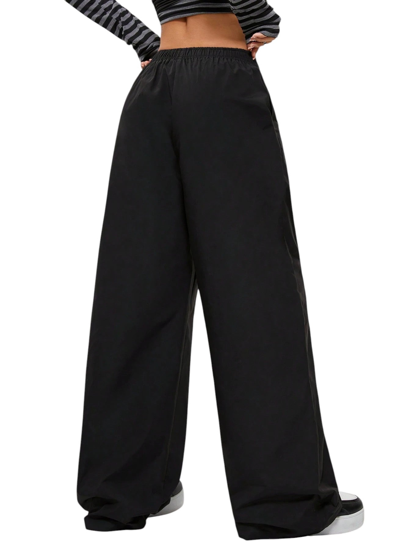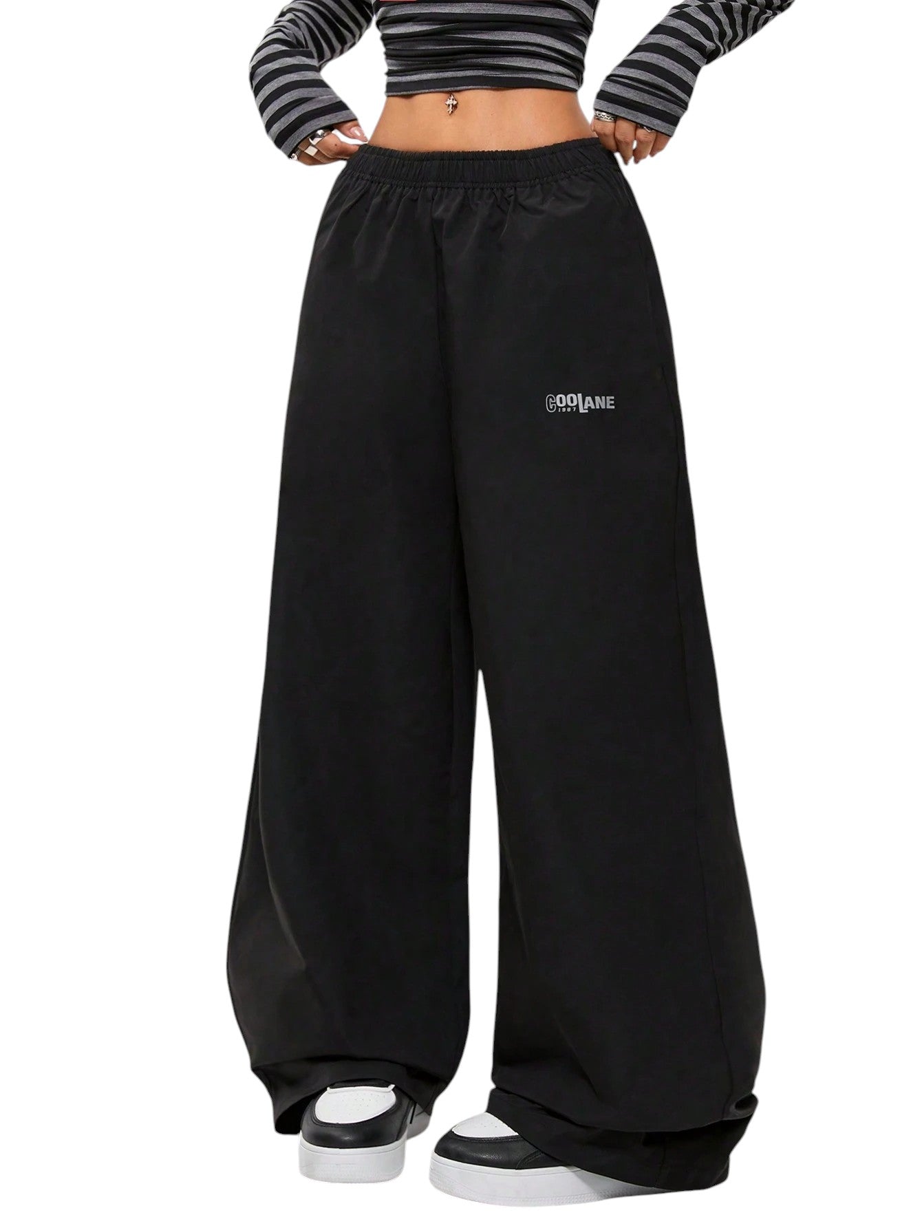 Címke nélküli, fekete, logó mintás, gumis derekú, bő szárú nadrág.