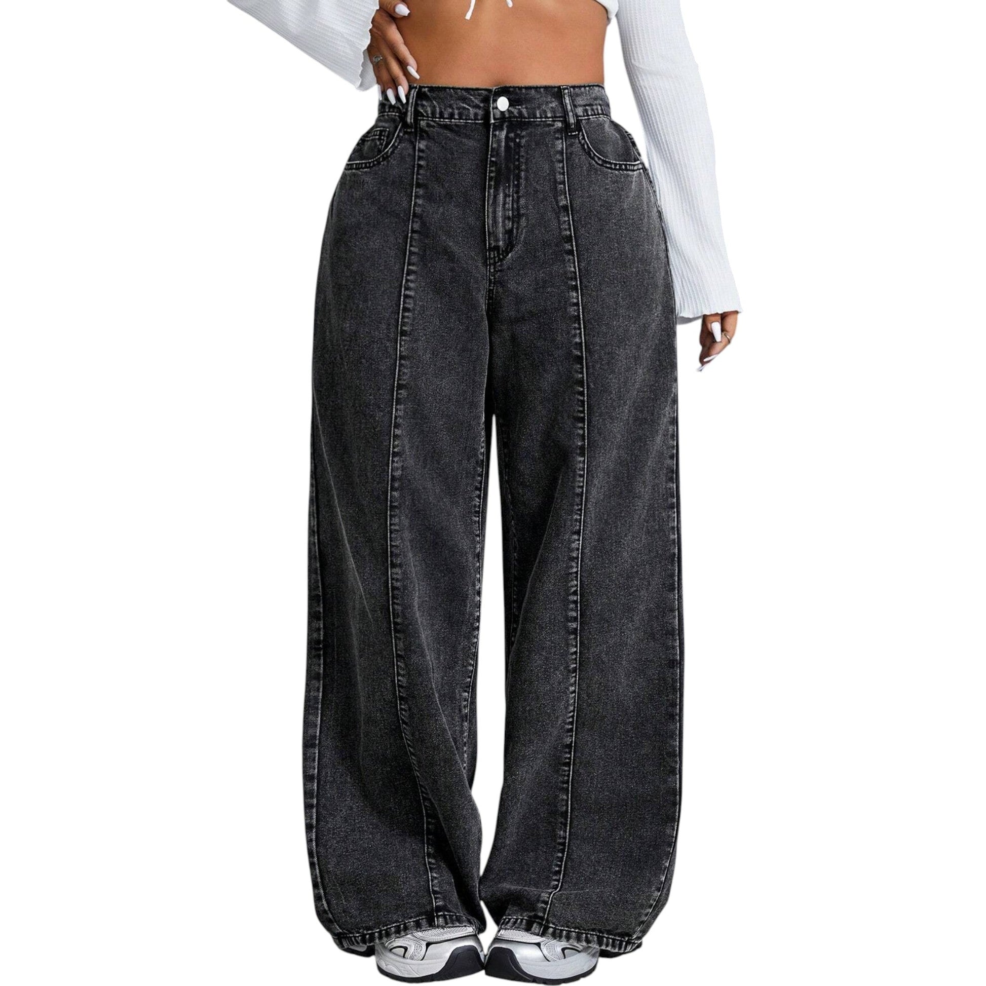 Címke nélküli, fekete, magas derekú, széles szárú farmer nadrág, elöl varrással.