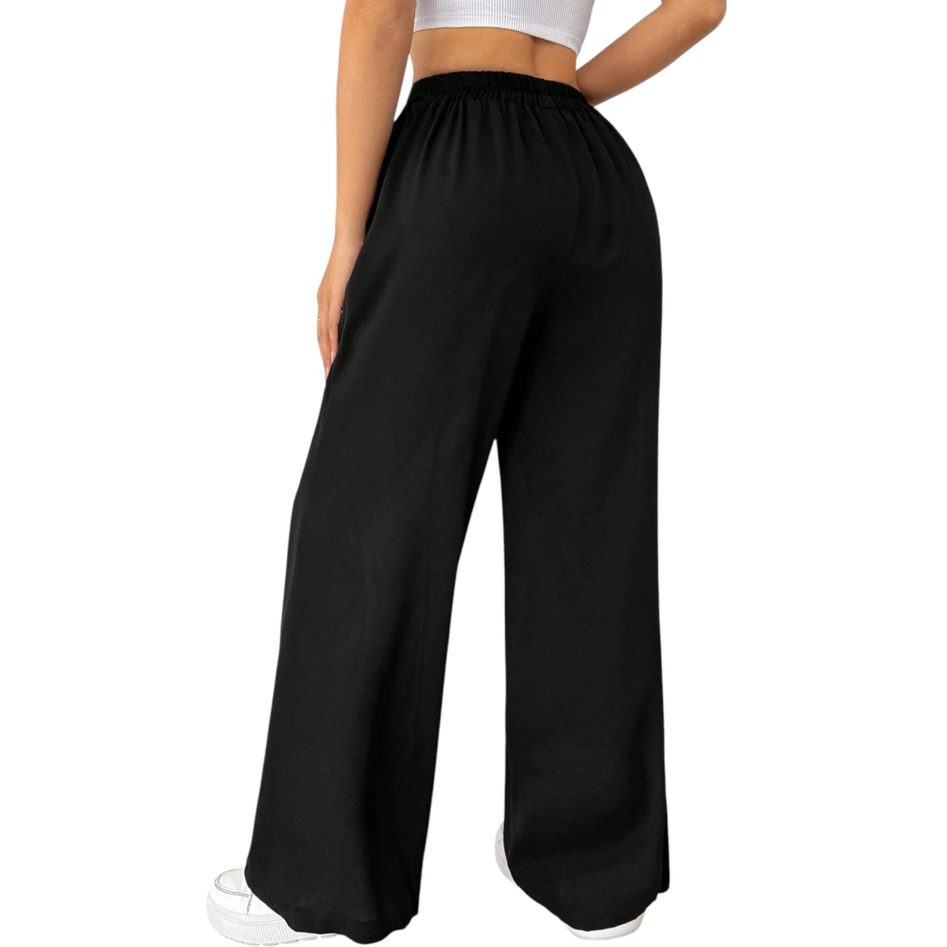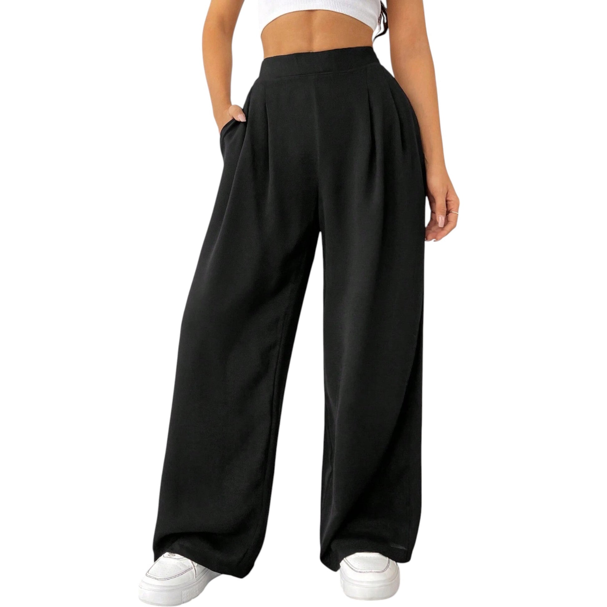 Címke nélküli, fekete, magas derekú, ráncolt, zsebes, bő szárú nadrág.