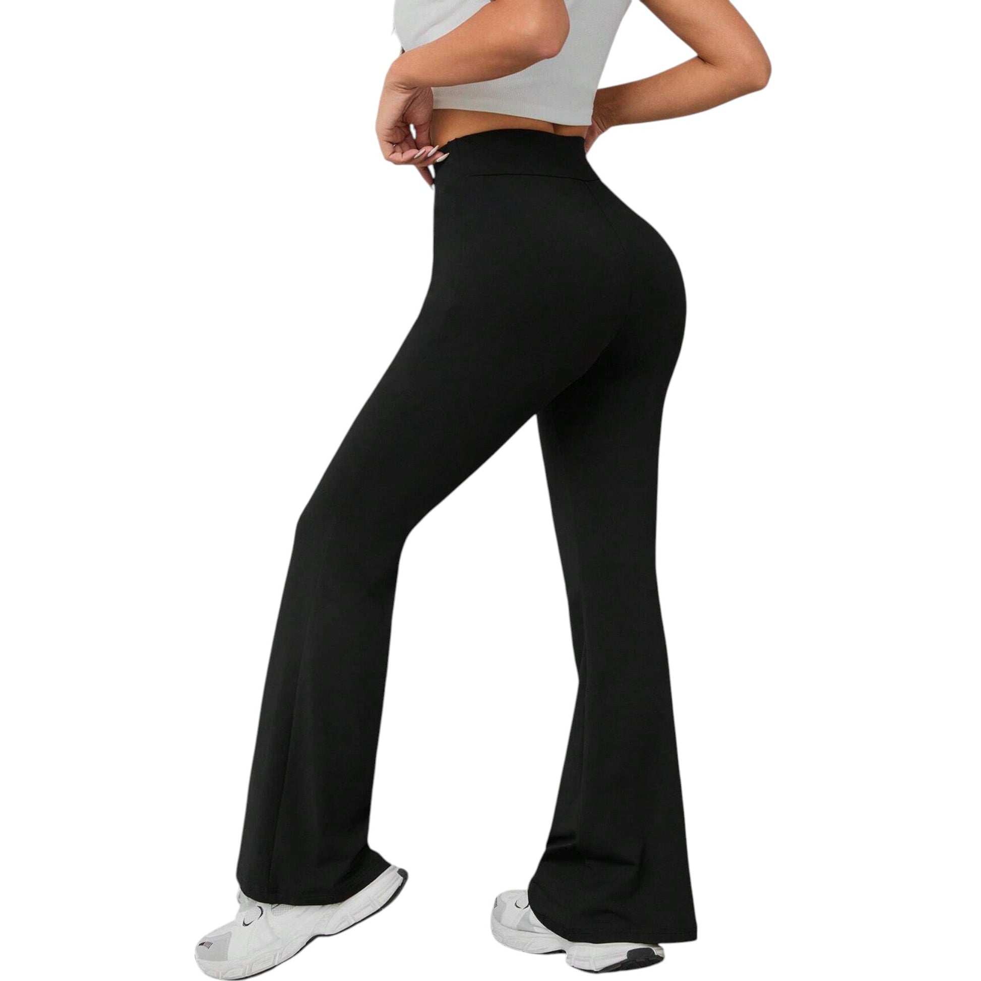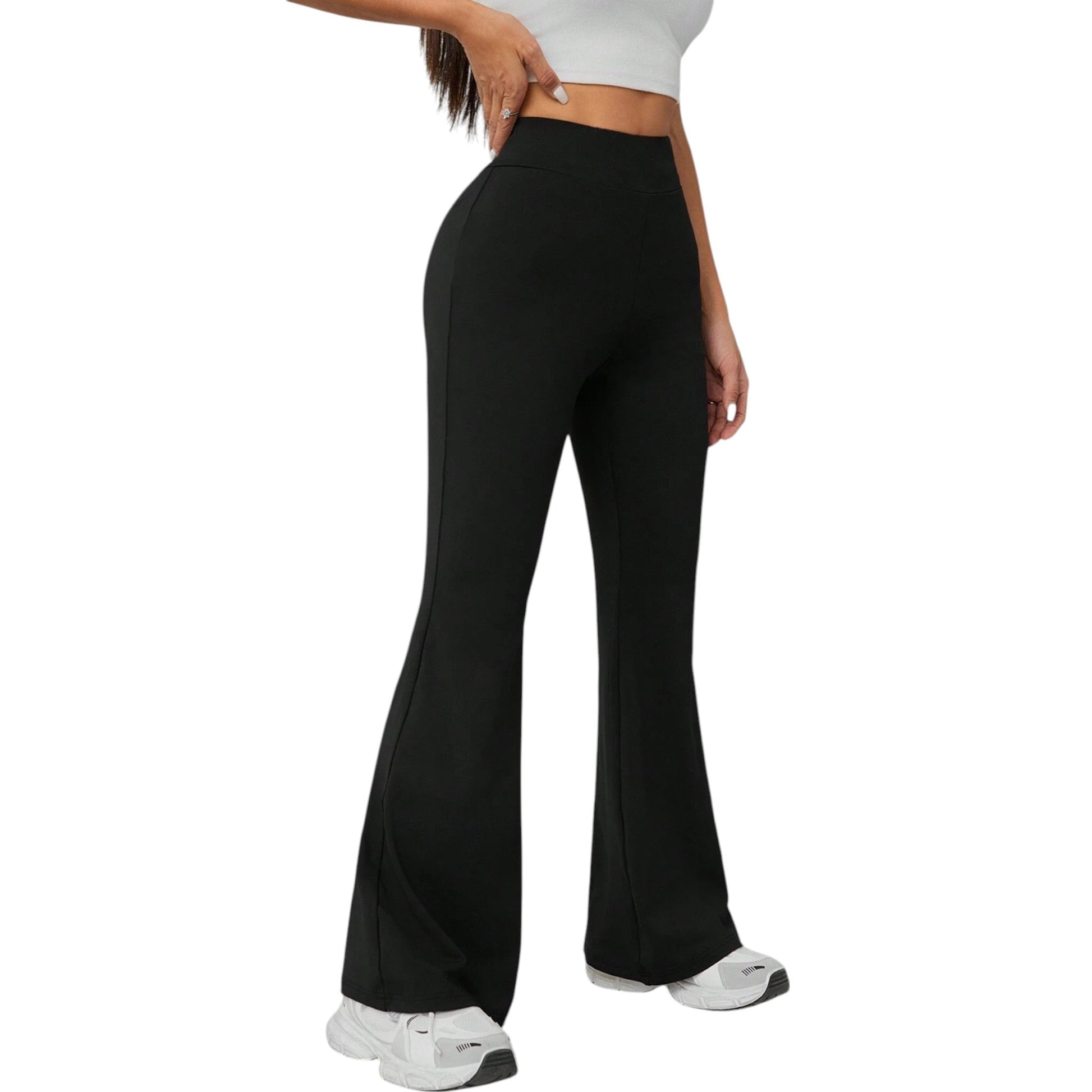 Címke nélküli, fekete, magas derekú, slim fit felső résszel és harang szabású, flare szárral rendelkező nadrág.