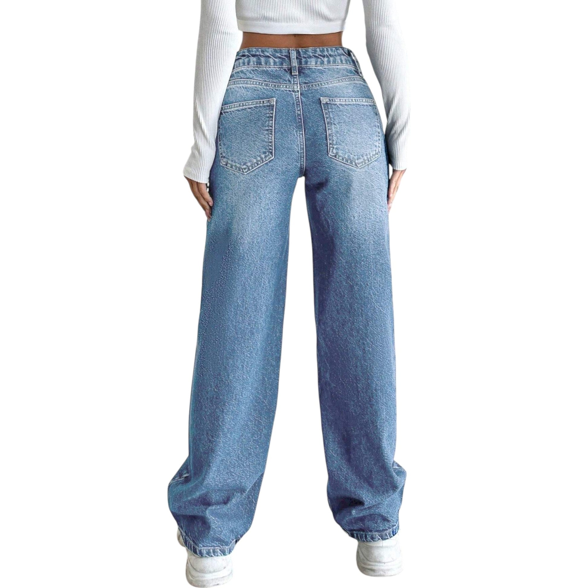 Címke nélküli, kék, magas derekú, világos kék farmer, egyenes szárú, zsebes, gombos és cipzáras záródású.