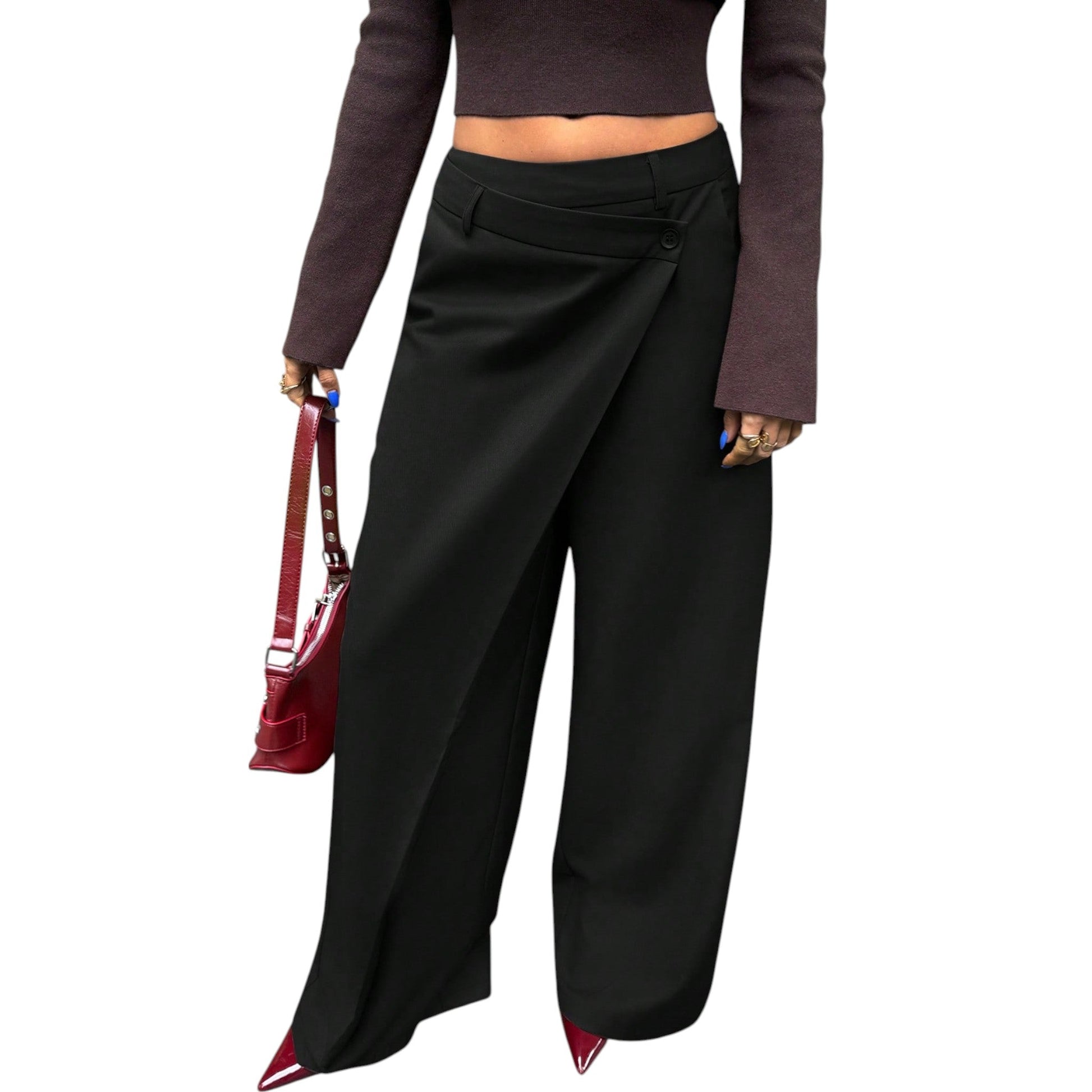 Címke nélküli, fekete, magas derekú, aszimmetrikus szabású nadrág, gombos záródással.