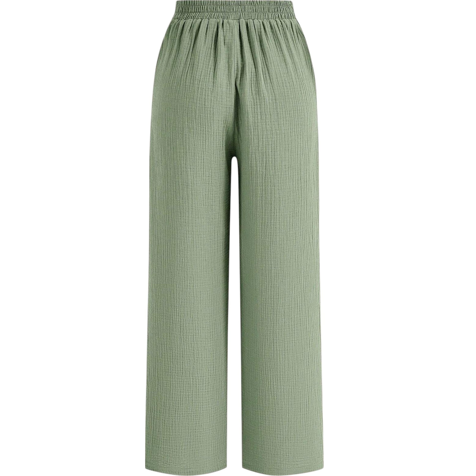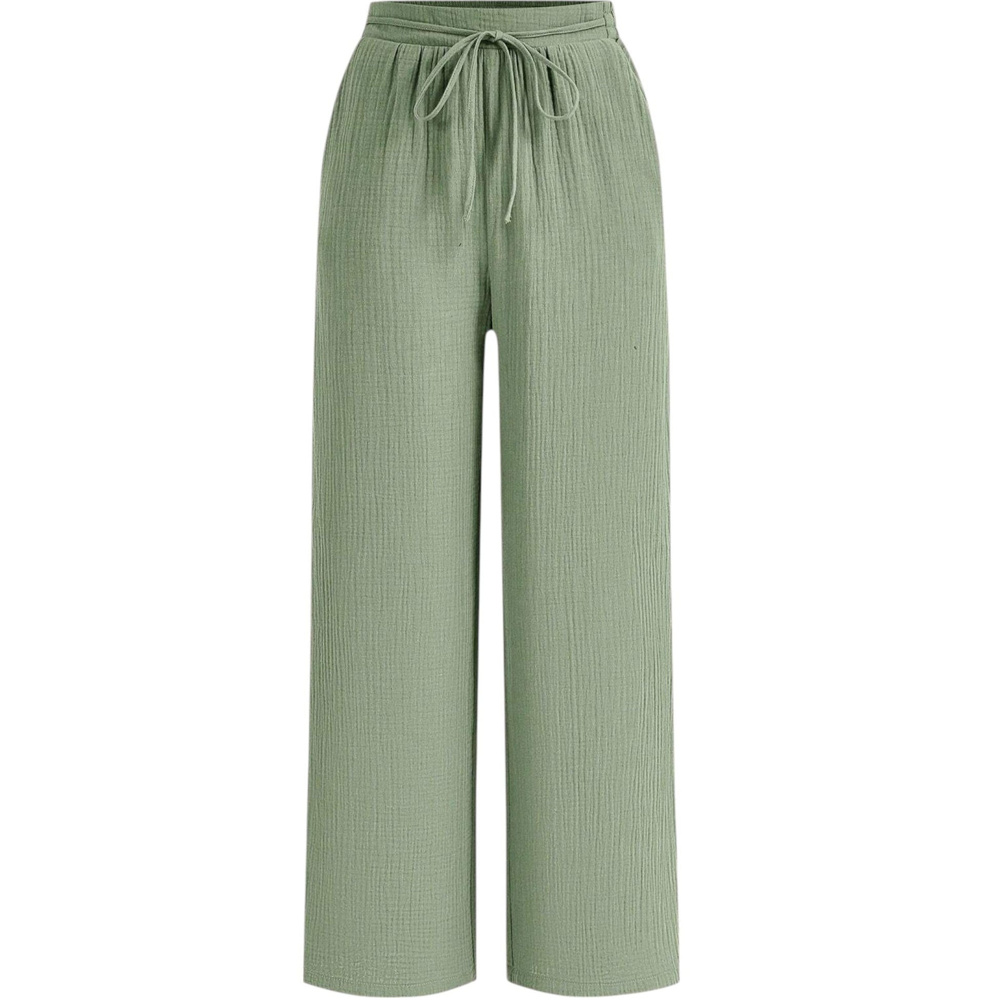 Címke nélküli, zöld, megkötős derekú, bő szárú vászon nadrág.