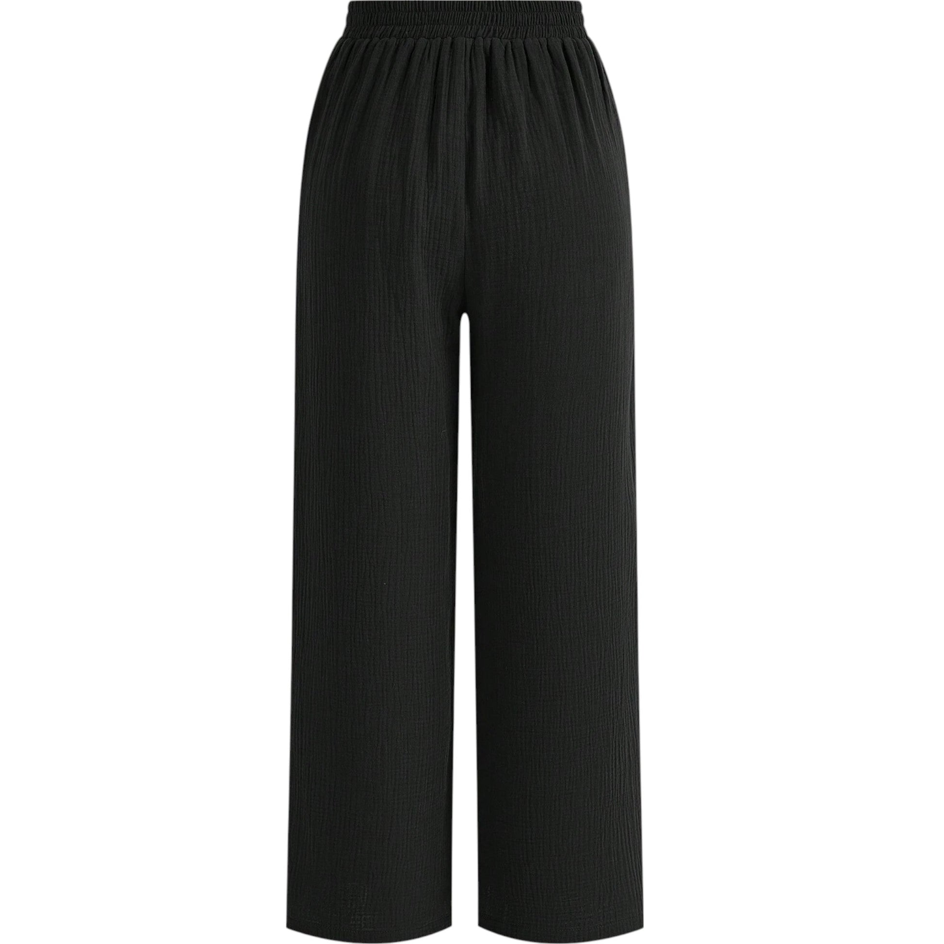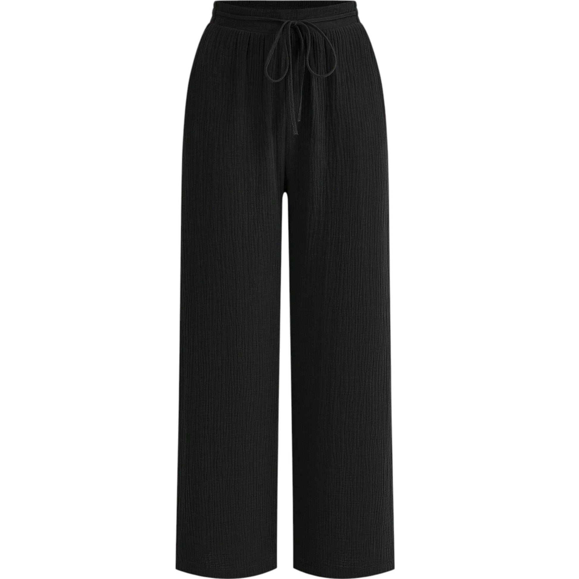 Címke nélküli, fekete, megkötős derekú, bő szárú vászon nadrág.