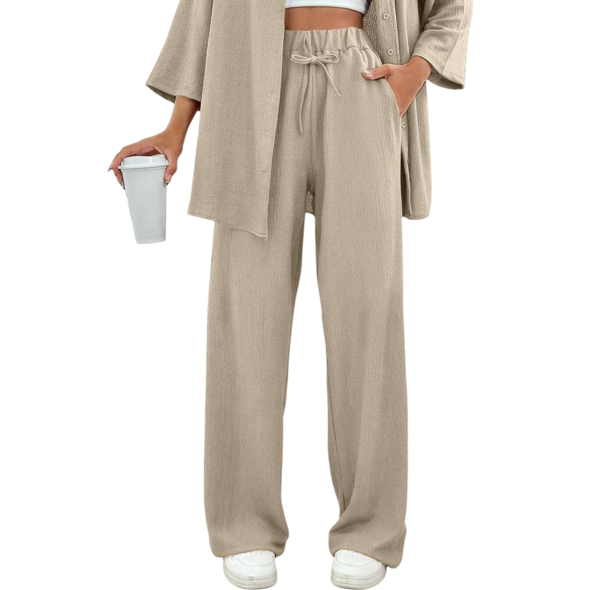 Címke nélküli, bézs, megkötős derekú, bő szárú vászon nadrág.