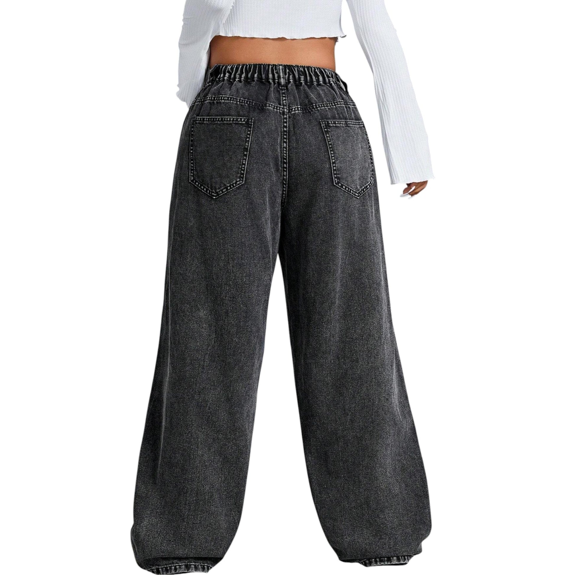 Címke nélküli, fekete, magas derekú, széles szárú farmer nadrág, elöl varrással.