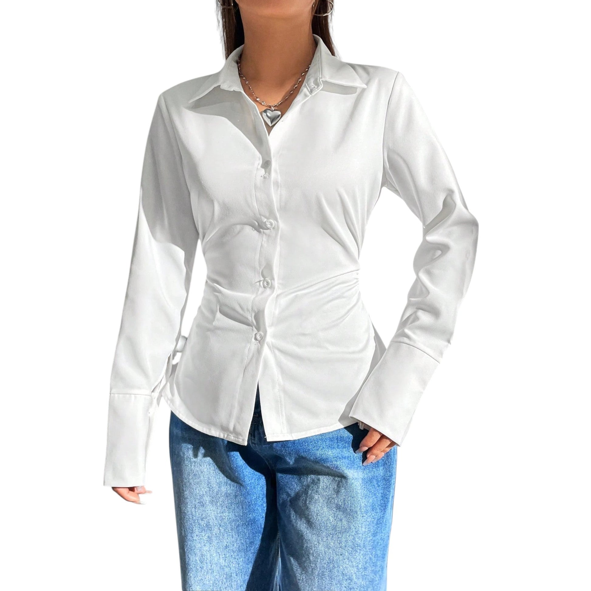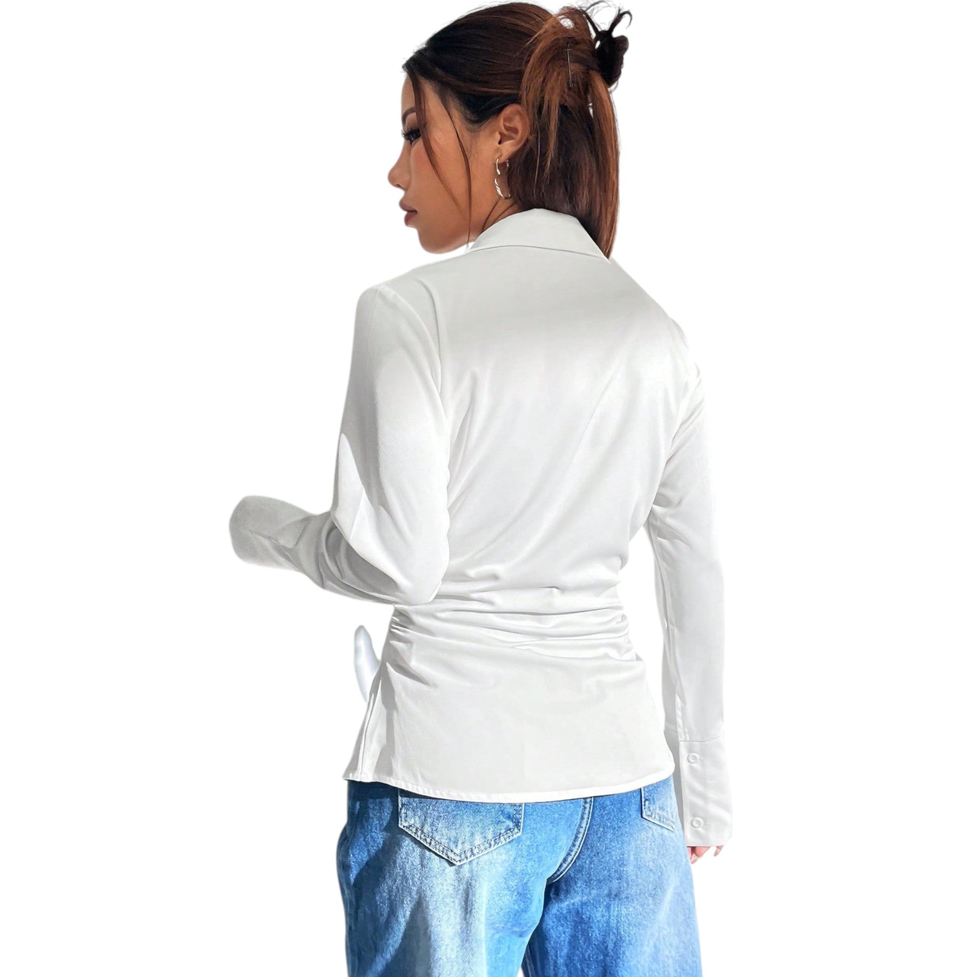 Címke nélküli, fehér, hosszú ujjú, galléros ing, gombos elejű, mandzsettás ujjakkal, derékrészen húzott, anyagában mintás.