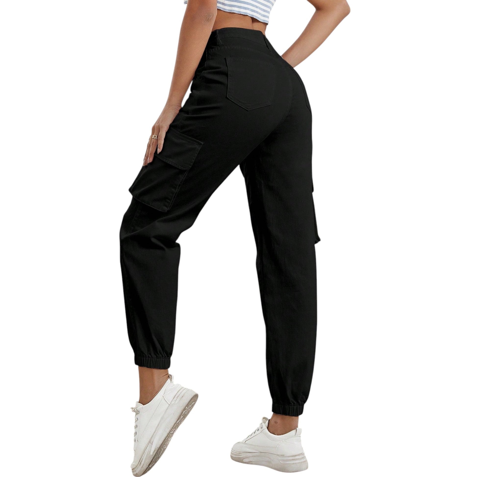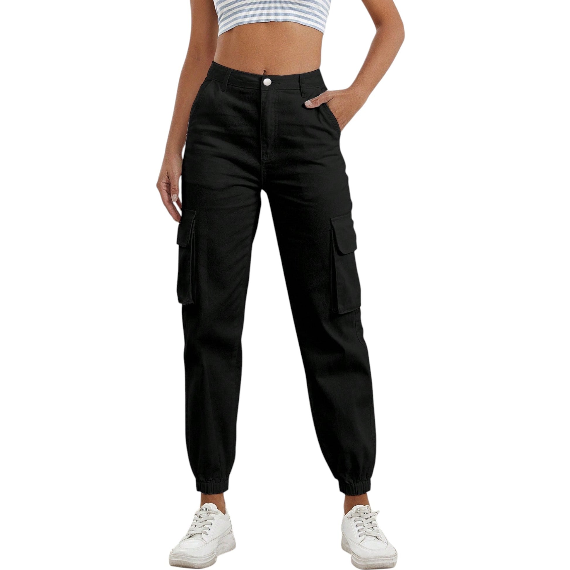 Címke nélküli, fekete, magas derekú jogger cargo nadrág, gumis bokával, oldalsó foltzsebekkel, elöl bevarrt zsebekkel, gombos és cipzáras záródással, övbújtatókkal.