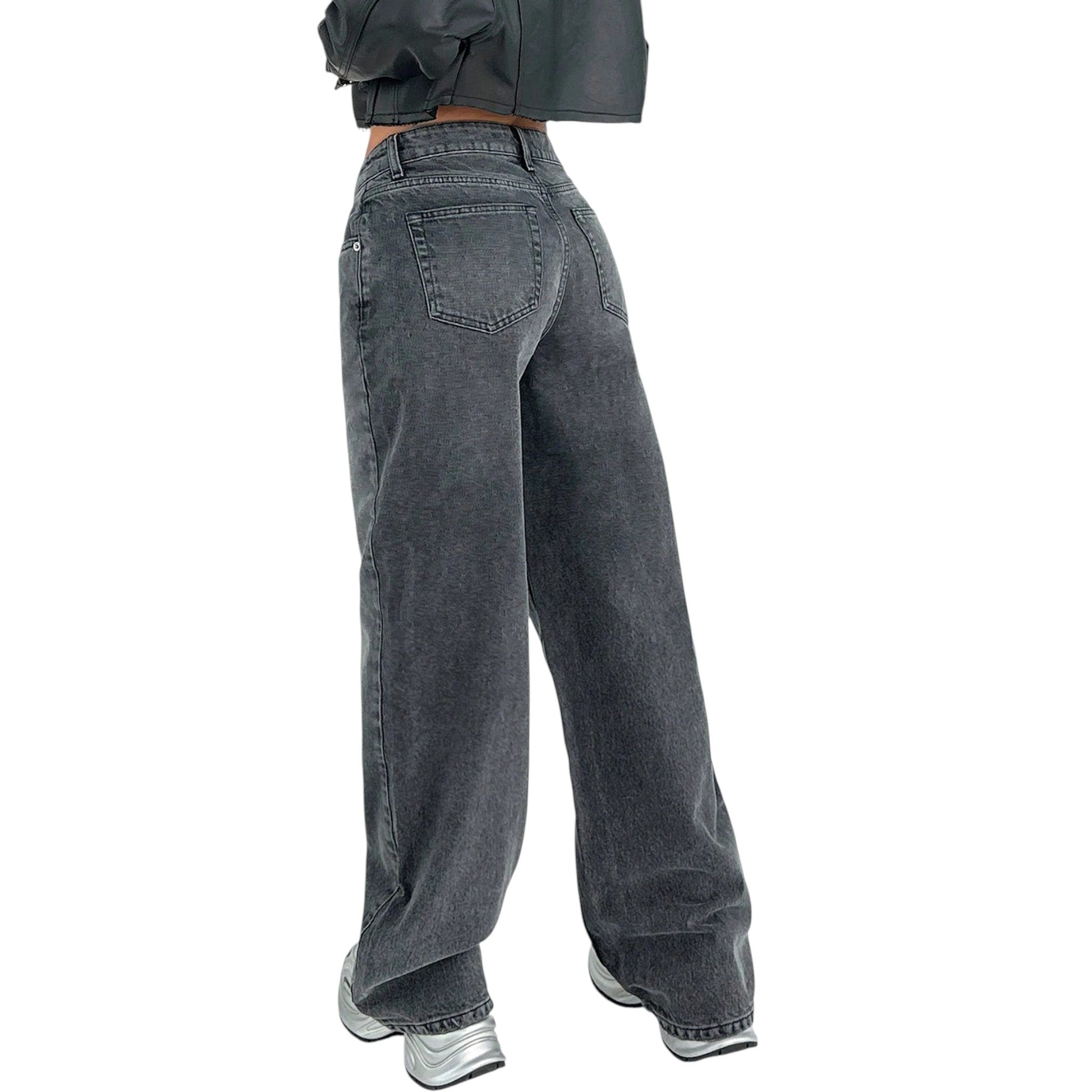 Címke nélküli, szürke, egyenes szárú farmer nadrág, bő szabású, alacsony derekú.