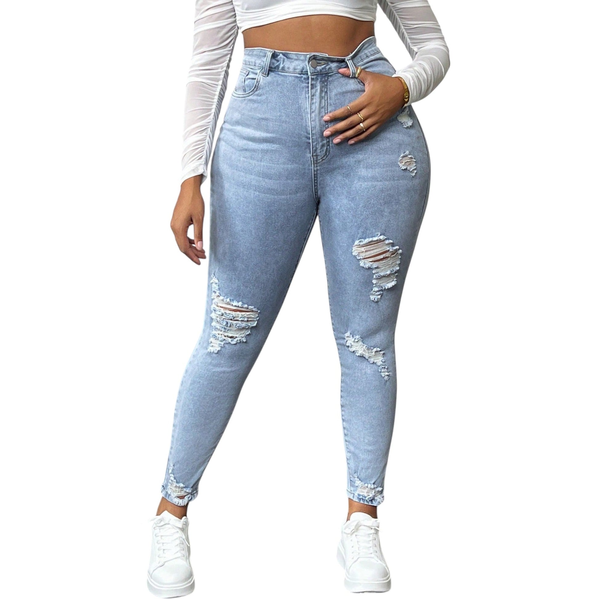 Címke nélküli, világoskék, magas derekú, skinny szabású, szaggatott és koptatott hatású, bokáig érő, zsebes farmer nadrág.