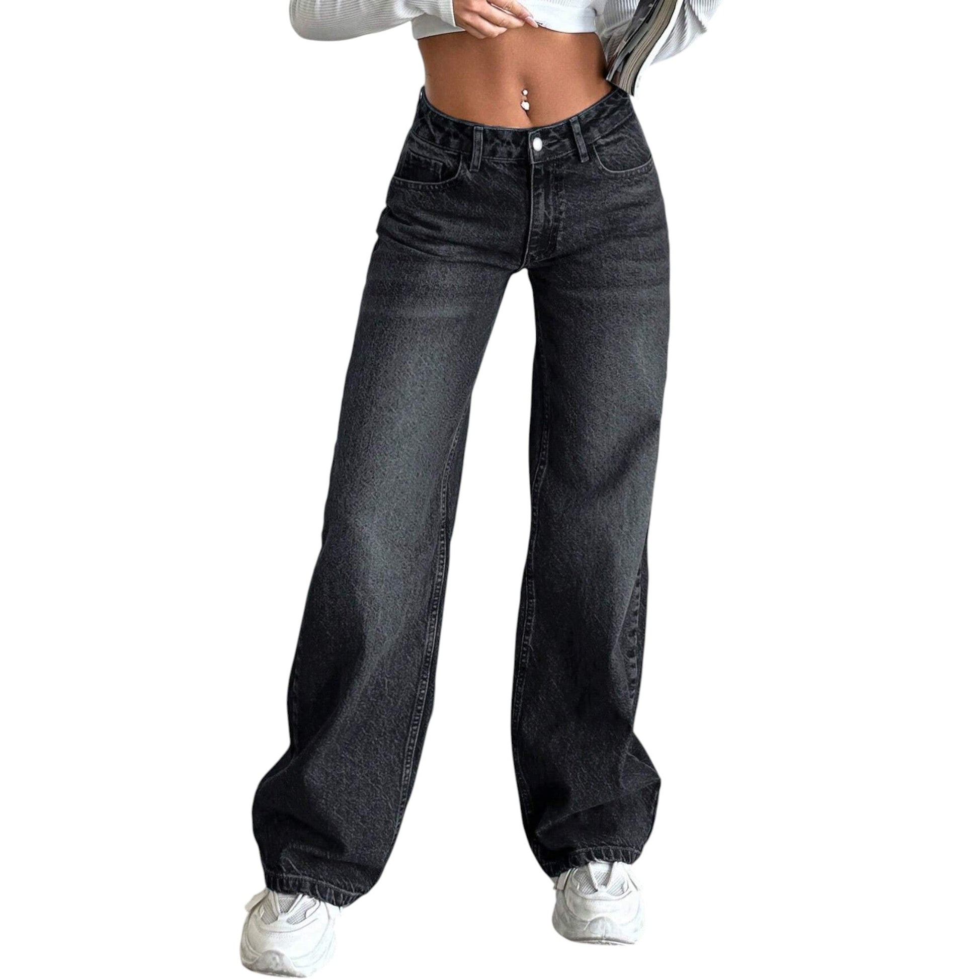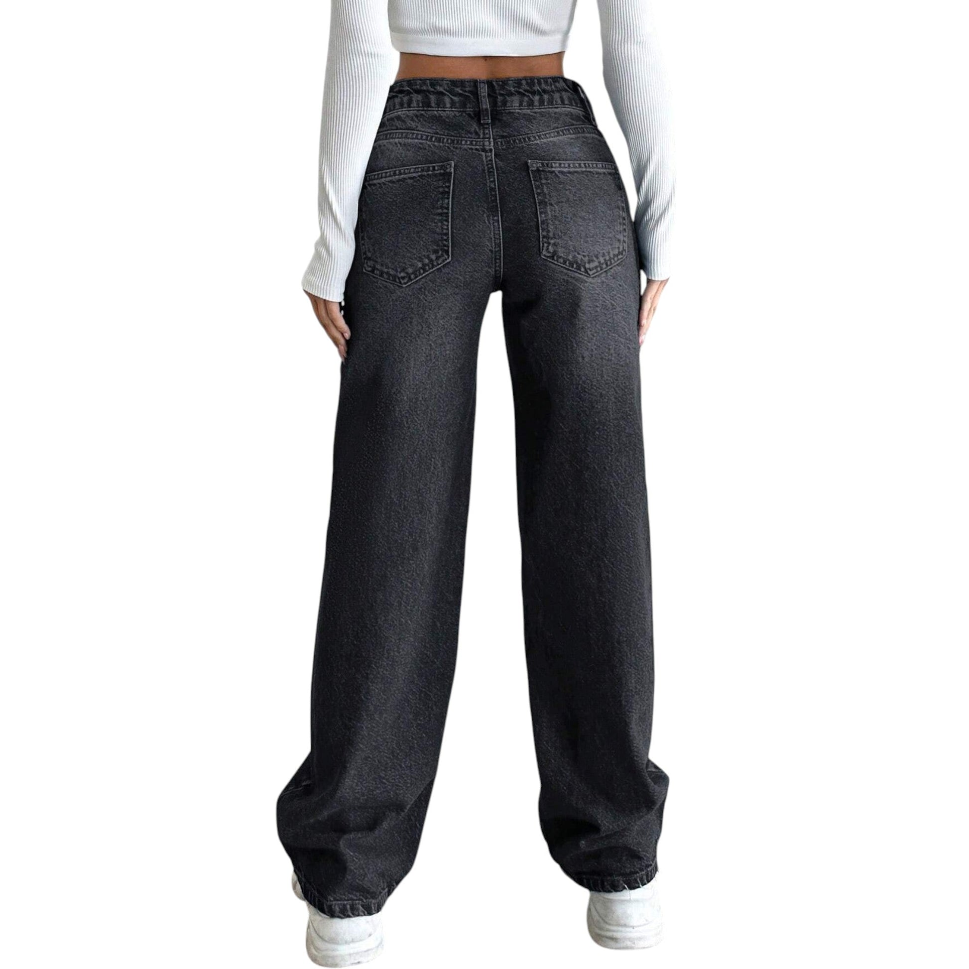 Címke nélküli, szürke, magas derekú, bő szárú farmer nadrág.
