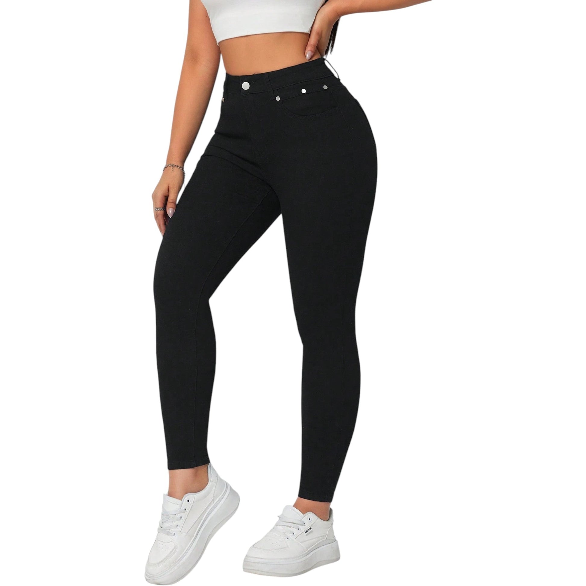 Címke nélküli, fekete, magas derekú, slim fit farmer nadrág, fehér gombokkal.