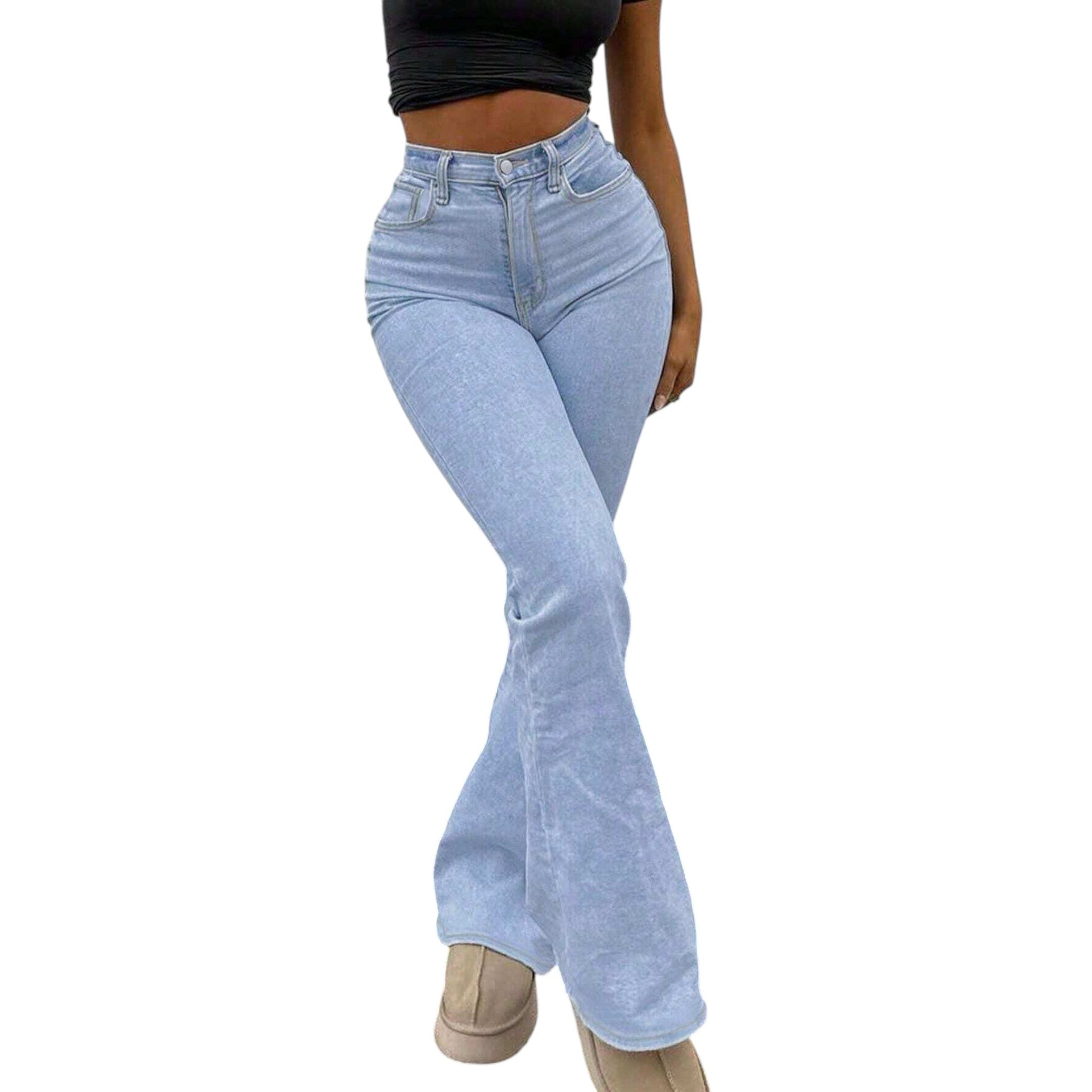Címke nélküli, világoskék, magas derekú, trapéz szárú farmer nadrág.
