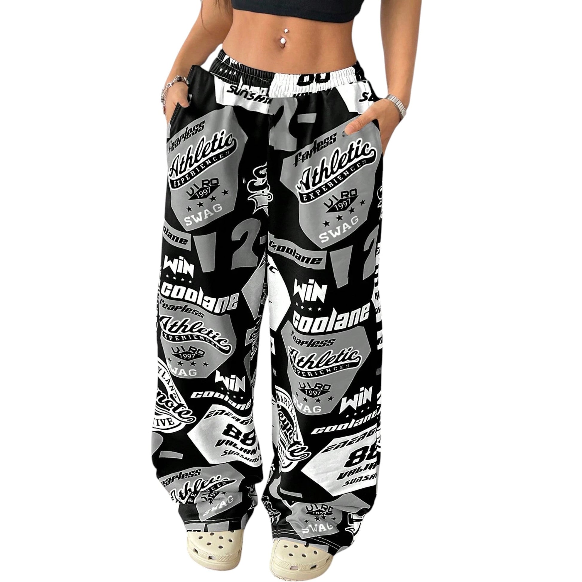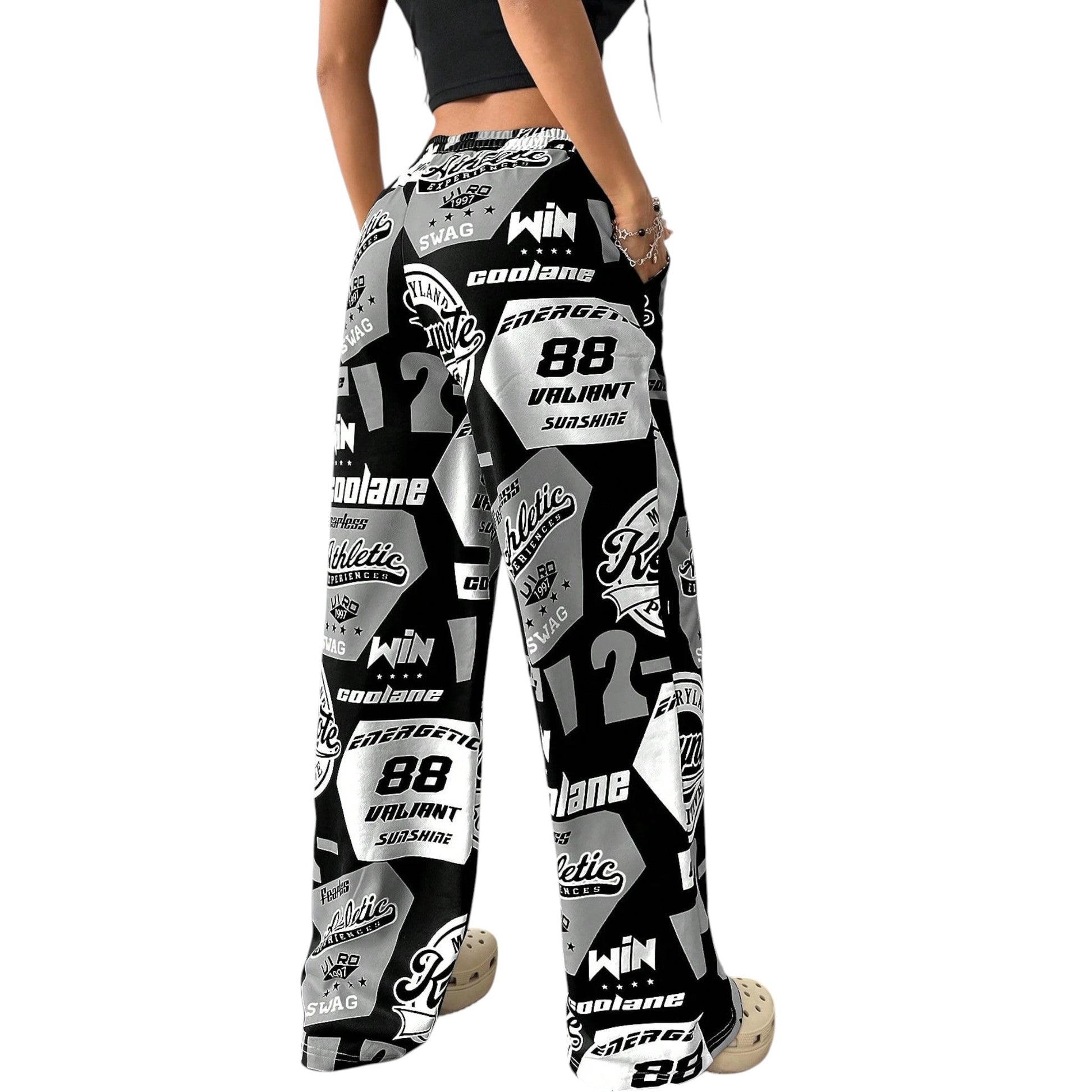 Címke nélküli, fekete-fehér, mintás, bő szabású, gumírozott derekú, zsebes, melegítő nadrág.