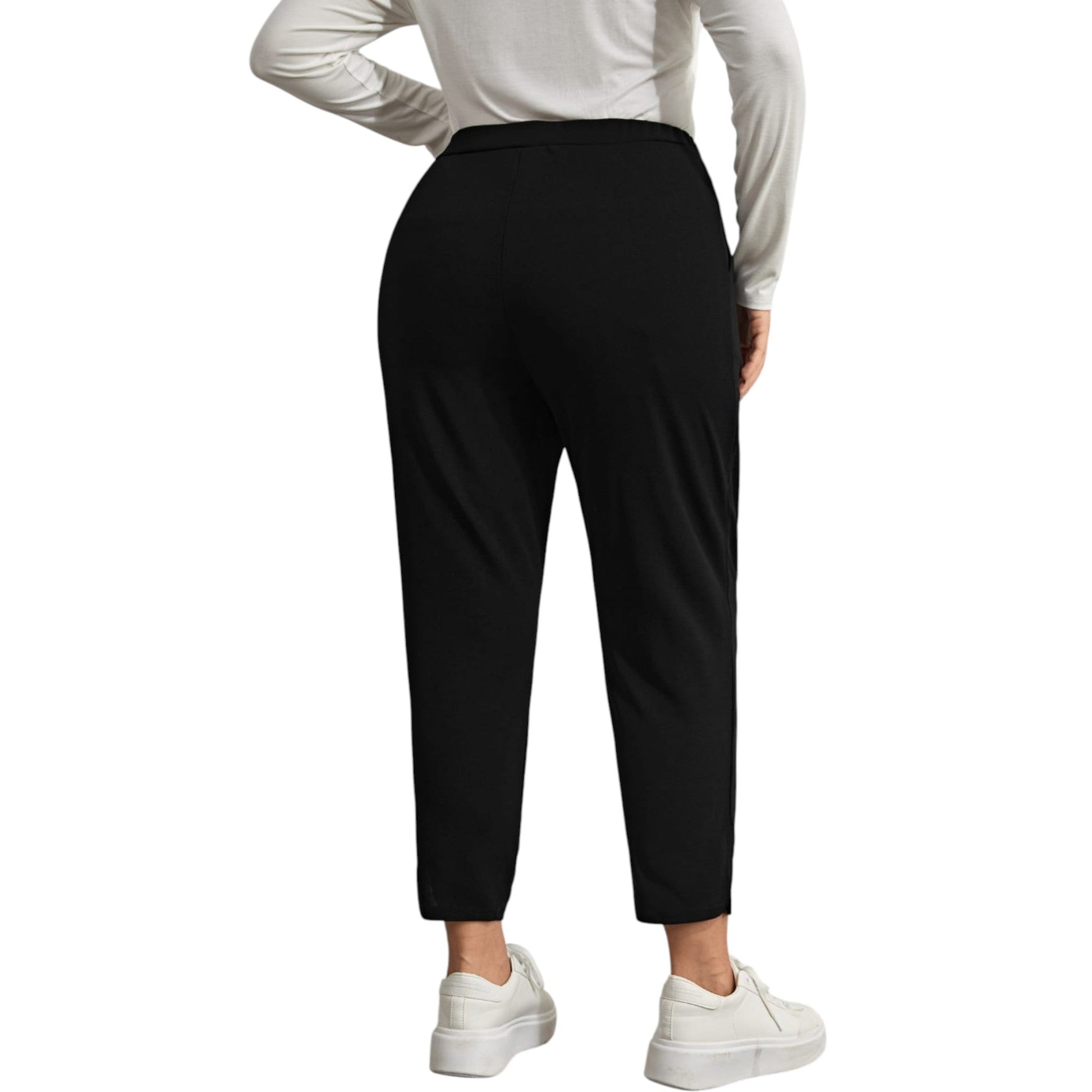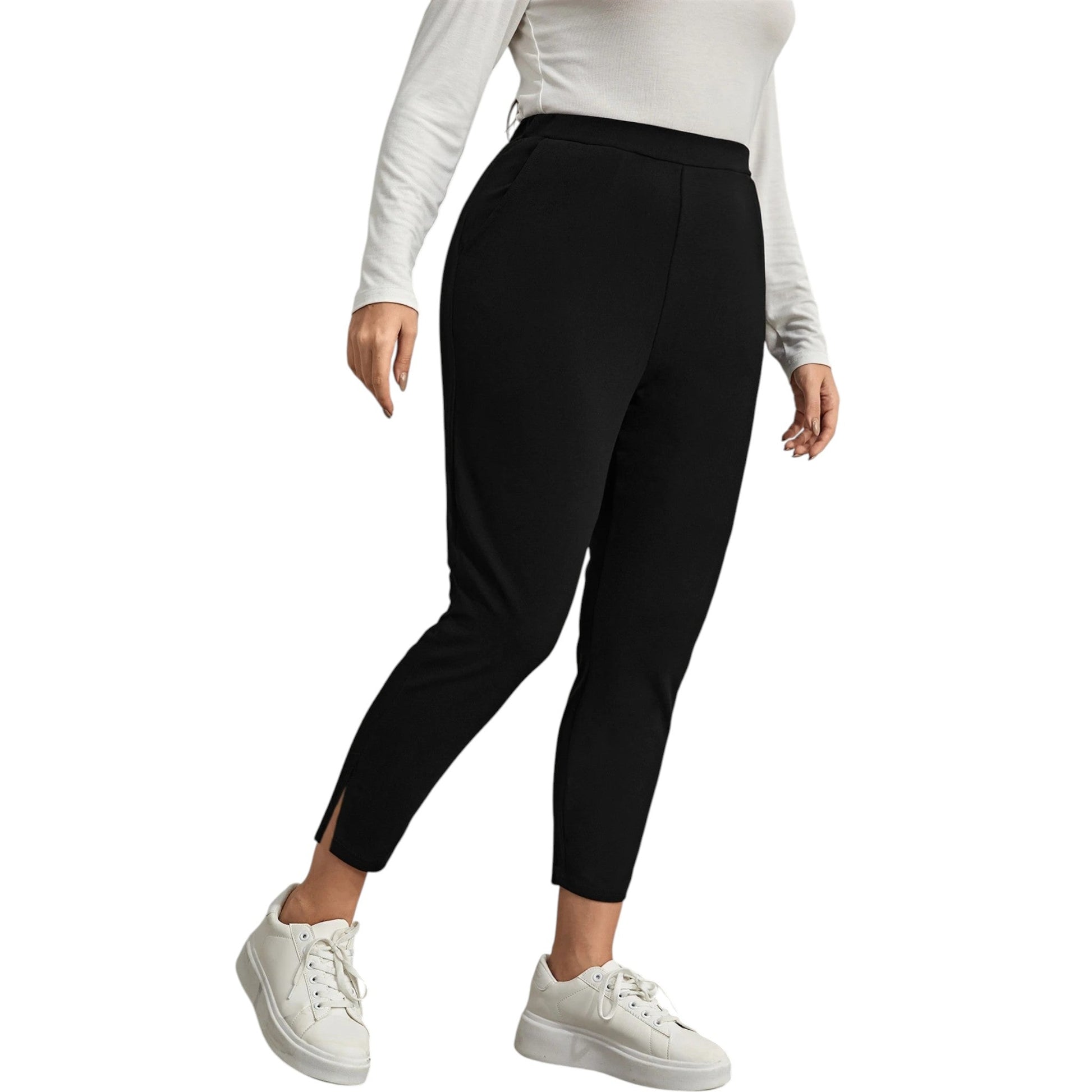 Címke nélküli, fekete, bokáig érő nadrág, enyhén szűkülő szárú, oldalt sliccelt szegéllyel, rugalmas derekú, elöl zsebekkel.
