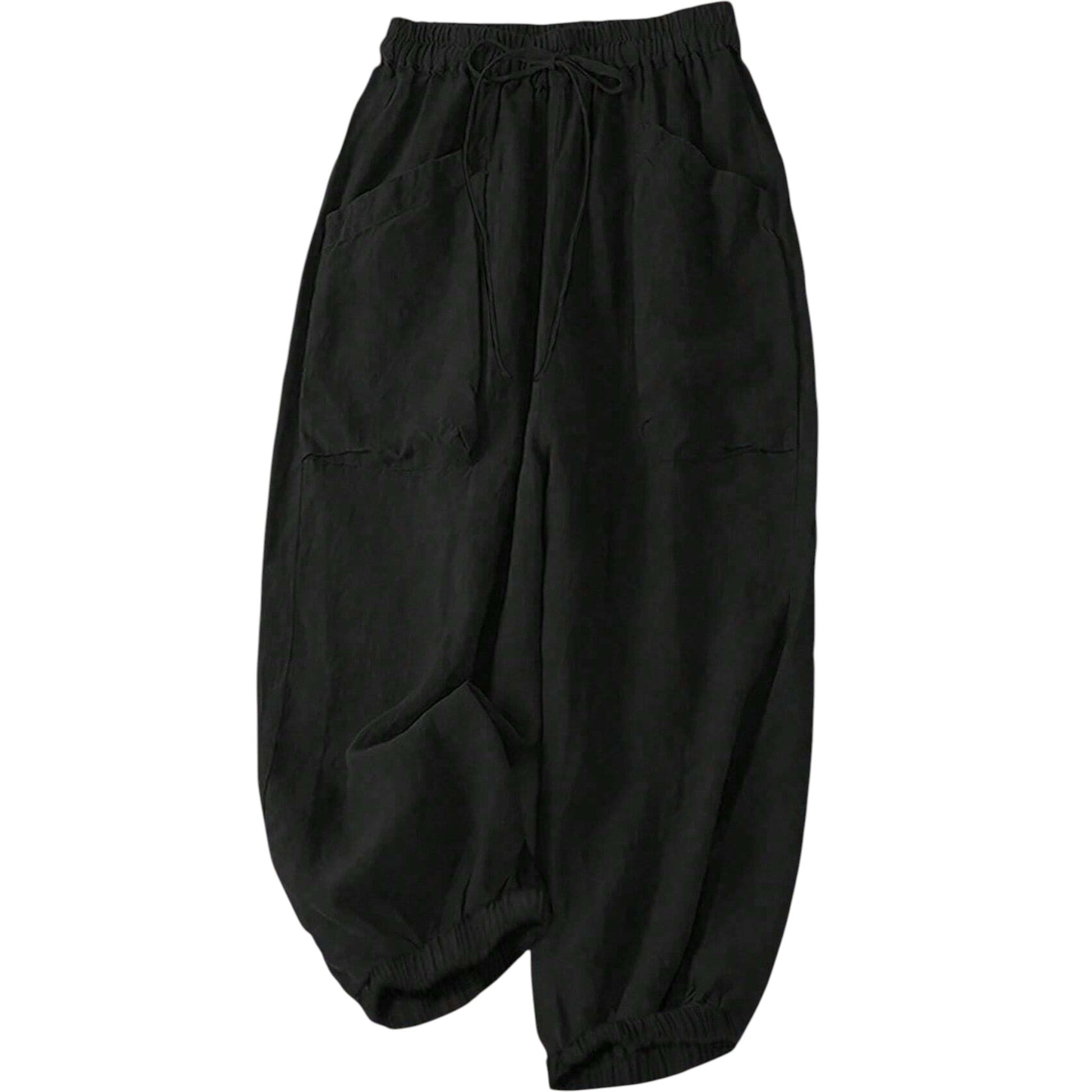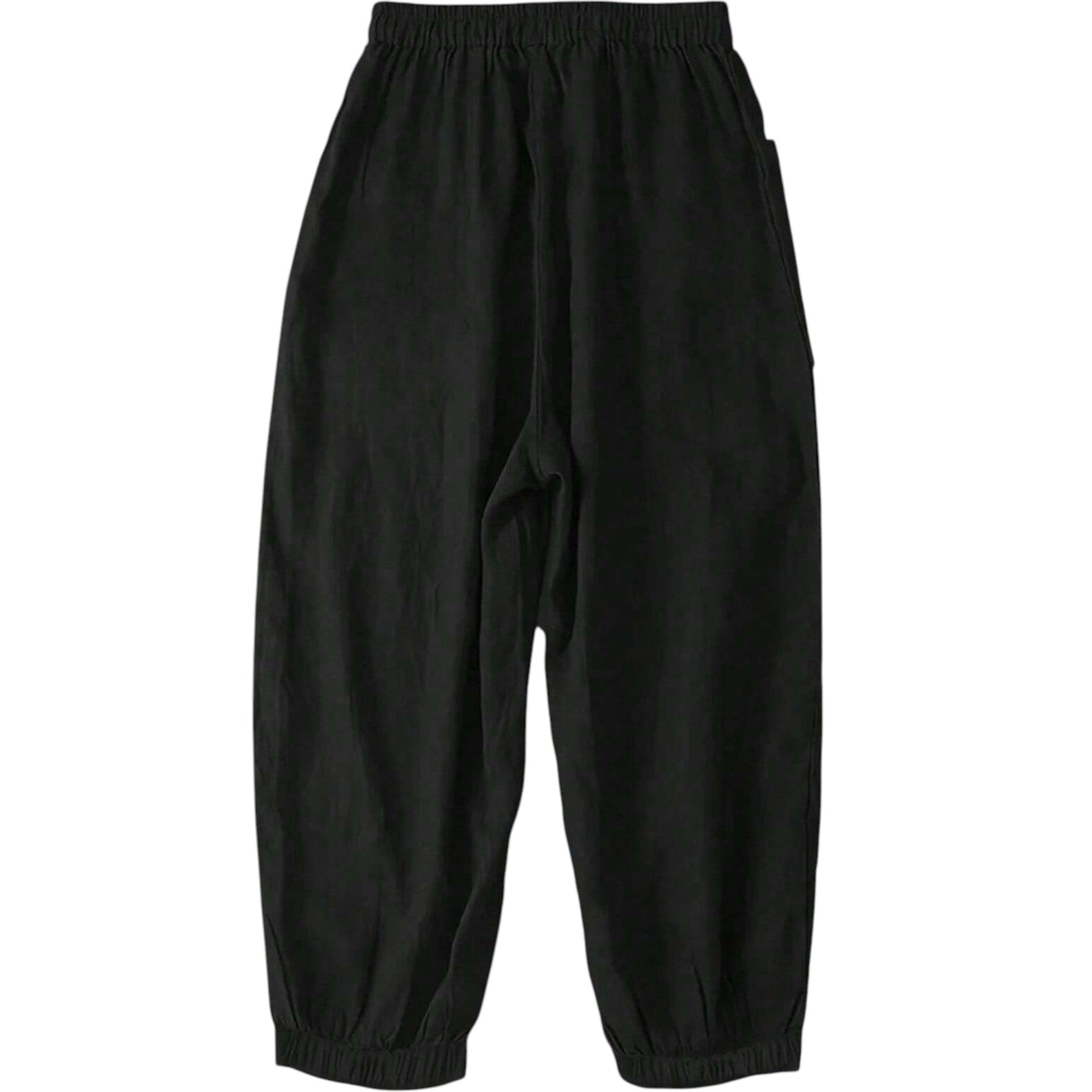 Címke nélküli, fekete, bő szabású, gumírozott derekú, húzózsinóros, oldalsó zsebekkel, gumírozott bokával.