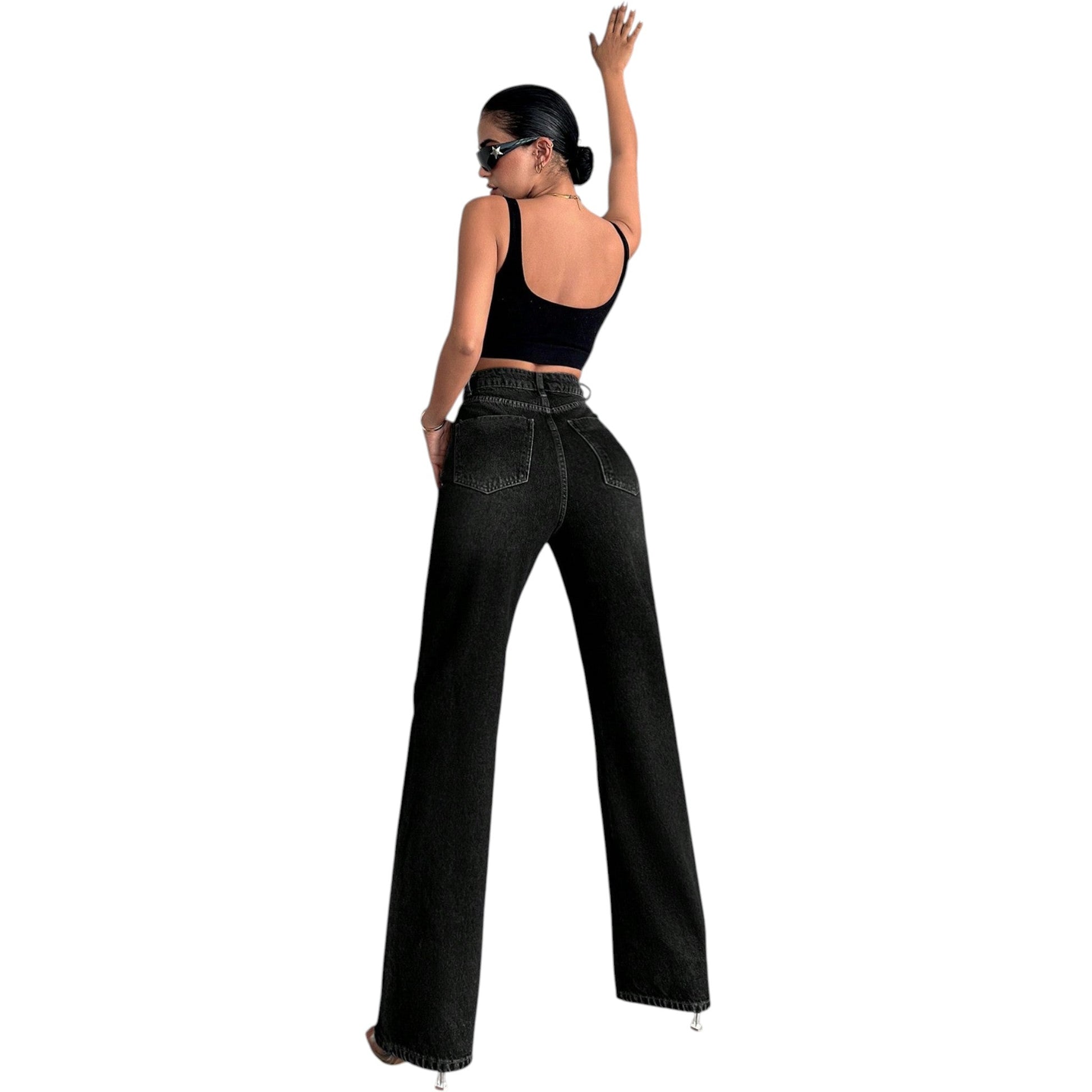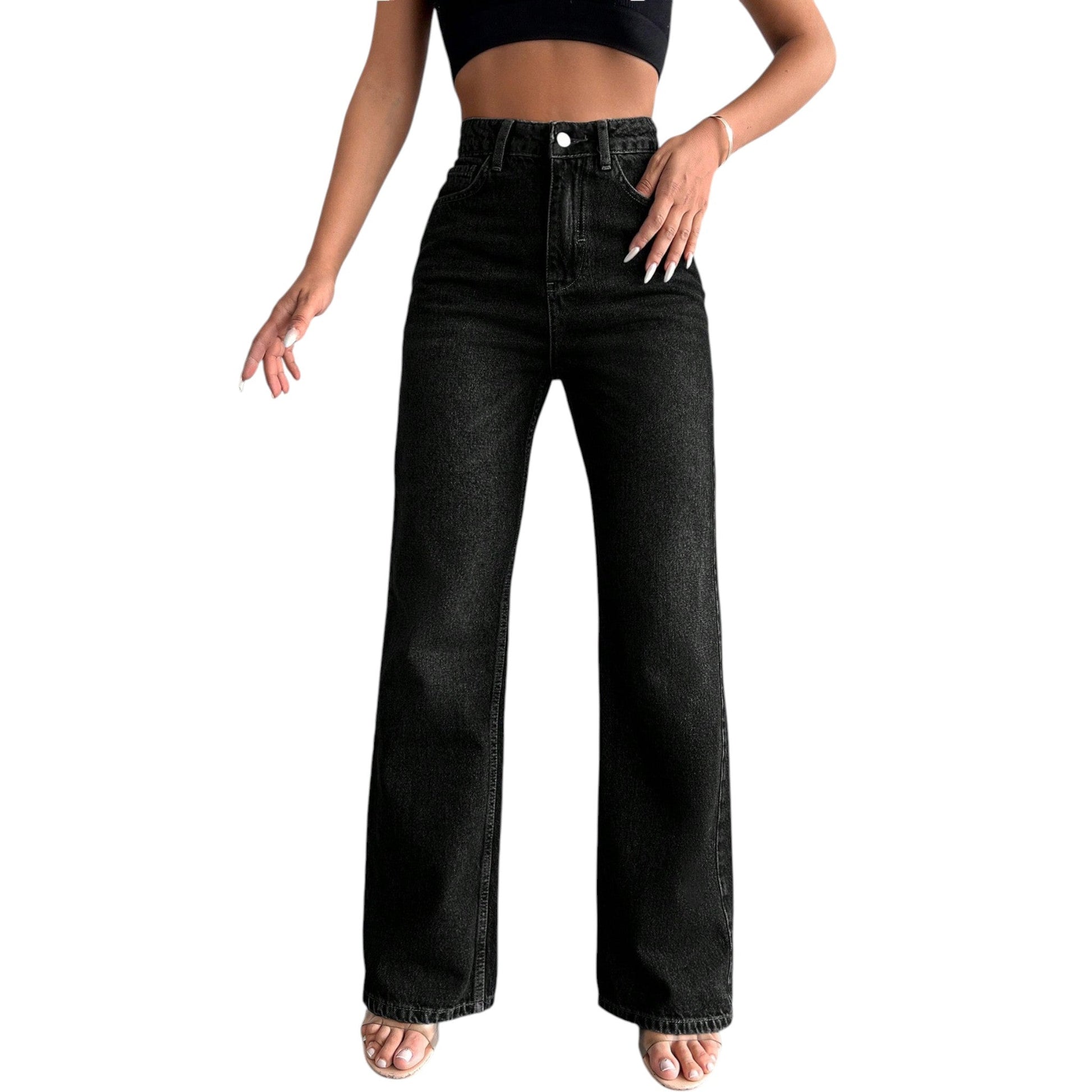 Címke nélküli, fekete, magas derekú, bő szárú, gombos és cipzáras záródású, zsebes farmer nadrág.