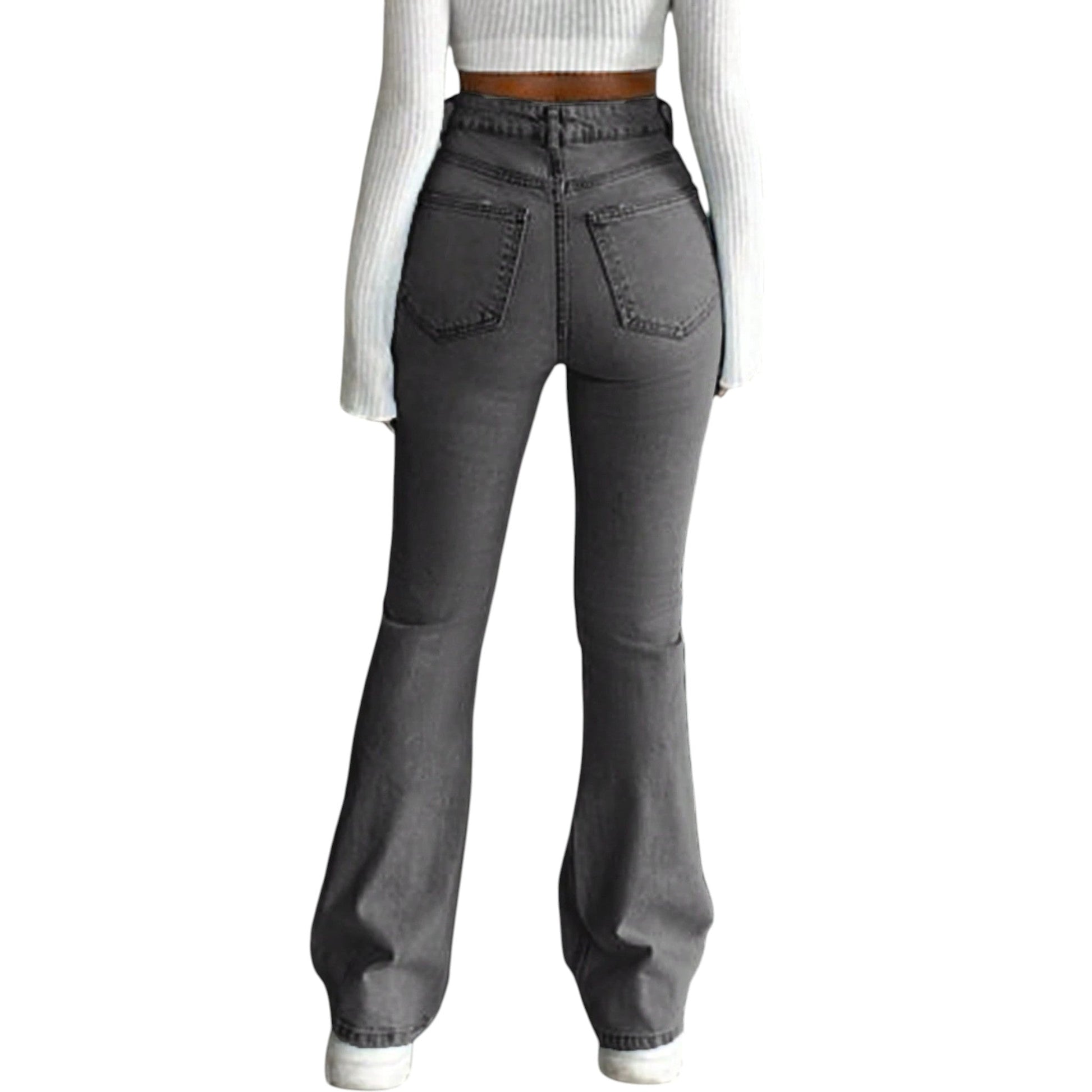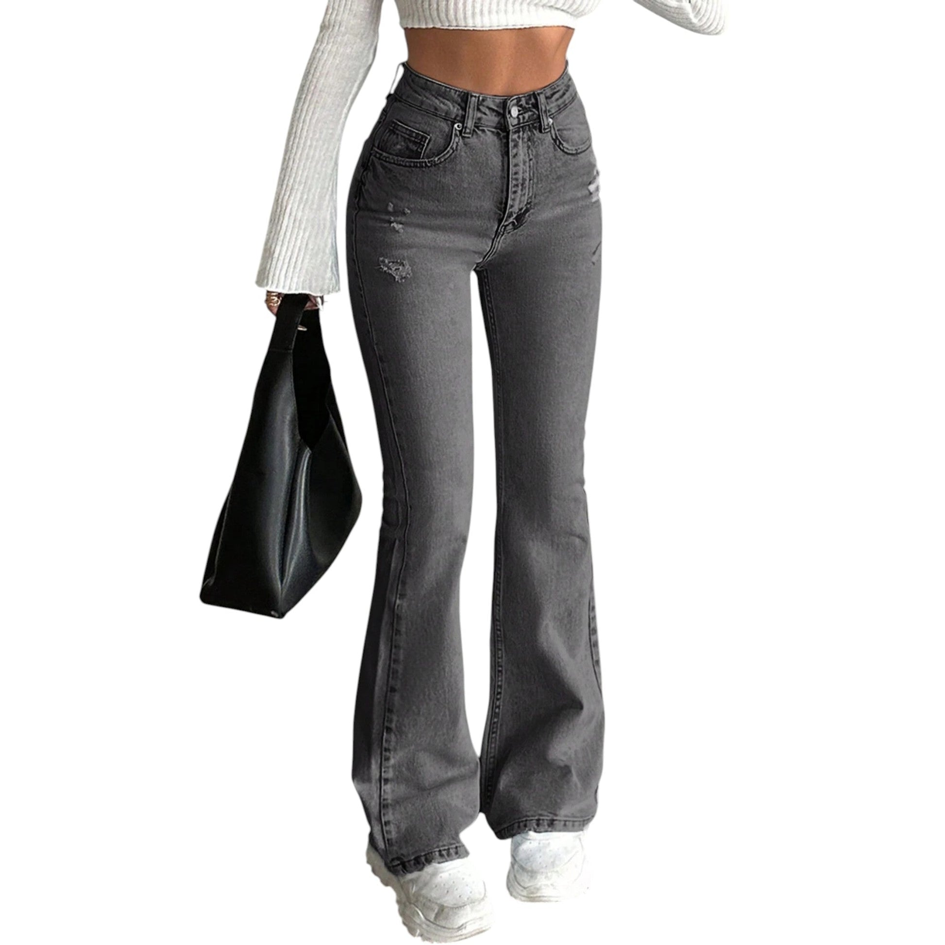 Címke nélküli, szürke, szaggatott, magas derekú, trapéz szárú flare farmer nadrág.