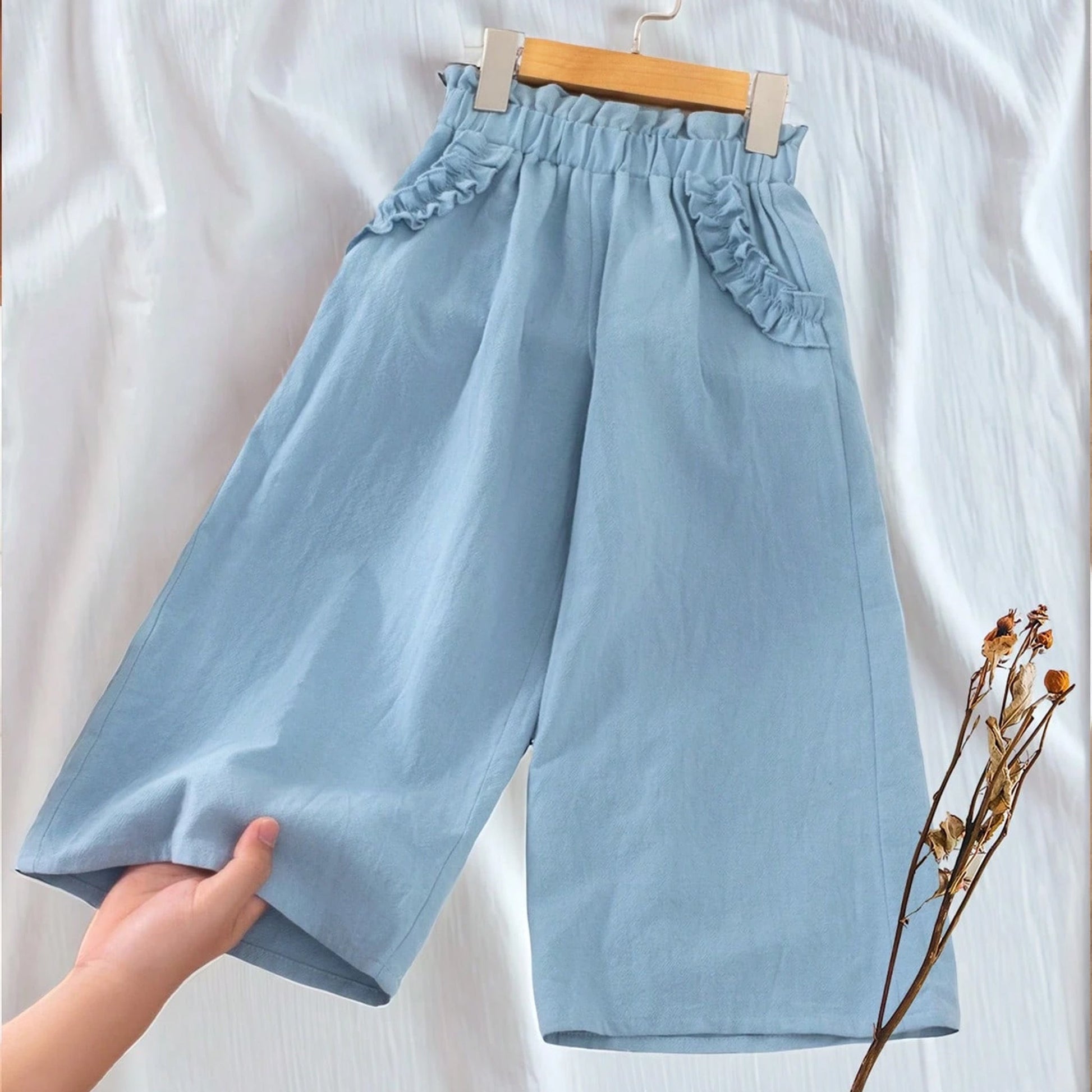 Címke nélküli, világoskék, rugalmas derekú, fodros zsebekkel, bő szárú, crop hosszúságú nadrág.