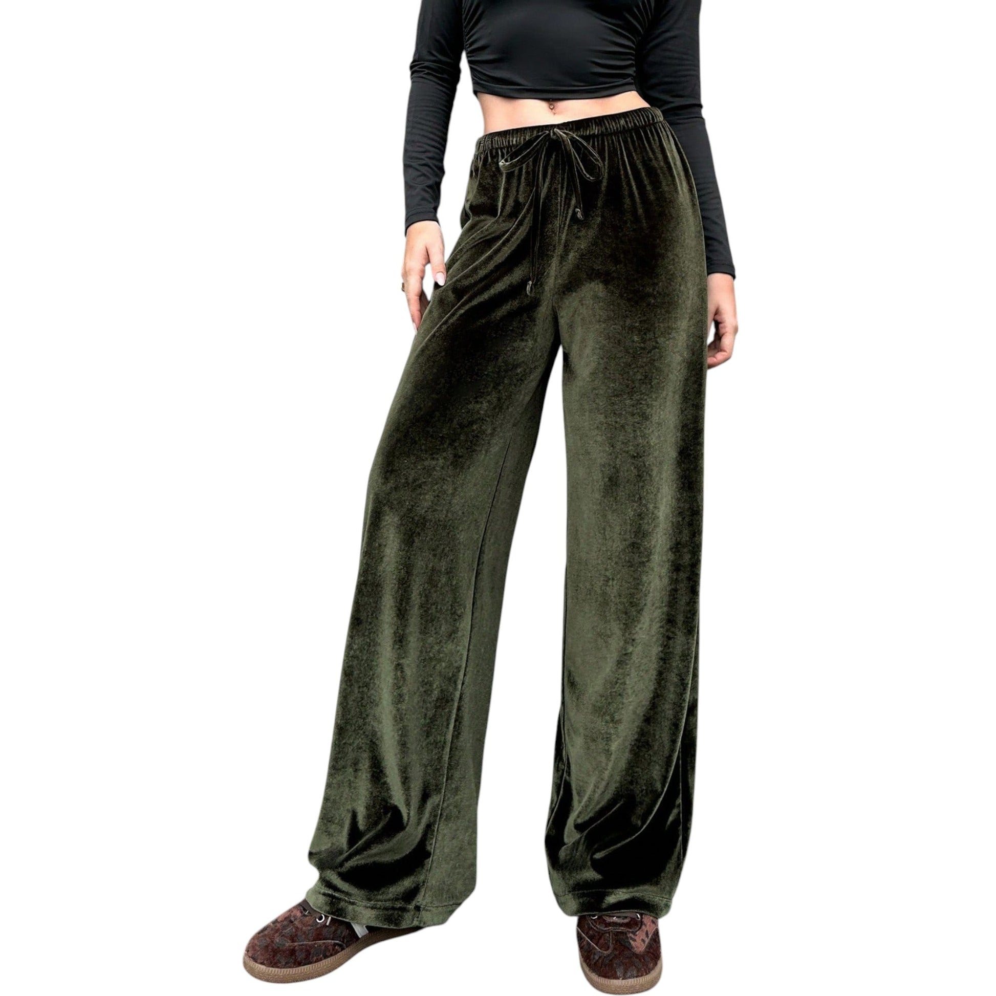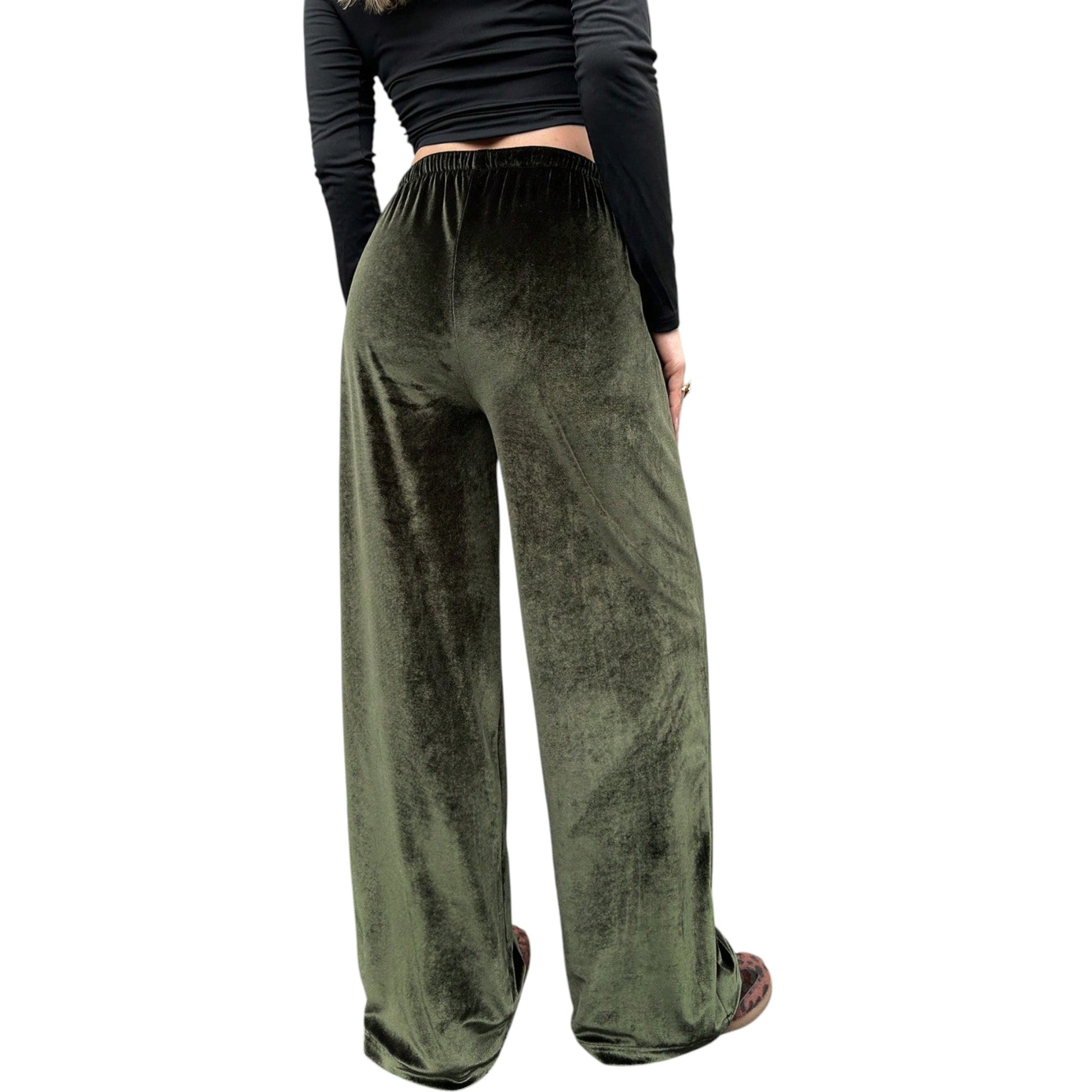 Címke nélküli, sötétzöld, bársony anyag, magas derekú, megkötős derekú, széles szárú, oldalt zsebek.
