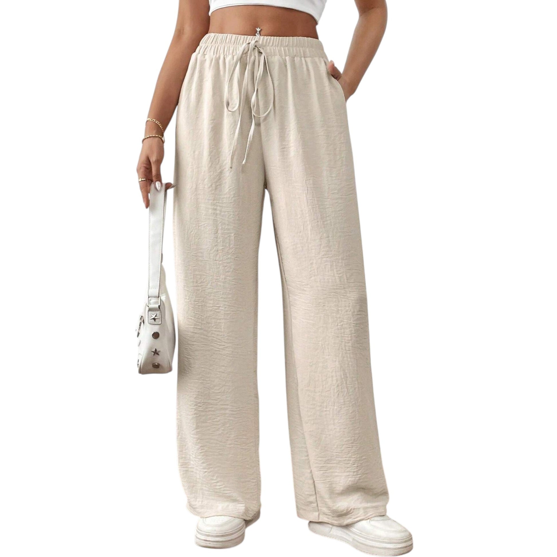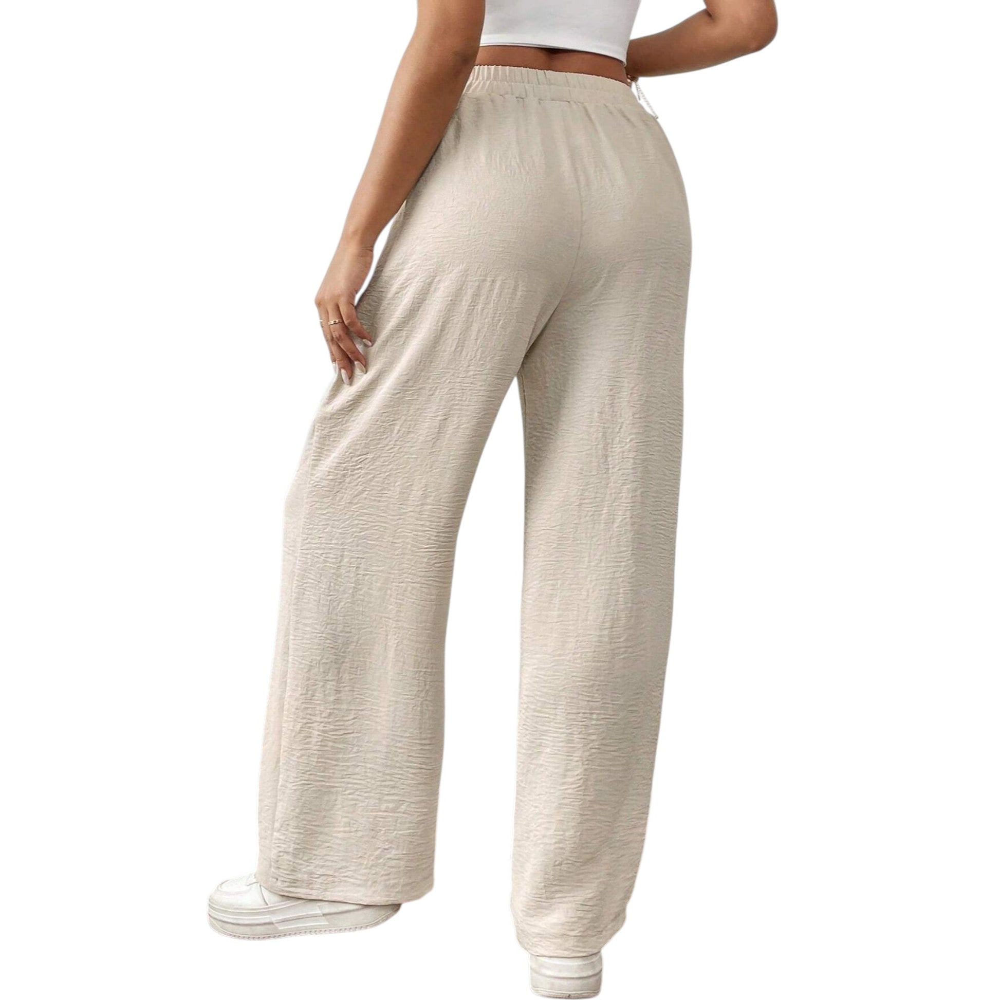 Címke nélküli, bézs, magas derekú, pliszírozott anyagú bő szárú nadrág, megkötős gumis derékkal, oldalsó zsebekkel.
