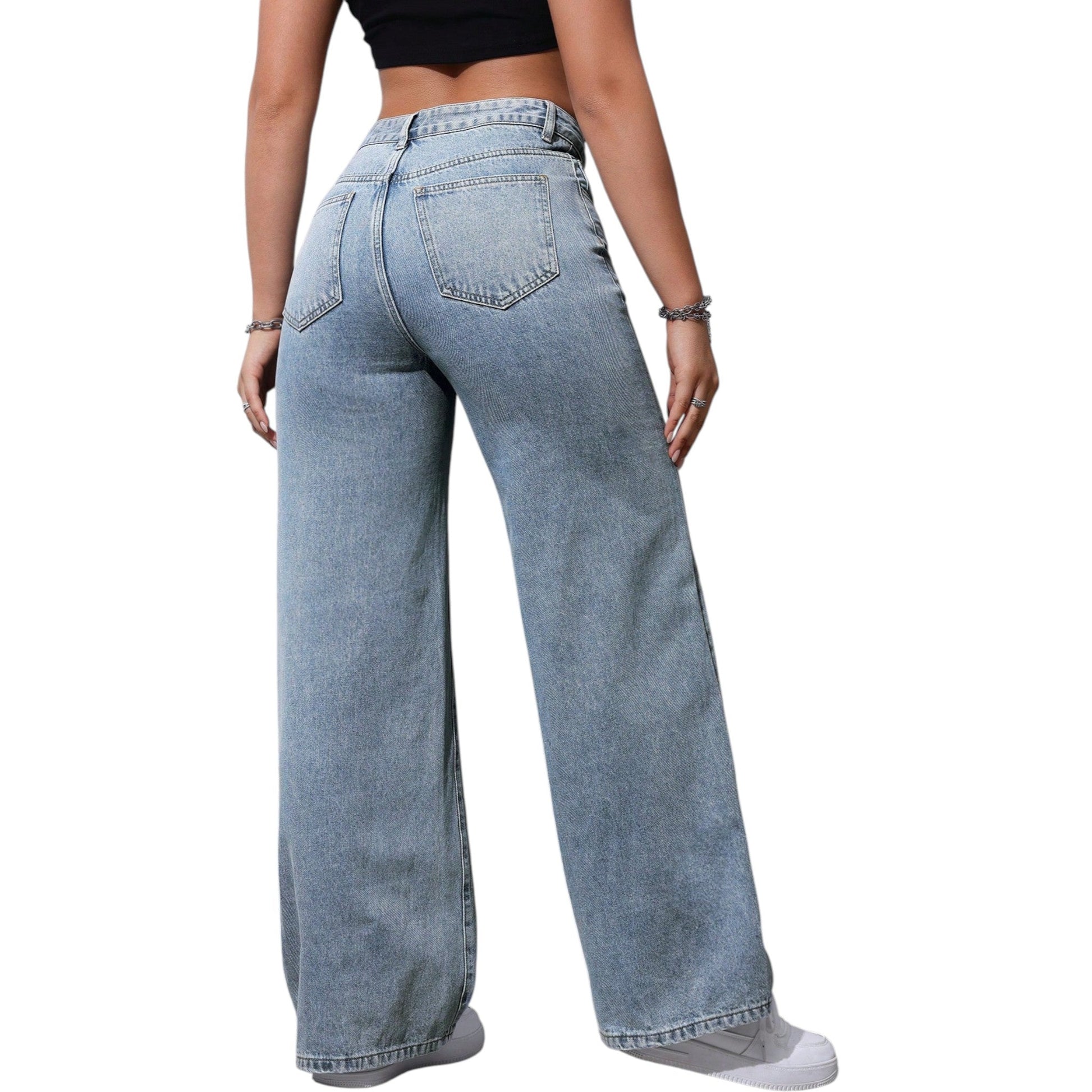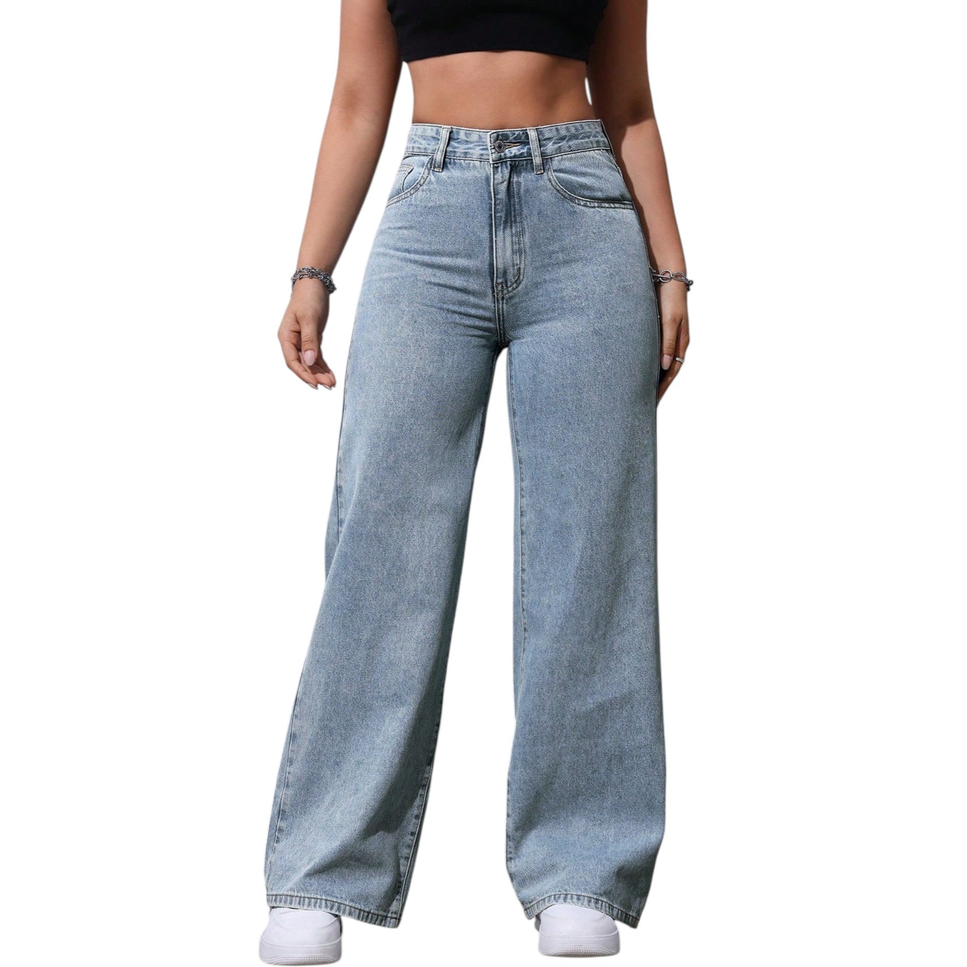 Címke nélküli, világoskék, magas derekú bő szárú farmer nadrág, gombos és cipzáras záródással, elöl és hátul zsebekkel, enyhén mosott hatással.