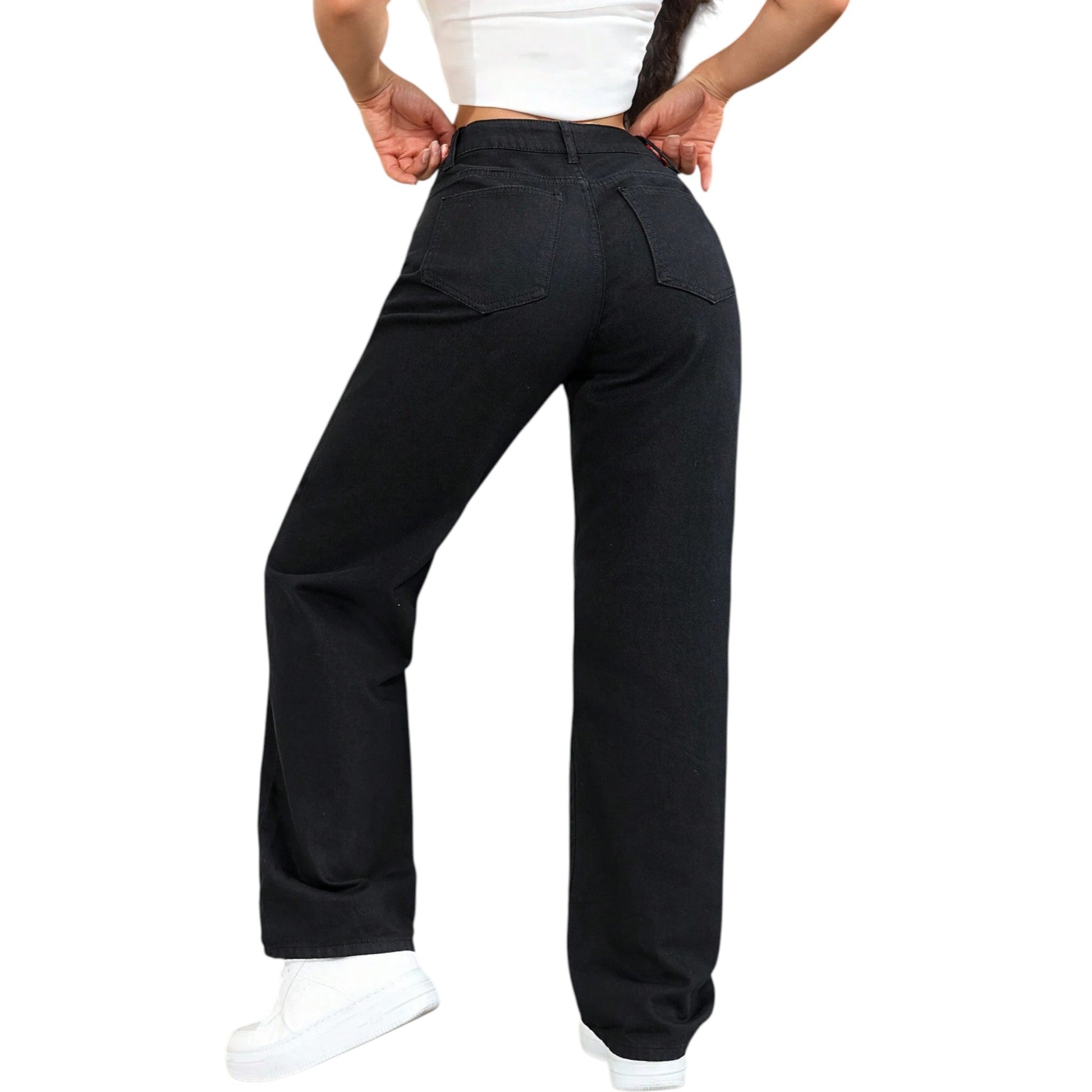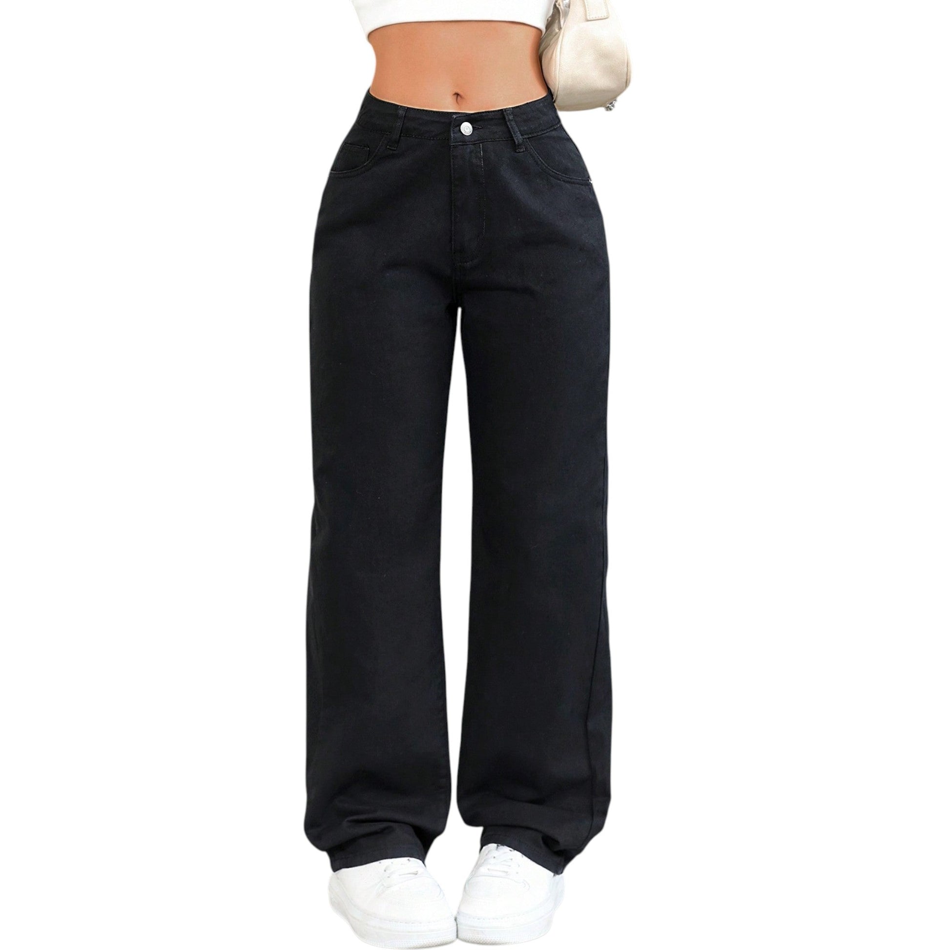 Címke nélküli, fekete, magas derekú bő szárú farmer nadrág, gombos és cipzáras záródással, elöl és hátul zsebekkel.