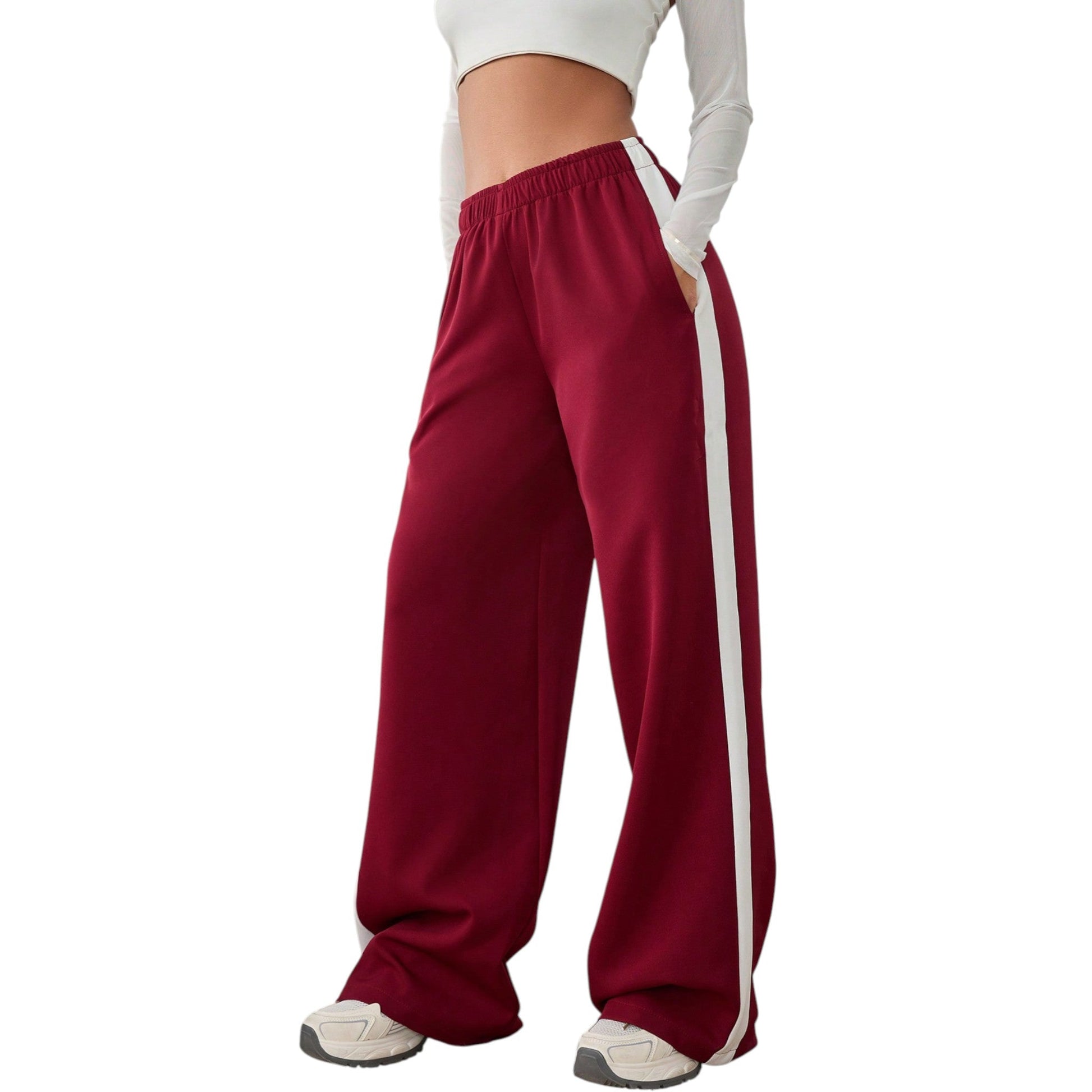 Címke nélküli, bordó, magas derekú, gumis derekú szabadidő nadrág megkötővel, bő szárral, oldalsó fehér csíkokkal és oldalsó zsebekkel.