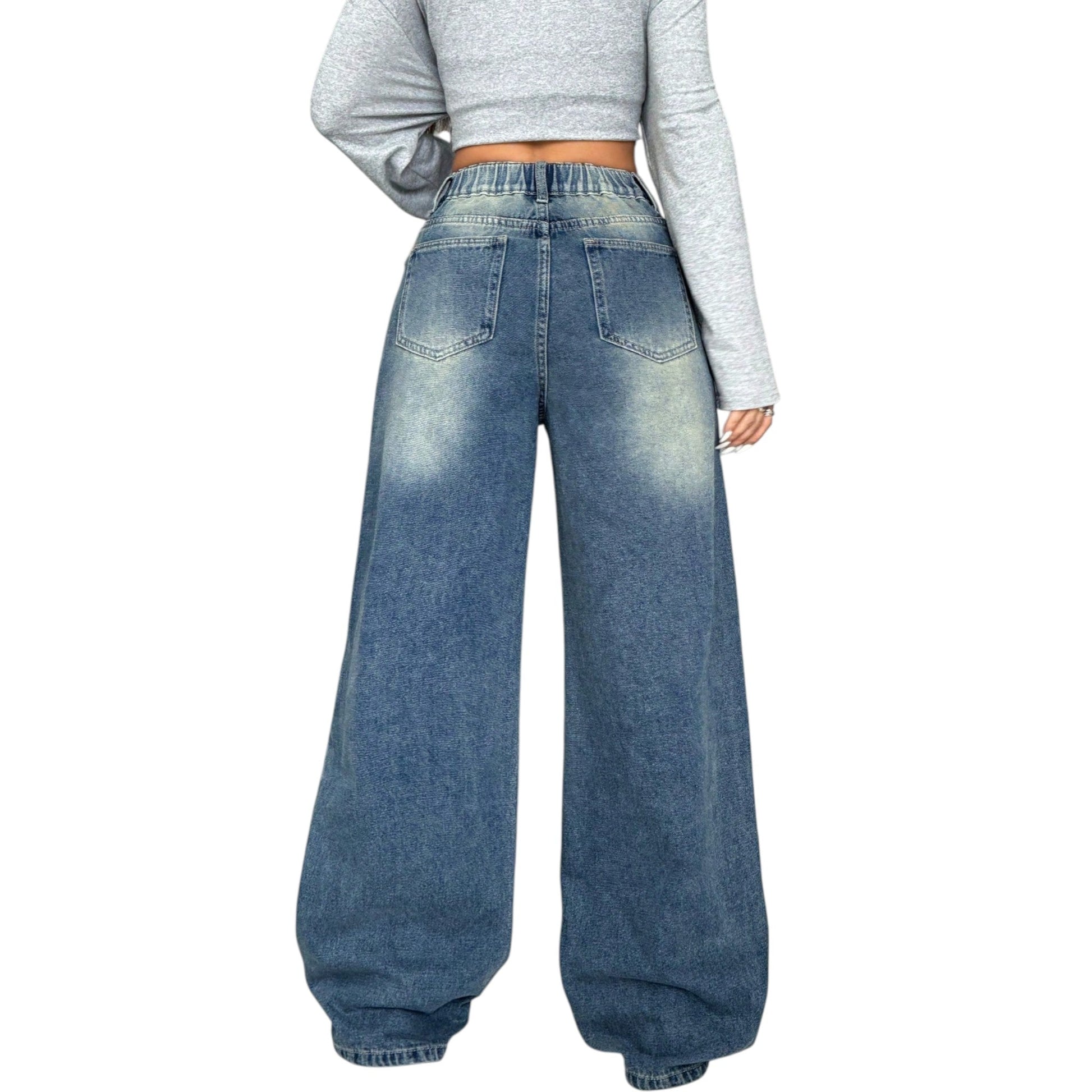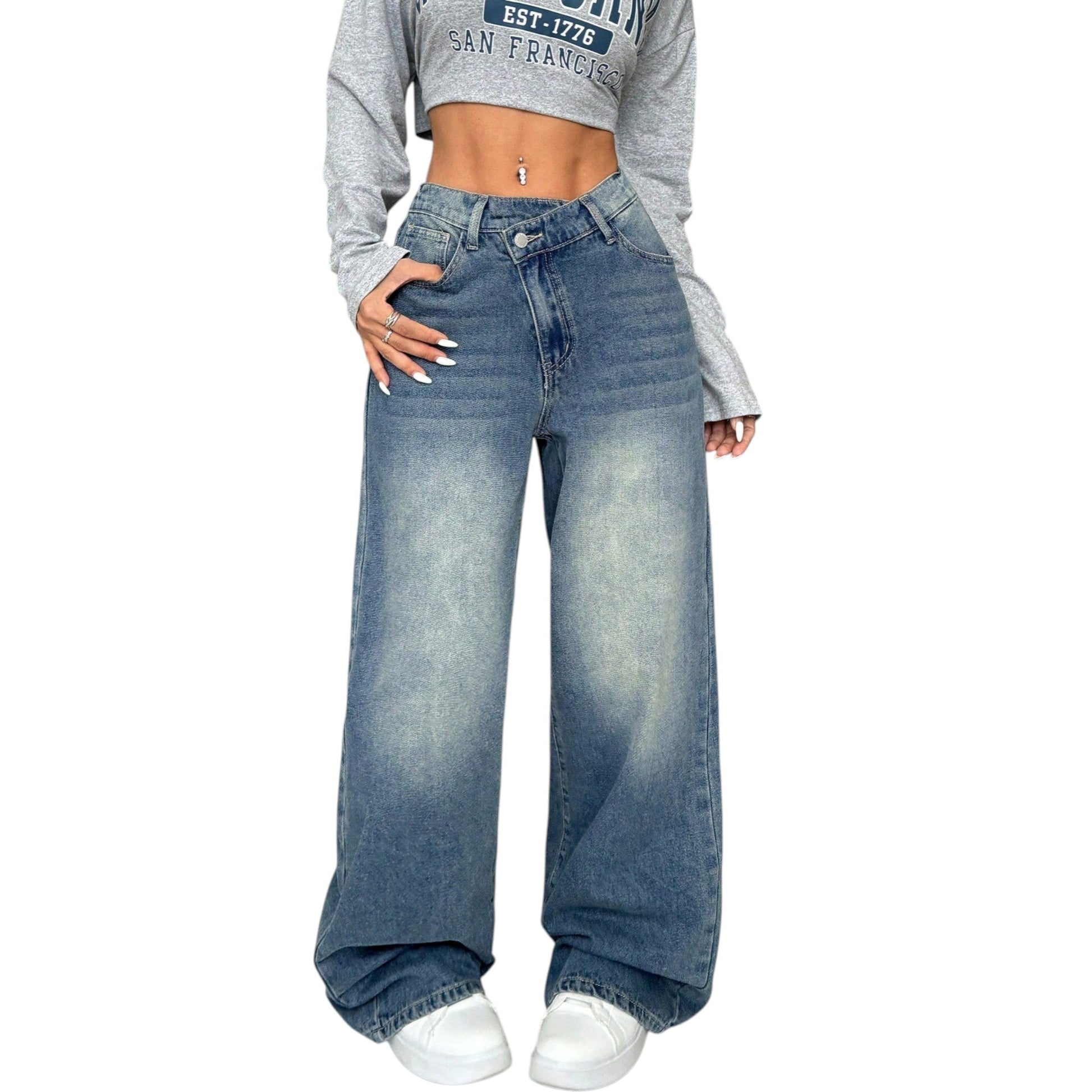 Címke nélküli, kék, magas derekú, asszimetrikus derekú, mosott hatású bő szárú farmer nadrág, gombos és cipzáras záródással, elöl és hátul zsebekkel.