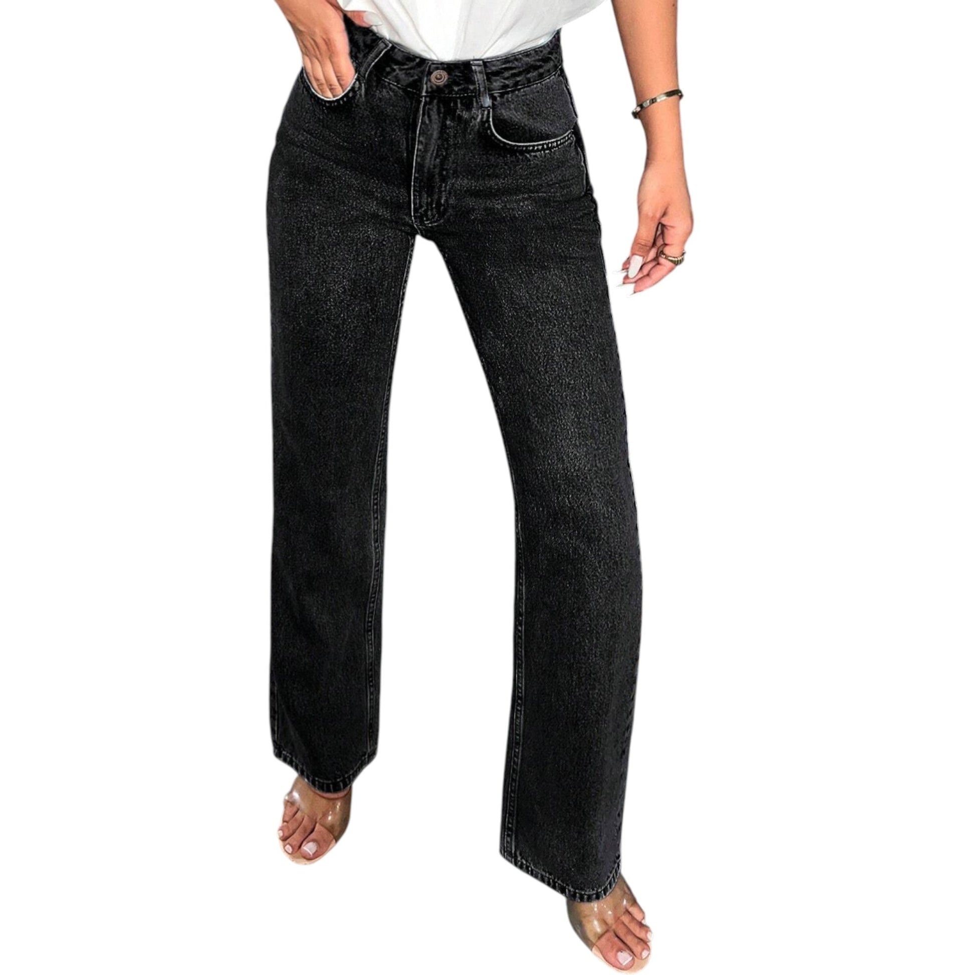 Címke nélküli, fekete, magas derekú, egyenes szárú, enyhén koptatott farmer.