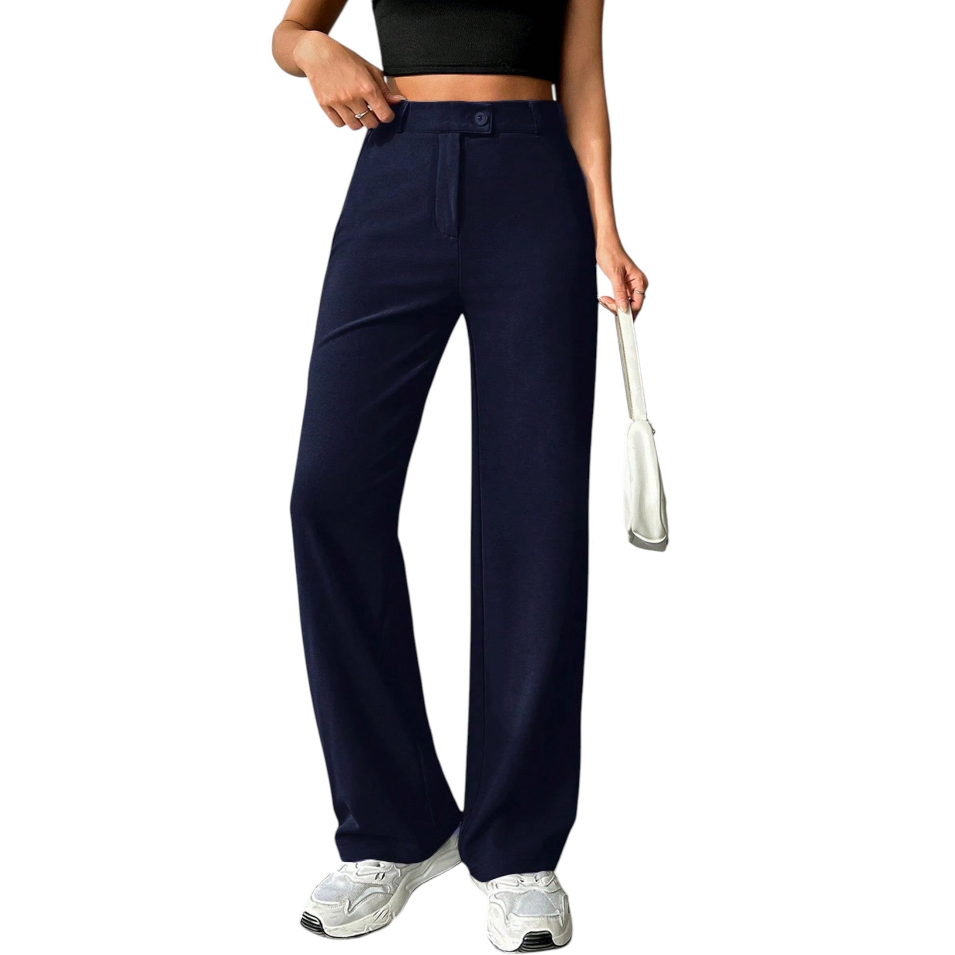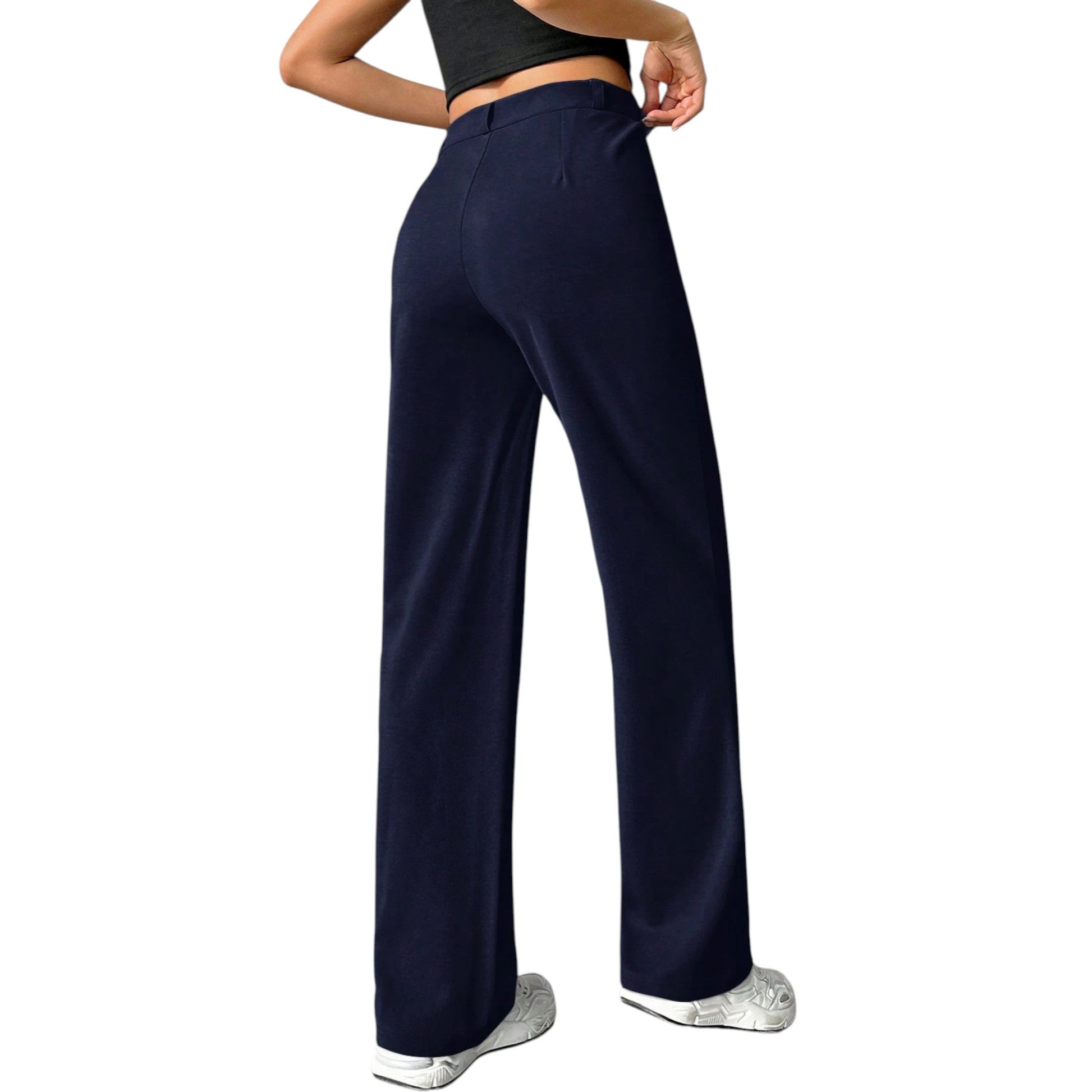 Címke nélküli, sötétkék, magas derekú, bő szárú nadrág, rejtett cipzáras és gombos záródással, elöl díszvarrásokkal, övbújtatókkal, oldalsó zsebekkel.