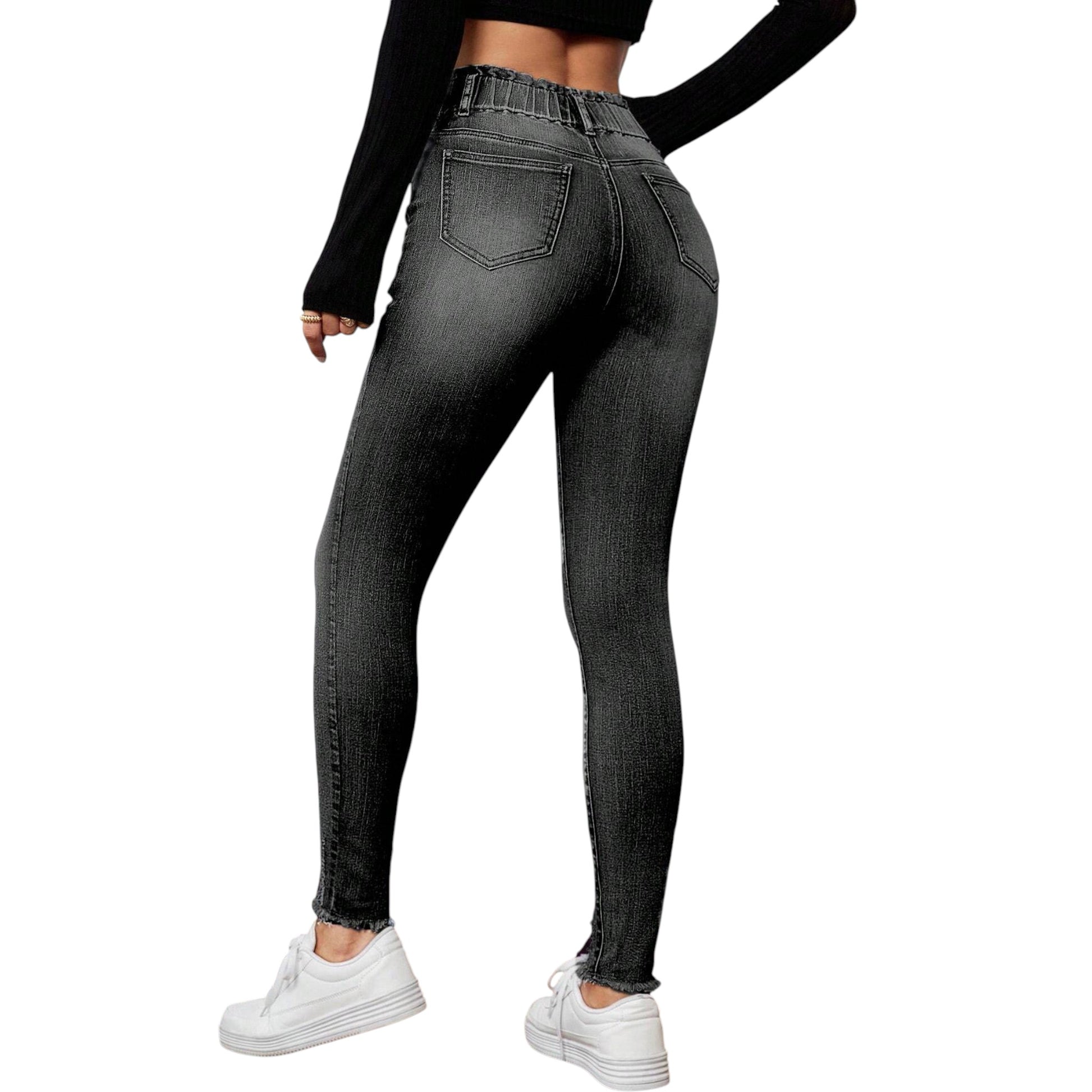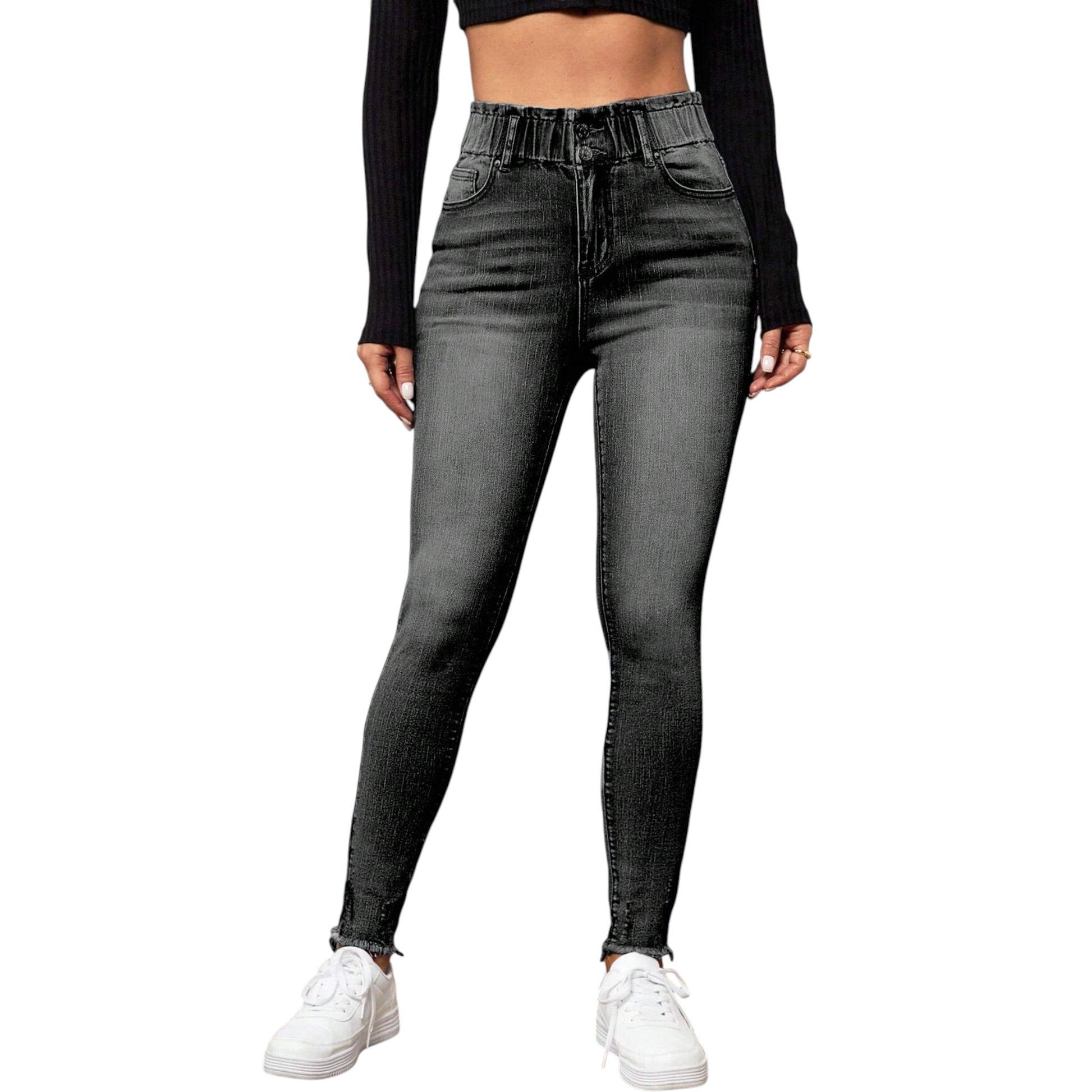 Címke nélküli, szürke, slim fit szabású, magas derekú, alján rojtos farmer nadrág.